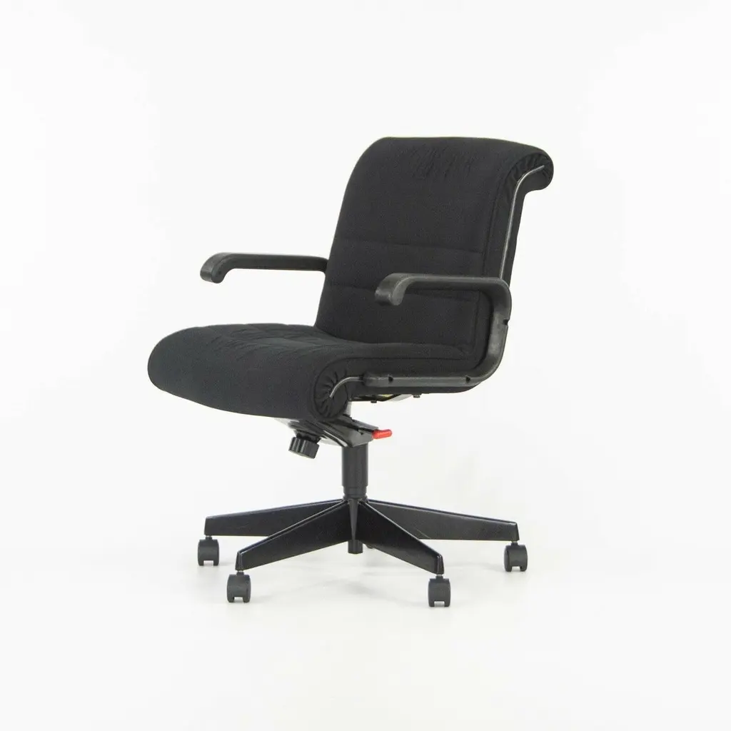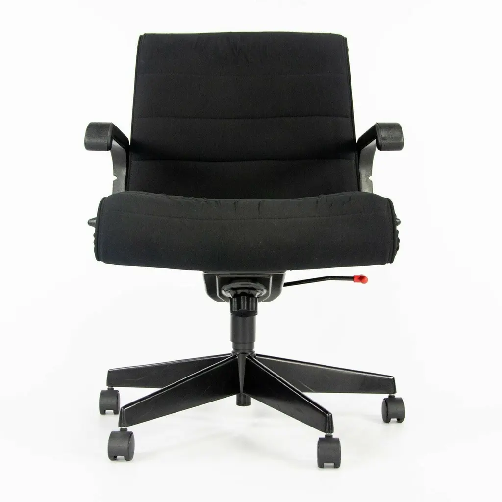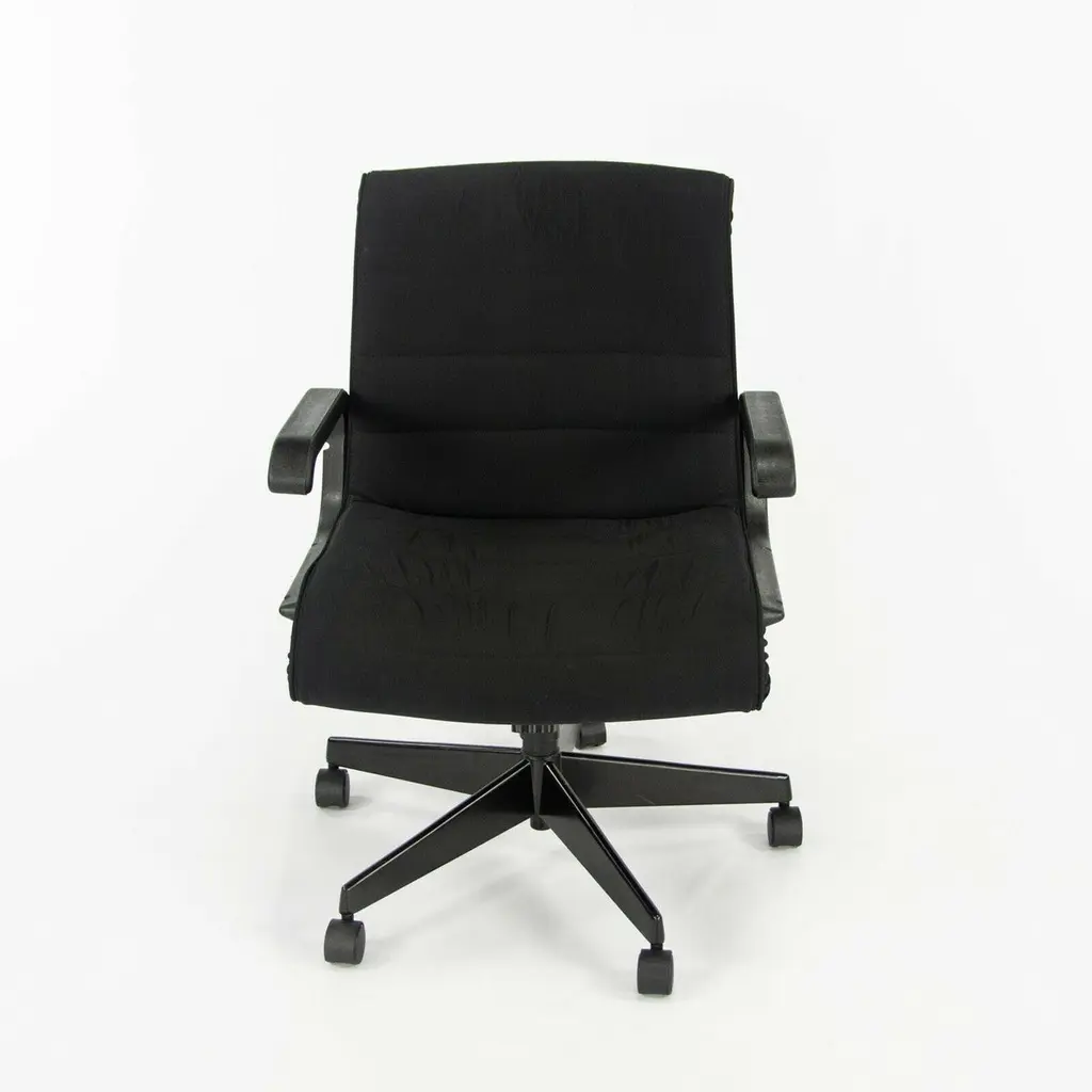 Listed for sale is a (multiple chairs are available but the price listed is for one chair) Richard Sapper for Knoll office / desk chair in black fabric with black enameled frame. This is an iconic design from the legendary industrial designer and in a less frequently seen material. The production date appears to be circa mid 1990s. Each of the chairs is in very good condition with some wear from use (see photos). The fabric shows some creases formed as shown, which have no affect on the chair comfort-wise.The chair measures 25 inches wide by 24.75 inches deep and 34-38 inches tall.