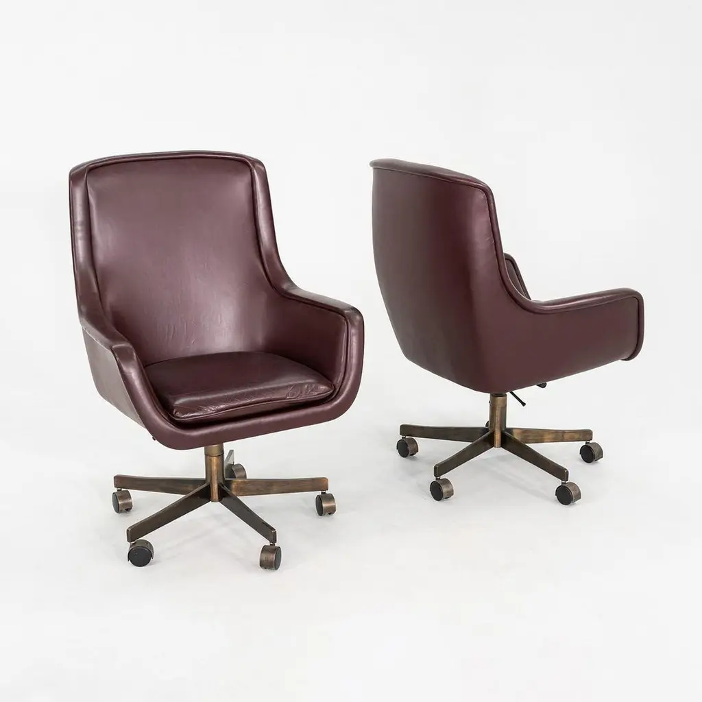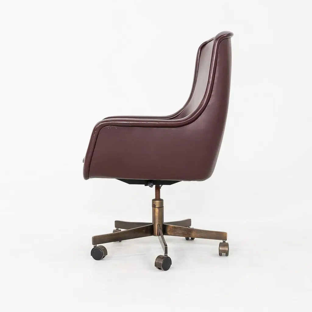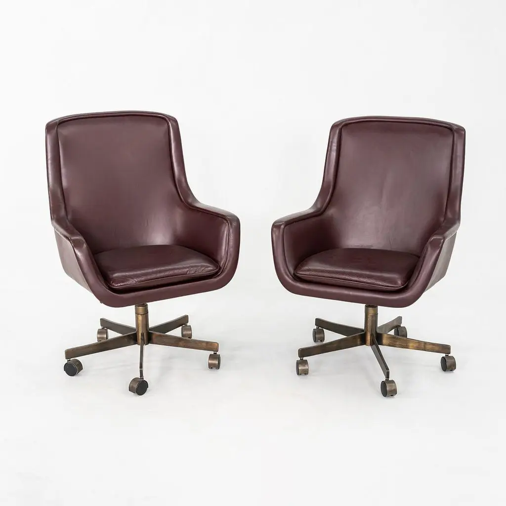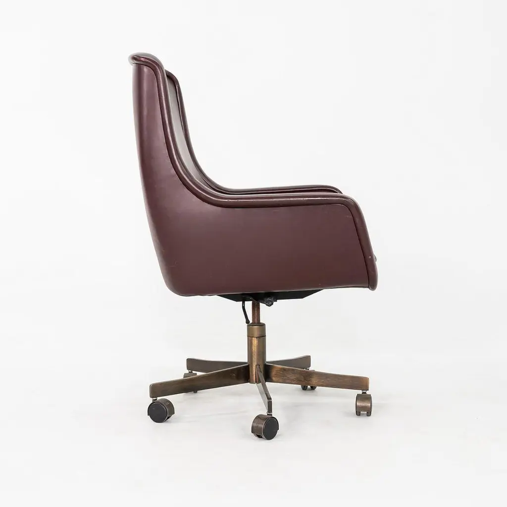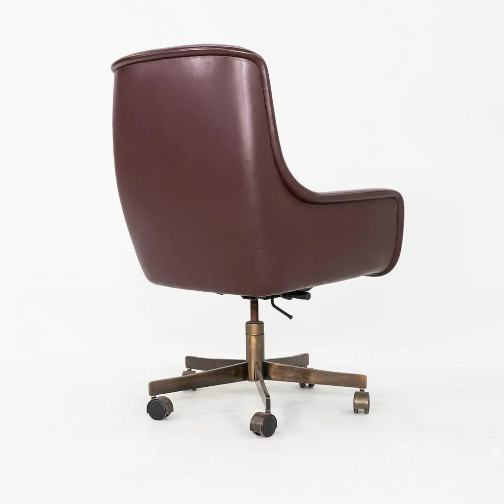 These are Executive Bumper Swivel Desk Chairs, initially designed by Ward Bennett in 1969. These were produced by Brickel Associates in 1991 and are all original. The listed price includes one chair, and we have several chairs in this colorway for purchase. They have bronzed-steel five-star bases that swivel, and their upholstery is a dark wine-hued Spinneybeck Sabrina Leather. There are tags affixed underneath the seats. This silhouette is a classic timeless example of Bennett's work. Each chair measures 26.5 inches deep, 27.5 inches wide, and 42 inches tall. They have an unadjusted seat height of 21 inches. The brushed bronze bases are heavily patinated, and the original leather upholstery has some small scuffs and a few spots. The seat cushions remain soft and pliable. Overall, these chairs are in very good vintage condition. Please see photos.