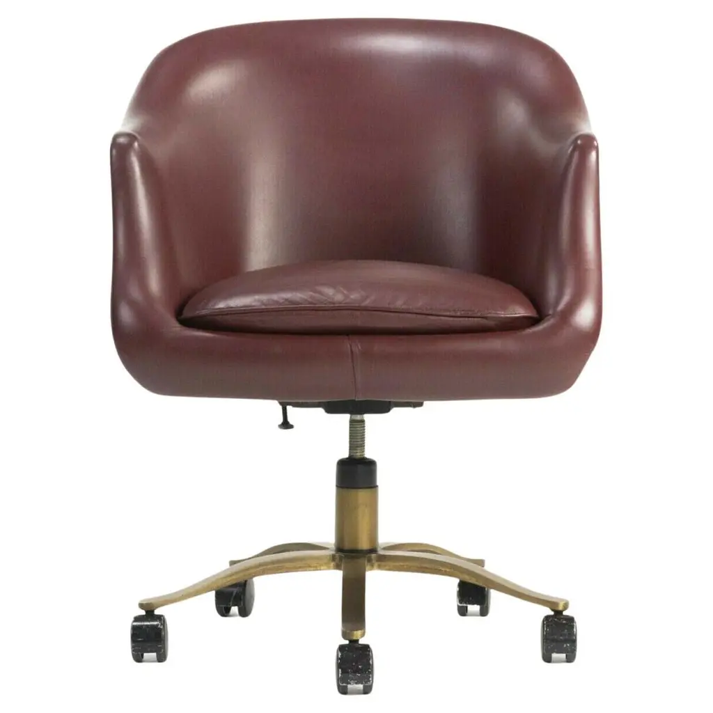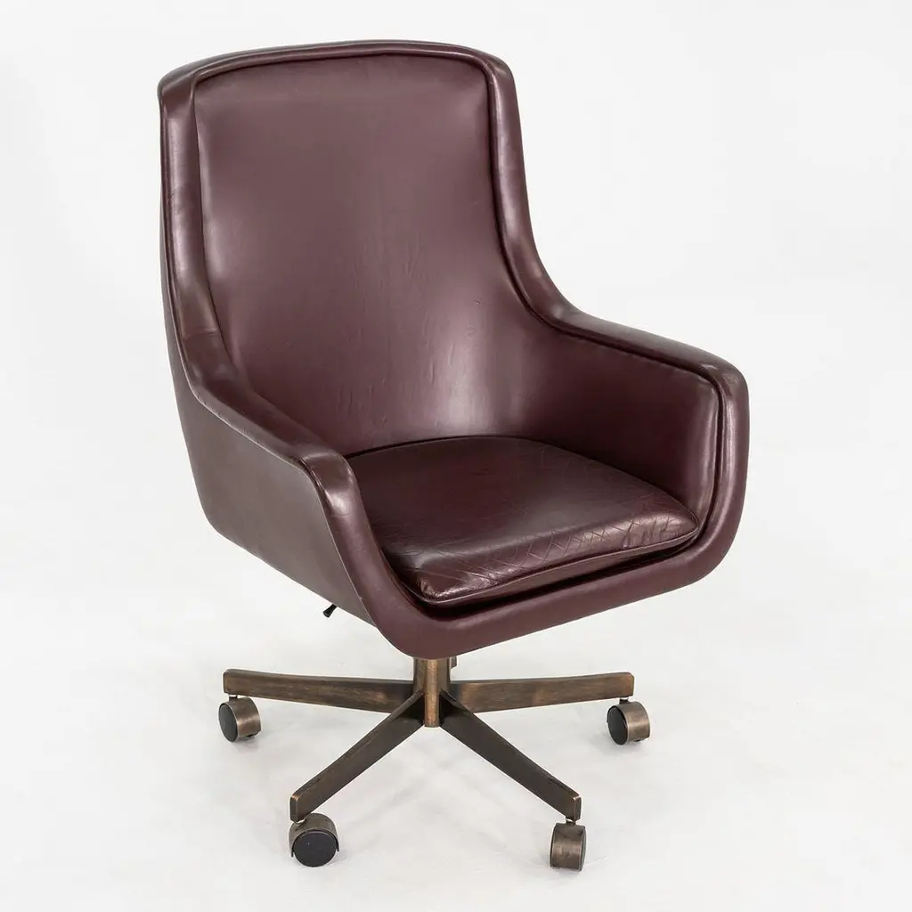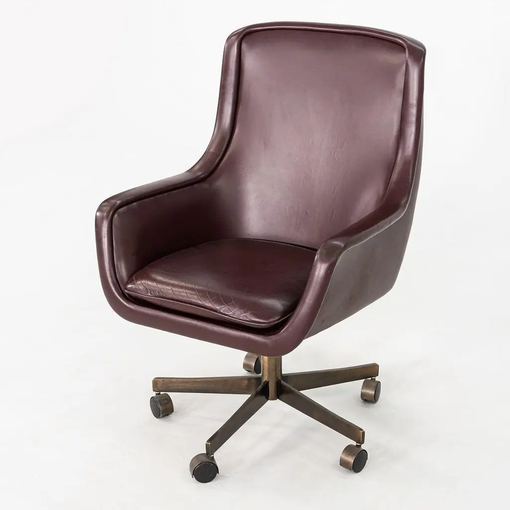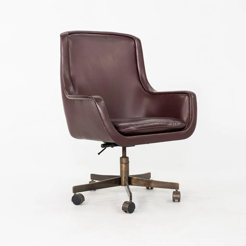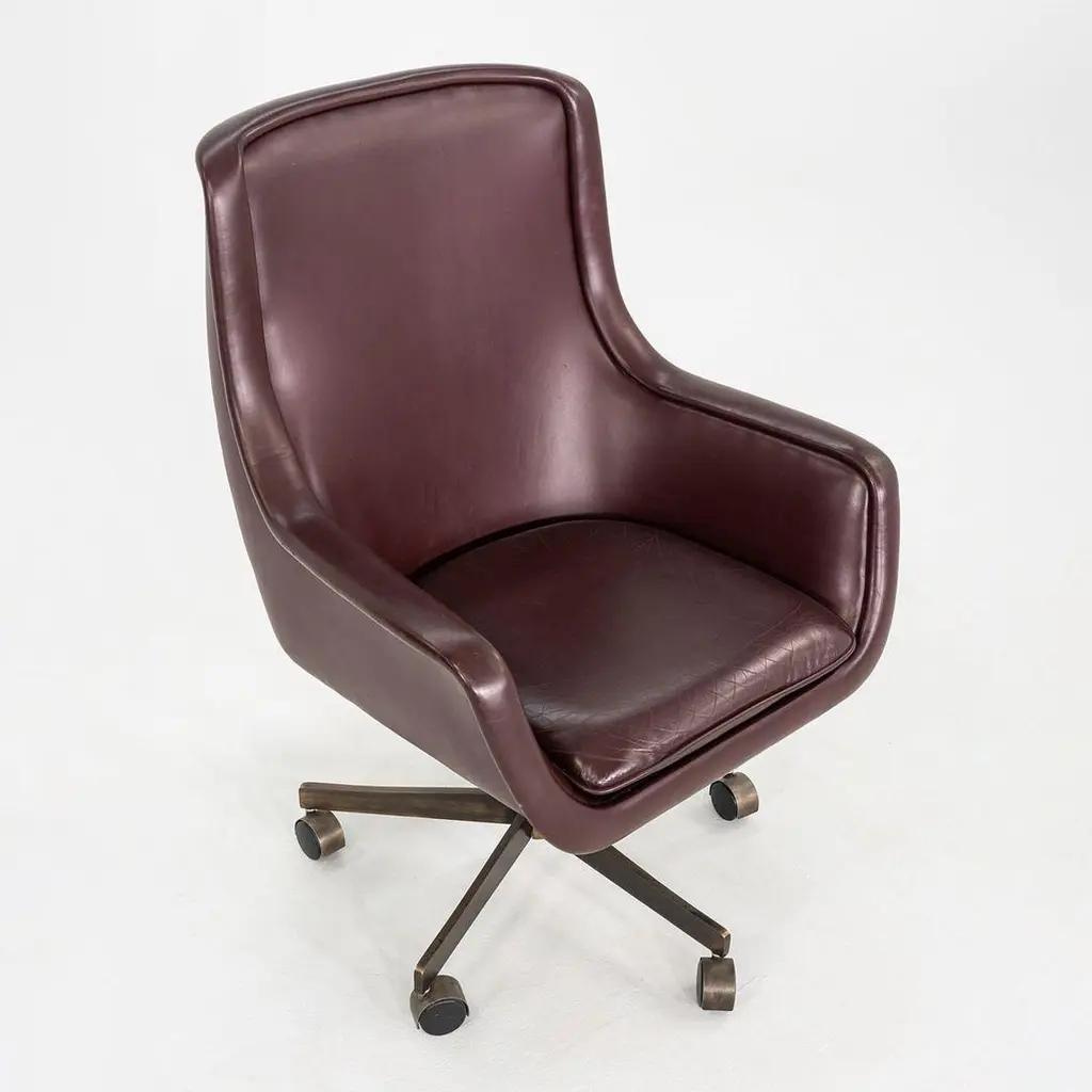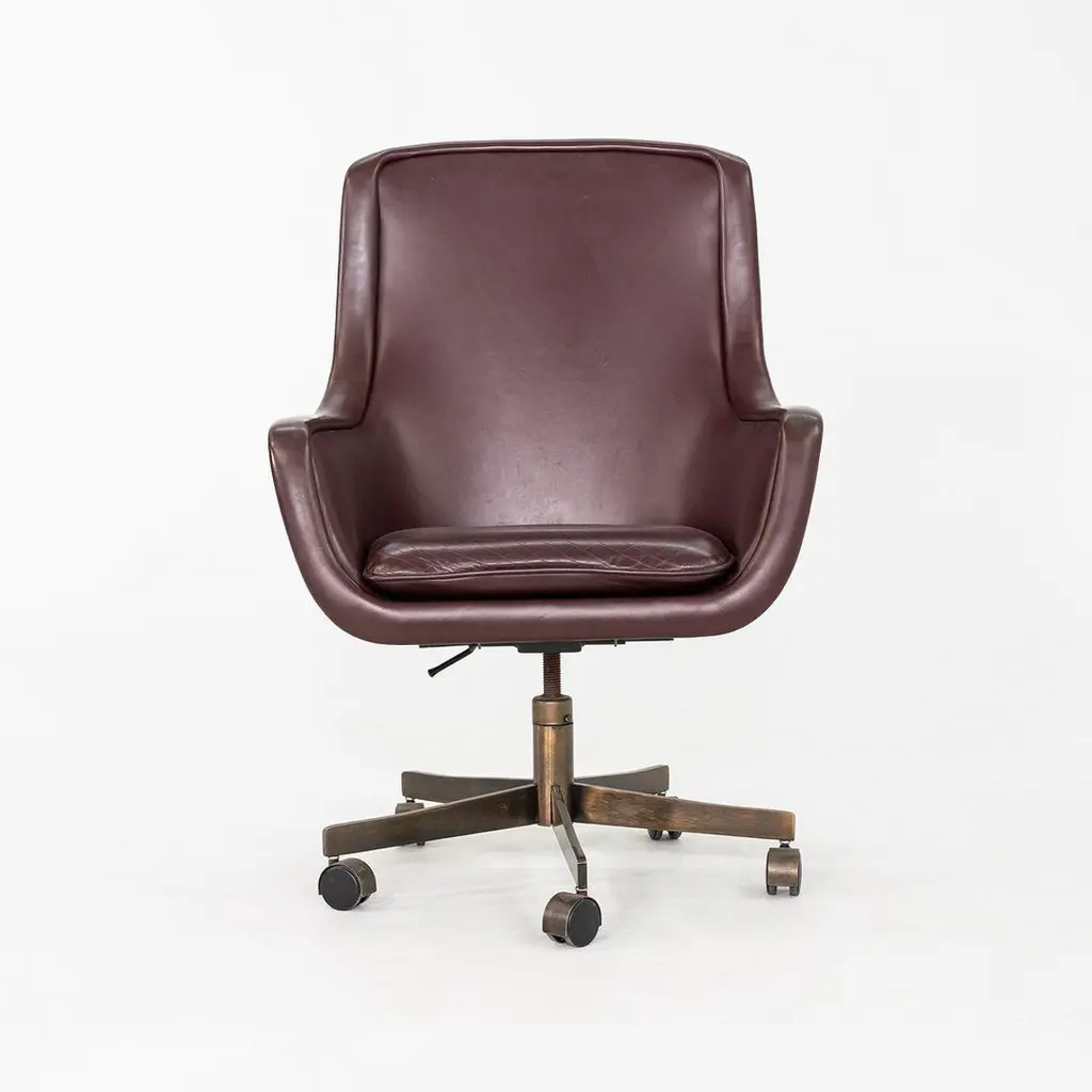 These are Executive Bumper Swivel Desk Chairs, initially designed by Ward Bennett in 1969. These were produced by Brickel Associates in 1991 and are all original. The listed price includes one chair, and we have several chairs in this colorway for purchase. They have bronzed-steel five-star bases that swivel, and their upholstery is a dark wine-hued Spinneybeck Sabrina Leather. There are tags affixed underneath the seats. This silhouette is a classic timeless example of Bennett's work. Each chair measures 26.5 inches deep, 27.5 inches wide, and 42 inches tall. They have an unadjusted seat height of 21 inches. The brushed bronze bases are heavily patinated, and the original leather upholstery has some small scuffs and a few spots. The seat cushions remain soft and pliable. Overall, these chairs are in very good vintage condition. Please see photos.