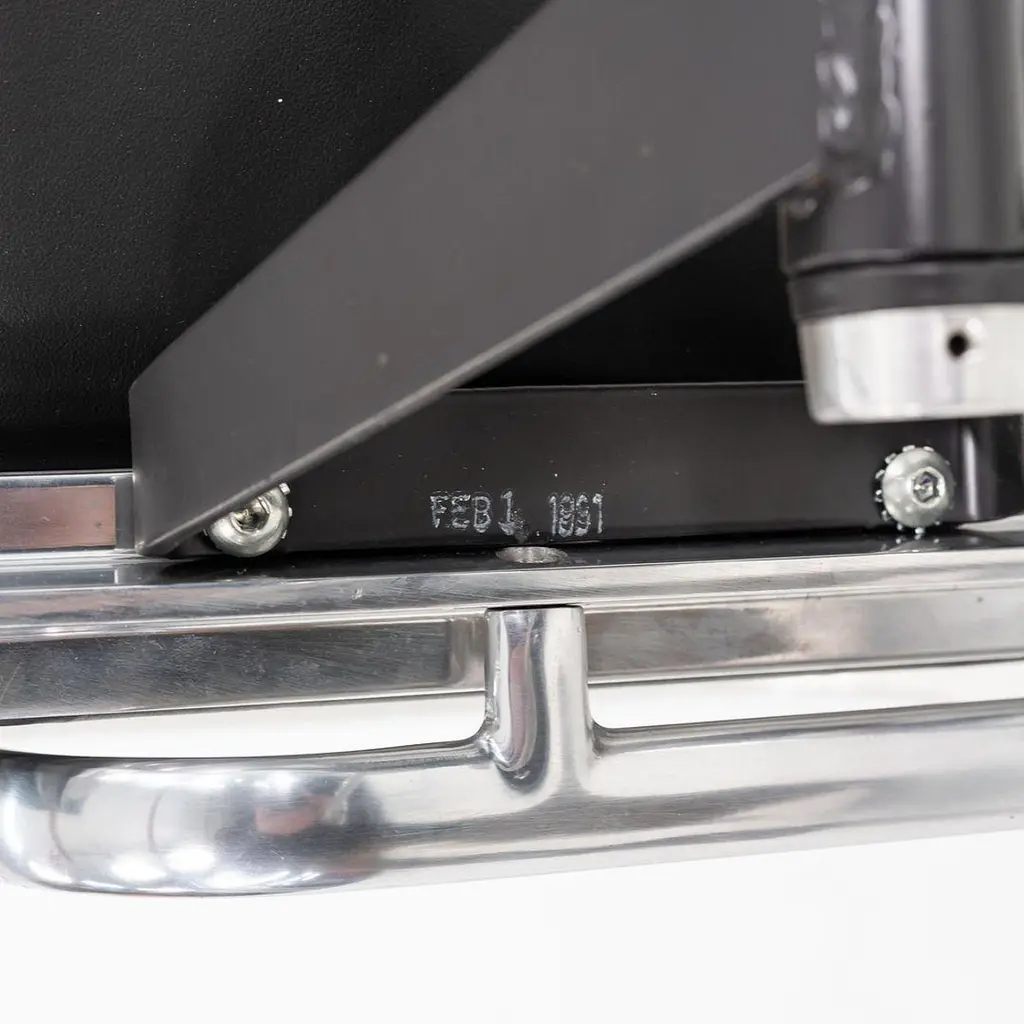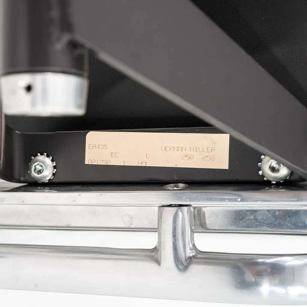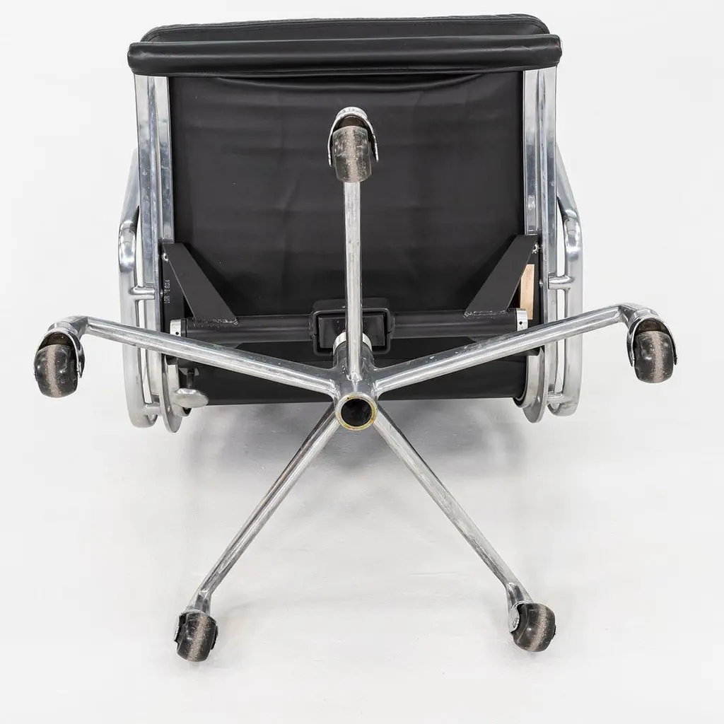 This is an Eames Aluminum Group Soft Pad Management Chair, Model EA435, initially designed by Charles and Ray Eames for Herman Miller in 1969. These particular examples date to 1992. Their design includes a solid yet lightweight aluminum frame, and the upholstery is done in a black leather. They offer a tilt feature with locking capability and have a full 360-degree swivel. These models feature a manual lift mechanism. The listed price includes one chair and there are four available to purchase. Each chair measures 24 inches deep, 22.5 inches wide, and 34 inches high with a seat height of 20.5 inches. The upholstery is in good condition, with some patination on the leather, and some minor wear on the corners. The bases and arms have some small scuffs. Overall, these chairs are in good to very good condition with some signs of wear. Please see photos.