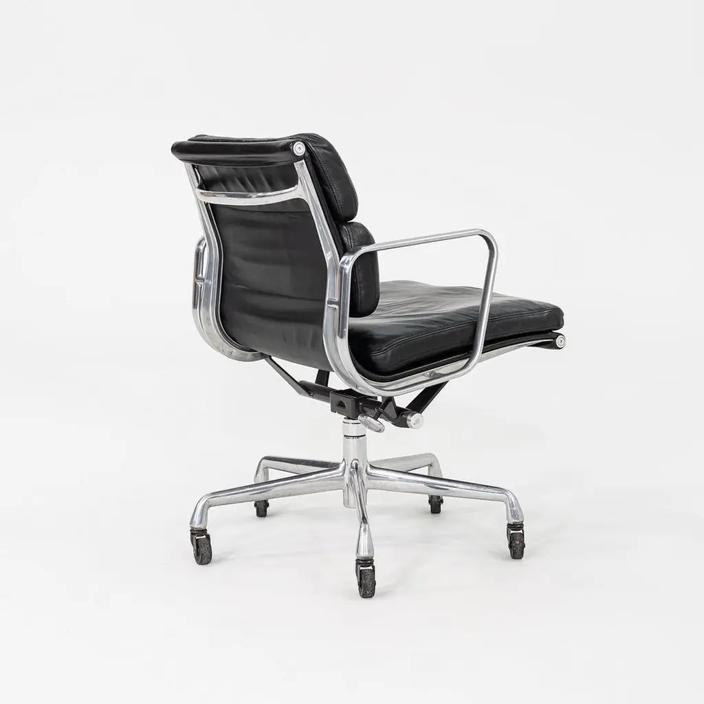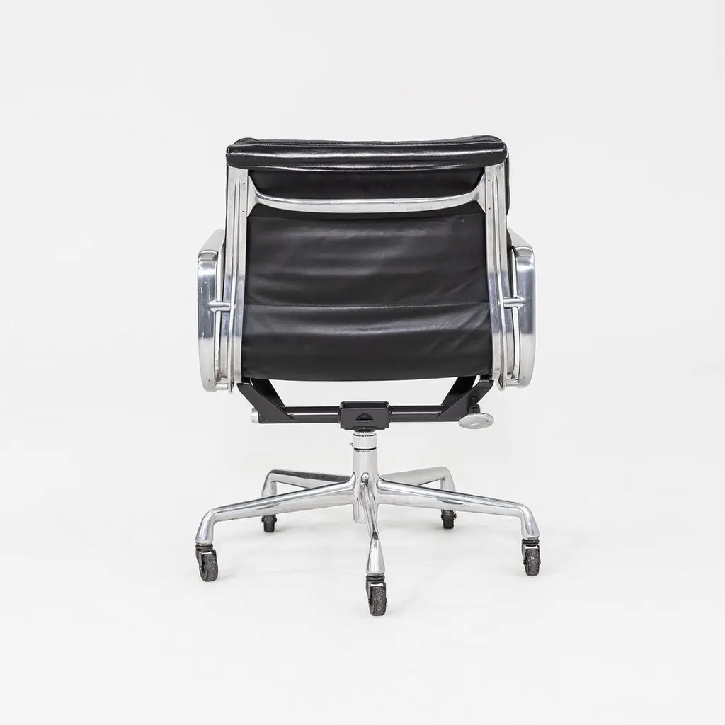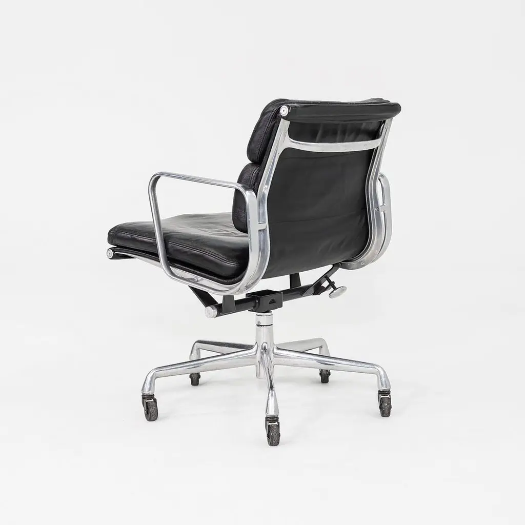 This is an Eames Aluminum Group Soft Pad Management Desk Chair, Model EA435, originally designed by Charles and Ray Eames for Herman Miller in 1969. These examples date to the year 1997. The design features a cast aluminum frame with a 5-star base on casters. The seats have plush cushions that are 2 inches thick, and they're upholstered in black leather. They have a tilt feature with locking capability, a full 360-degree swivel, and a manual lift mechanism.The listed price includes one chair and there are more than 12 available to purchase.Each chair measures 24 inches deep, 22.5 inches wide, and 34 inches high, with a seat height of 20.5 inches. The chairs do show wear consistent with previous use. There are minor scuffs and scratches on the frame and base, as well as creases in the leather. Overall these pieces are in good to very good condition. Please see photos.