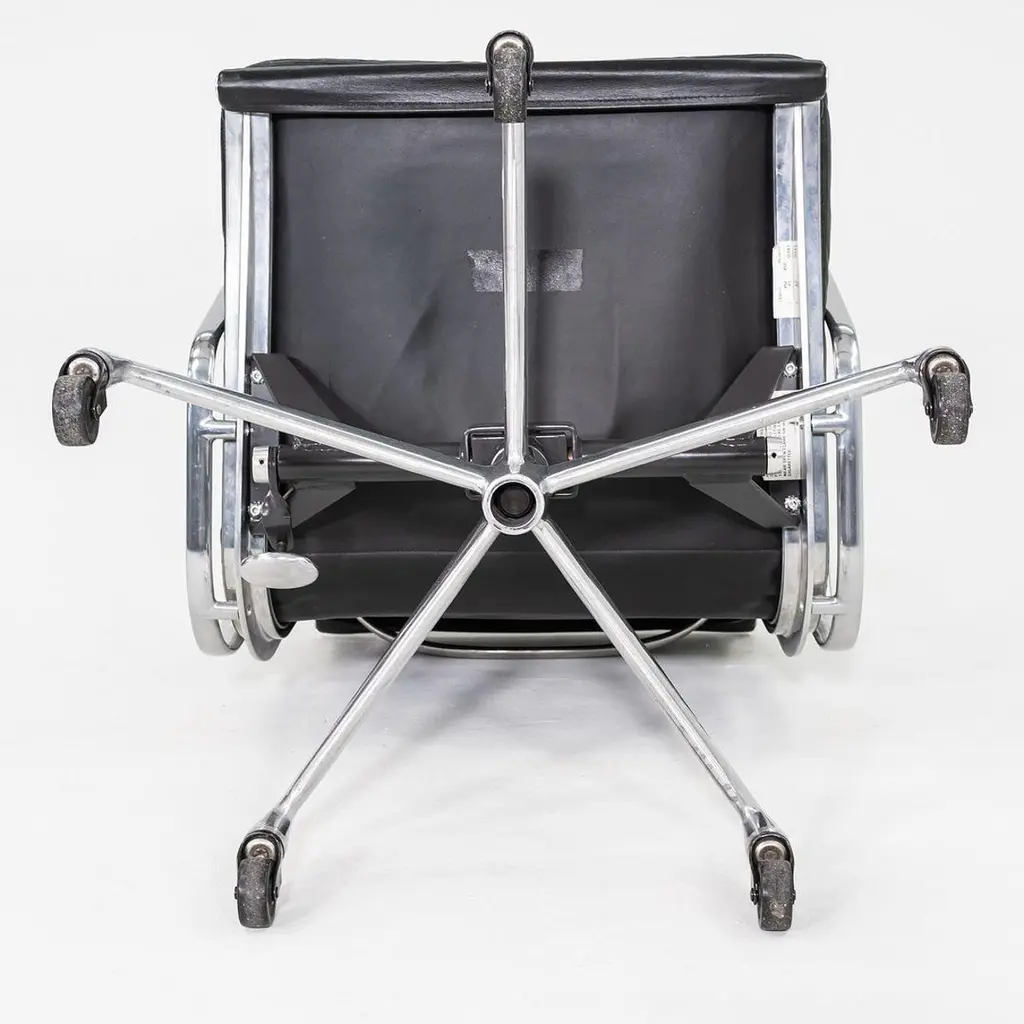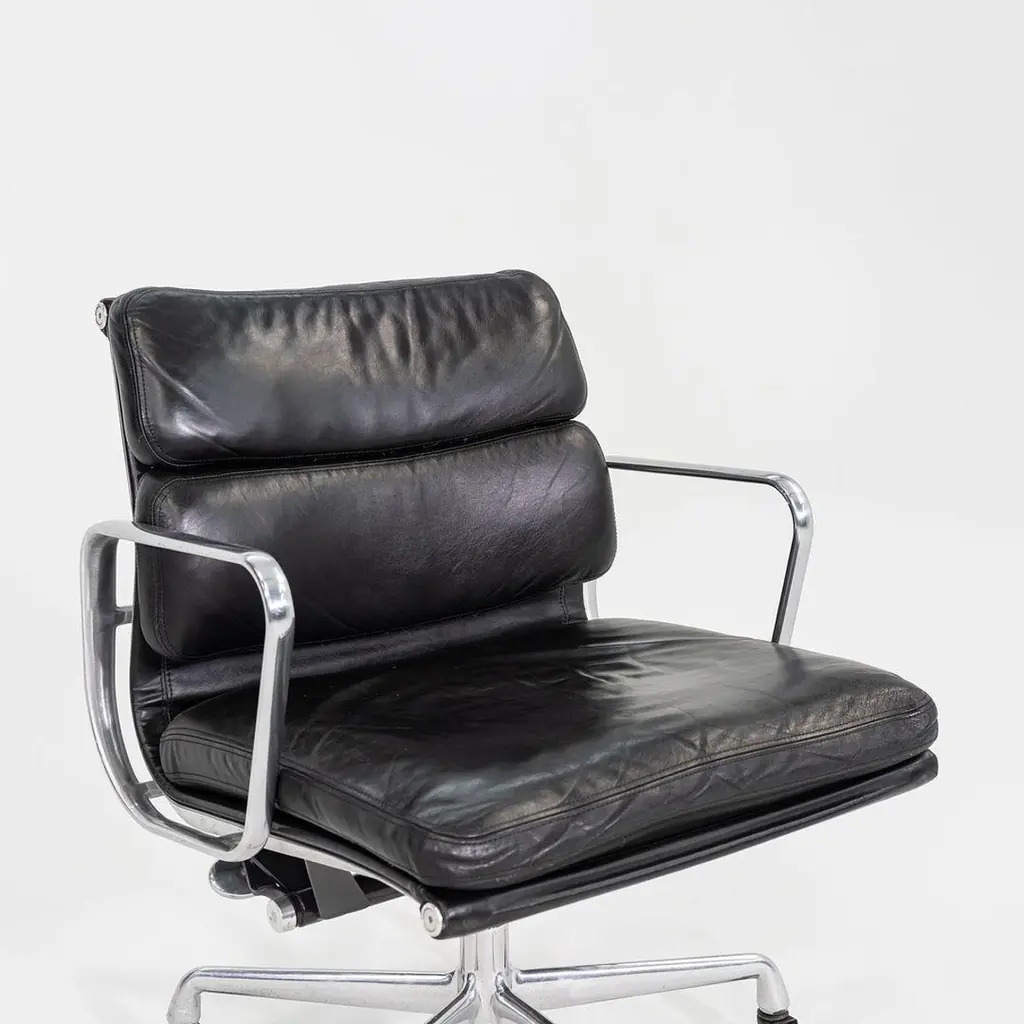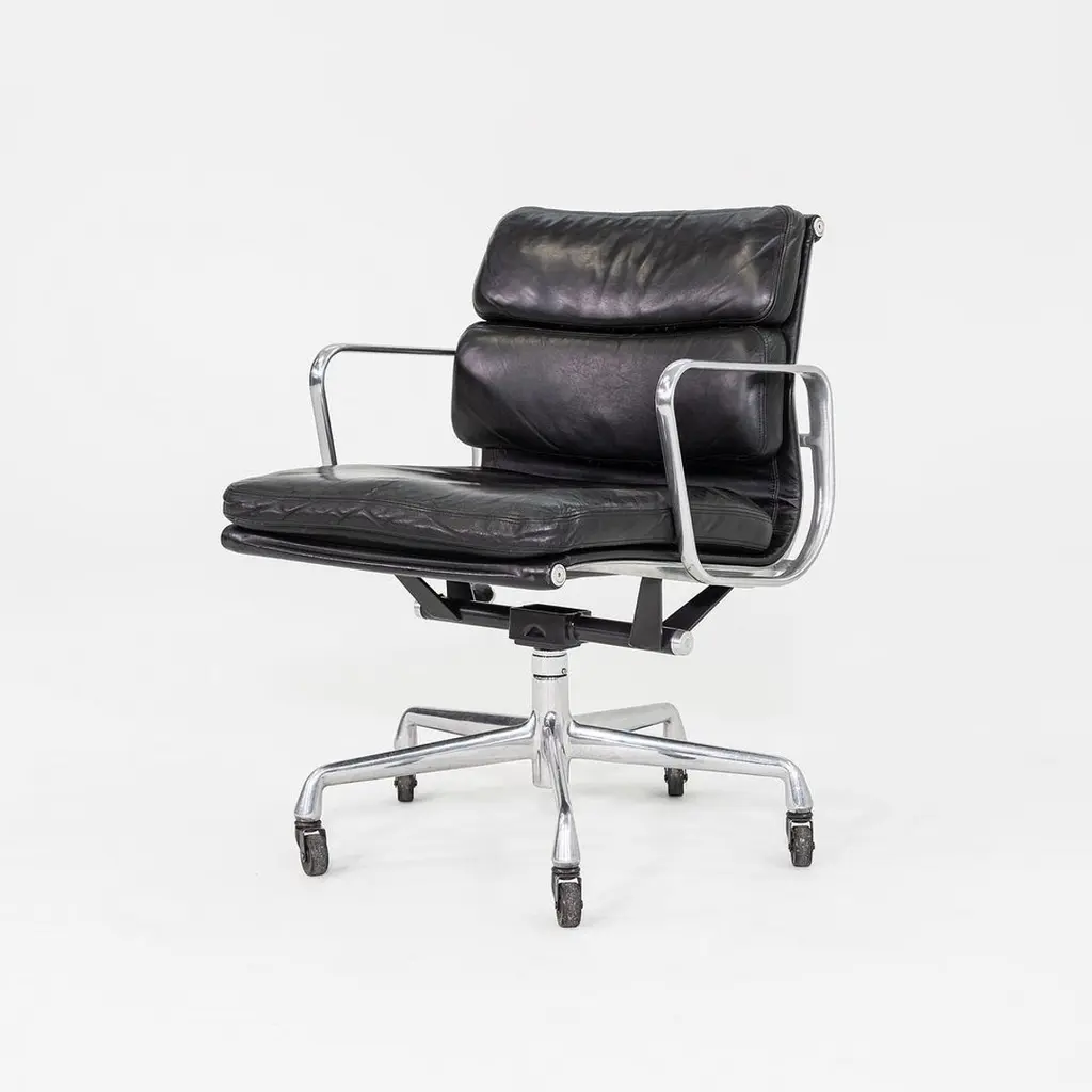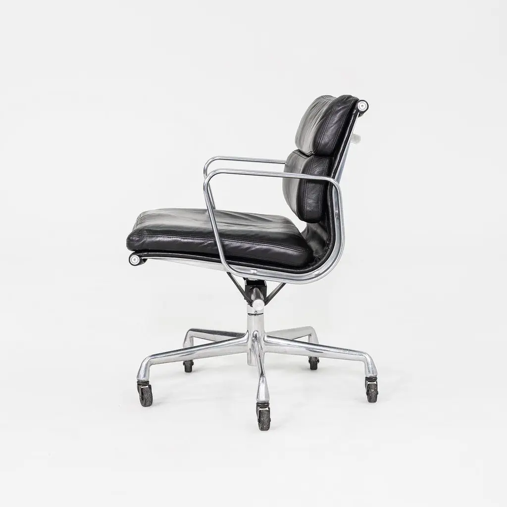 This is an Eames Aluminum Group Soft Pad Management Desk Chair, Model EA435, originally designed by Charles and Ray Eames for Herman Miller in 1969. These examples date to the year 1997. The design features a cast aluminum frame with a 5-star base on casters. The seats have plush cushions that are 2 inches thick, and they're upholstered in black leather. They have a tilt feature with locking capability, a full 360-degree swivel, and a manual lift mechanism.The listed price includes one chair and there are more than 12 available to purchase.Each chair measures 24 inches deep, 22.5 inches wide, and 34 inches high, with a seat height of 20.5 inches. The chairs do show wear consistent with previous use. There are minor scuffs and scratches on the frame and base, as well as creases in the leather. Overall these pieces are in good to very good condition. Please see photos.