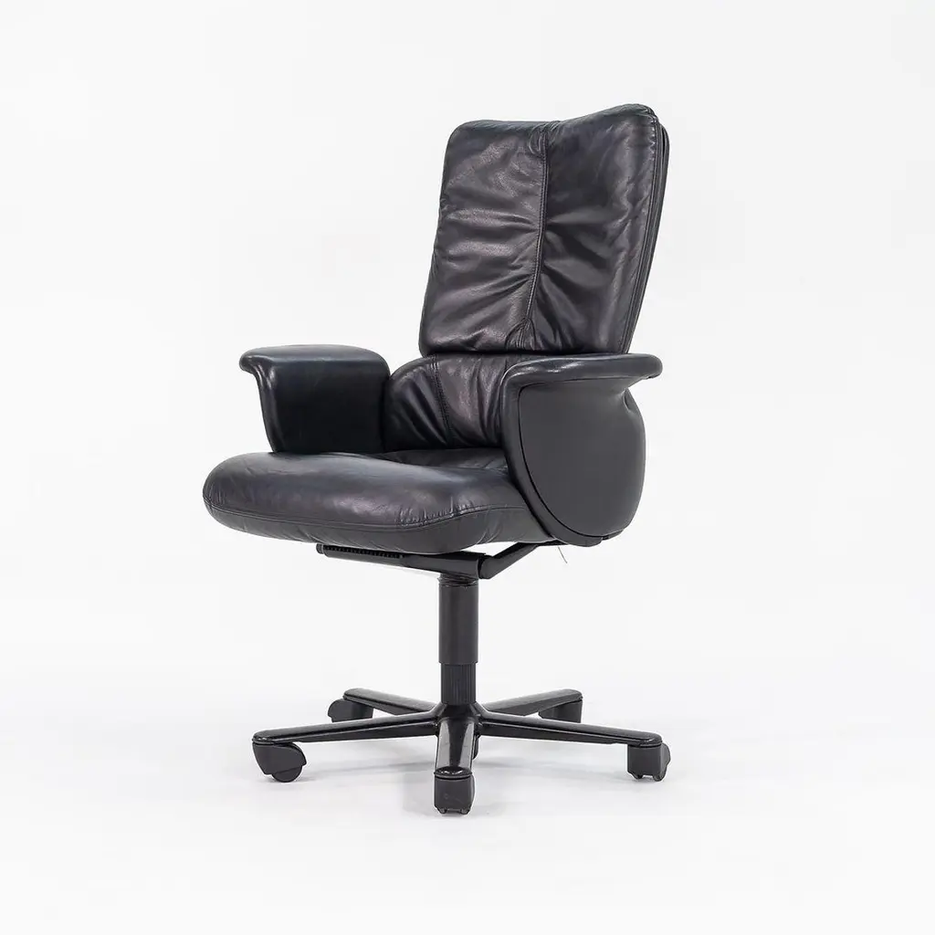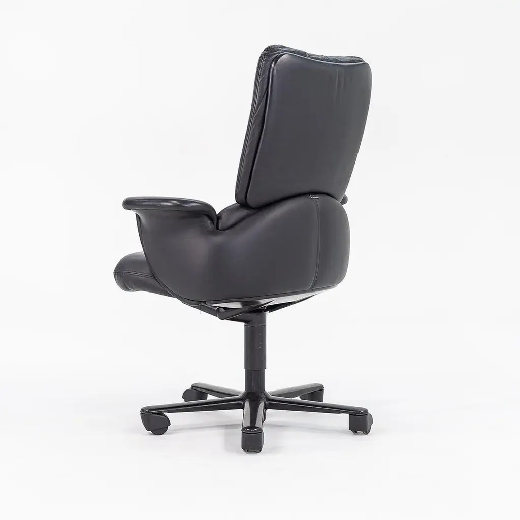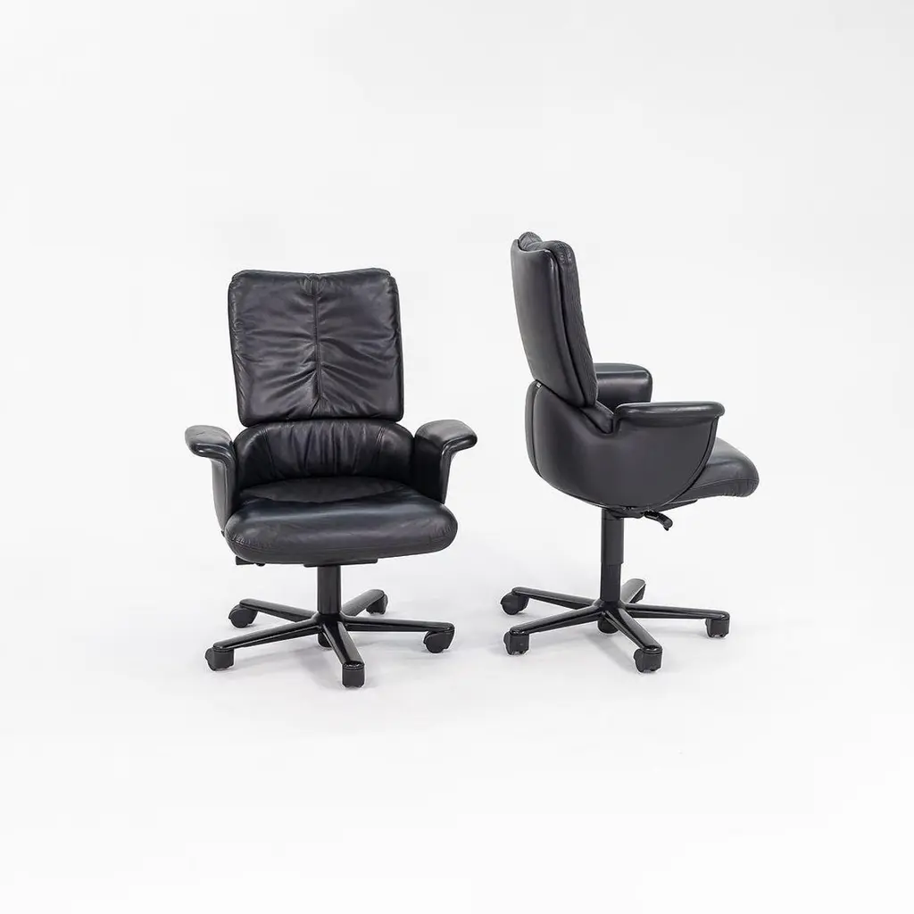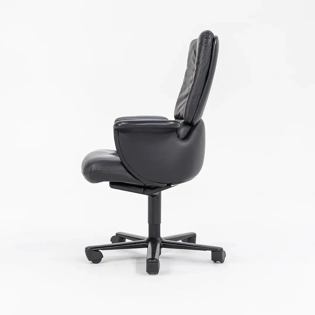 These are Hollington Executive Office Chairs, initially designed by Geoff Hollington for Herman Miller in 1989. These examples date to 1998, and the listed price includes one chair. We have several of these pieces available for purchase. The design features a black leather seat and back that has waterfall edges and has an enameled 5-point base that offers a full swivel function. It has a lift mechanism as well as casters. Hollington had intended for there to be ease of motion when designing this chair, foremost considering the comfort of the user. Each chair measures 31 inches deep, 30.25 inches wide, and is height adjustable between 40-46 inches. The seat height ranges from 17-22 inches. The seat width measures 23 inches, and the seat depth is 18.25 inches. The chairs have a similar amount of wear apparent. There are several scratches on the armrests and the seats, and there are also scratches on the bases. The leather is soft and in good condition. Overall, these chairs are in very good vintage condition with signs of use. Please see photos. Genuinely faulty goods will be replaced or money refunded on a case by case basis, however we must be advised of any faulty goods upon receipt of the item. It is the customer's responsibility to pay for return shipping and ship the item back to us. If the item is found to be faulty, we will also refund the postage cost. If there is no damage to the item, but a return is approved, the buyer will be responsible for both the initial and return shipping cost. It is at our discretion to refuse the refund of undamaged goods. If an order is placed and you would like to cancel the order, please notify us immediately. Any refunds will be processed via the same means that payment was made.
