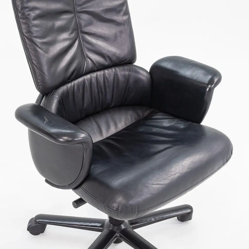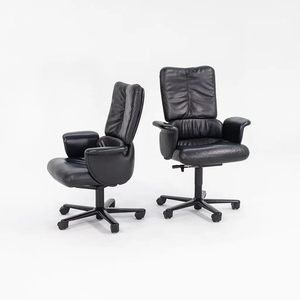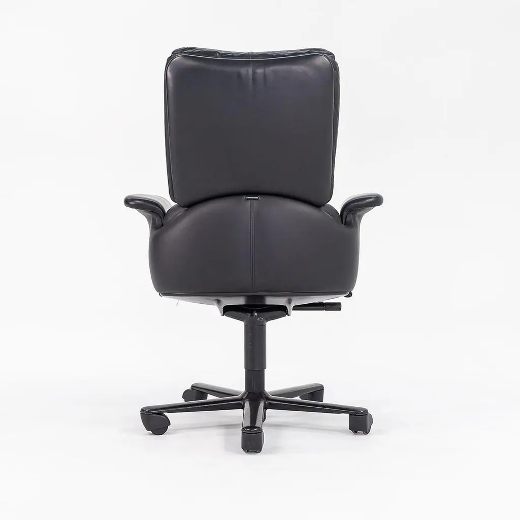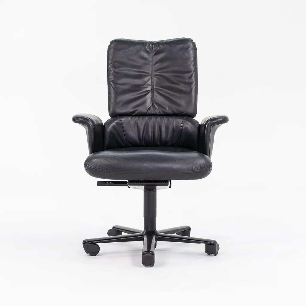 These are Hollington Executive Office Chairs, initially designed by Geoff Hollington for Herman Miller in 1989. These examples date to 1998, and the listed price includes one chair. We have several of these pieces available for purchase. The design features a black leather seat and back that has waterfall edges and has an enameled 5-point base that offers a full swivel function. It has a lift mechanism as well as casters. Hollington had intended for there to be ease of motion when designing this chair, foremost considering the comfort of the user. Each chair measures 31 inches deep, 30.25 inches wide, and is height adjustable between 40-46 inches. The seat height ranges from 17-22 inches. The seat width measures 23 inches, and the seat depth is 18.25 inches. The chairs have a similar amount of wear apparent. There are several scratches on the armrests and the seats, and there are also scratches on the bases. The leather is soft and in good condition. Overall, these chairs are in very good vintage condition with signs of use. Please see photos. Genuinely faulty goods will be replaced or money refunded on a case by case basis, however we must be advised of any faulty goods upon receipt of the item. It is the customer's responsibility to pay for return shipping and ship the item back to us. If the item is found to be faulty, we will also refund the postage cost. If there is no damage to the item, but a return is approved, the buyer will be responsible for both the initial and return shipping cost. It is at our discretion to refuse the refund of undamaged goods. If an order is placed and you would like to cancel the order, please notify us immediately. Any refunds will be processed via the same means that payment was made.
