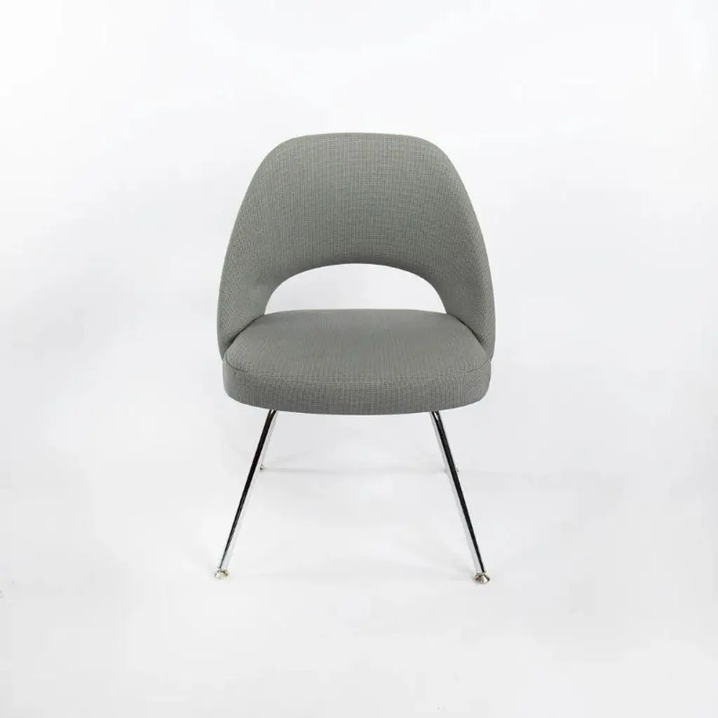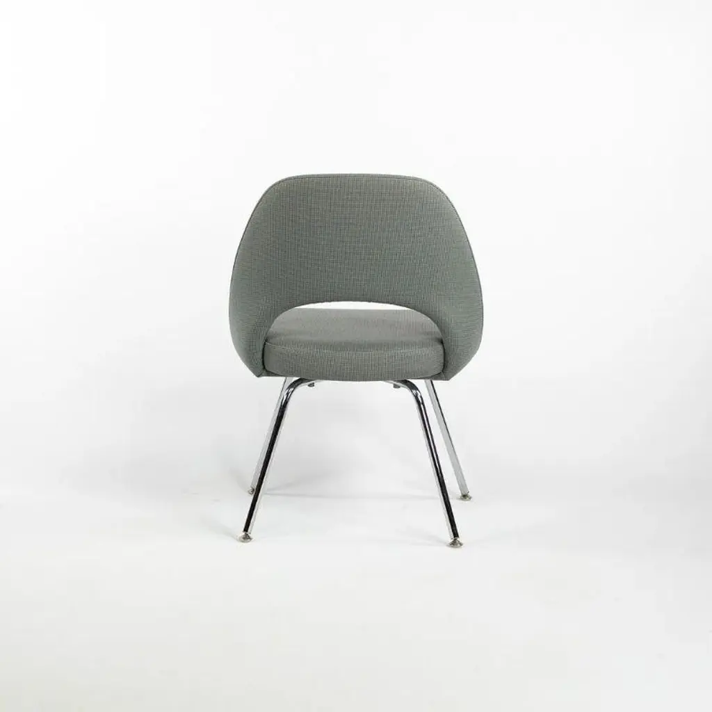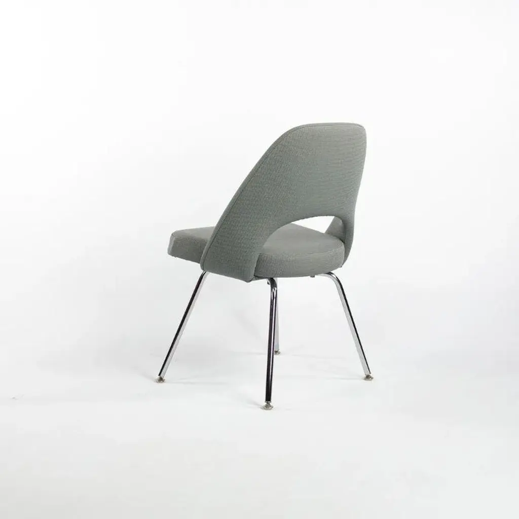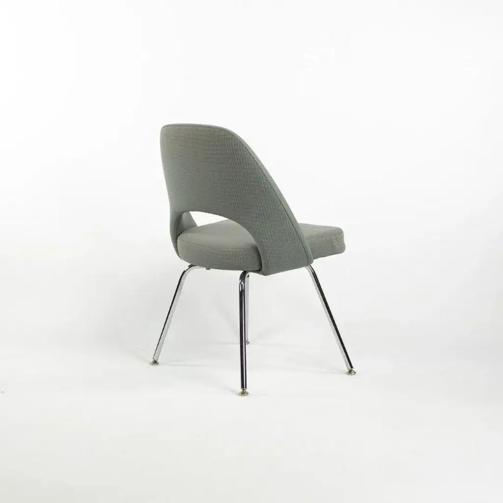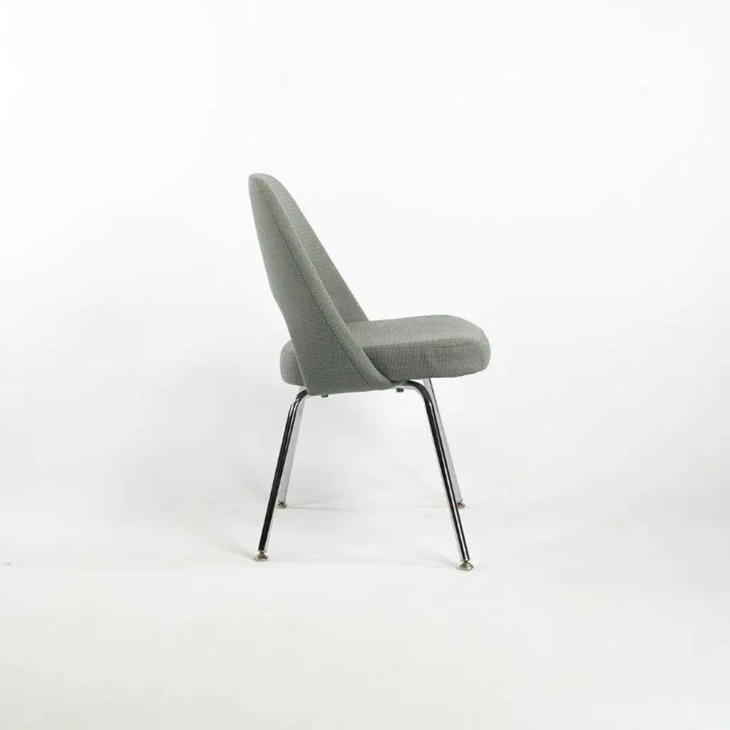 This is a Saarinen Armless Executive Chair, model 72, designed by Eero Saarinen for Knoll International in 1950. This particular example was produced in the USA in the 2000s. The listed price includes one chair, and we have several available for purchase. The chairs feature an upholstered seat and back in a blue-grey fabric, and the legs are formed of chromed tubular steel. Each chair measures 20.5 inches long, 22.5 inches wide, and 31.5 inches high. They have a seat height of 18.75 inches. The frames shine brightly, but may show an errant insignificant scrape or scratch. The fabric is in good condition but may have a few small spots. Overall, these examples are in very good condition with light wear. Please see photos.