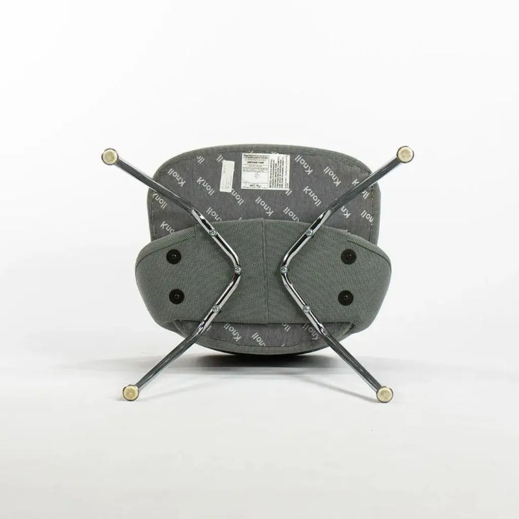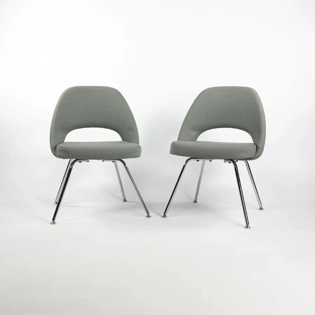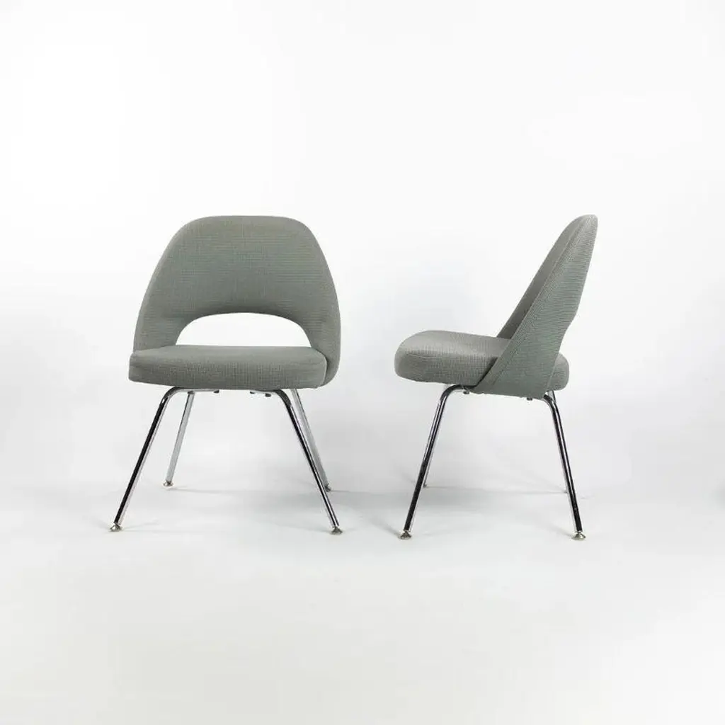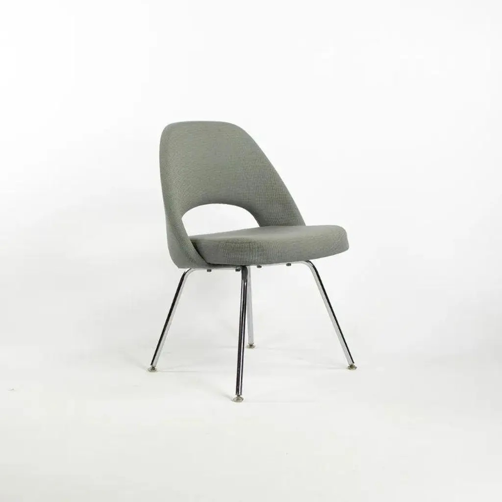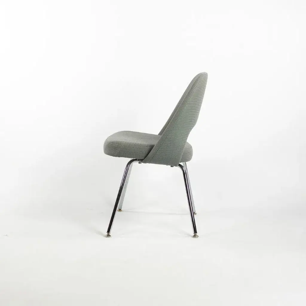 This is a Saarinen Armless Executive Chair, model 72, designed by Eero Saarinen for Knoll International in 1950. This particular example was produced in the USA in the 2000s. The listed price includes one chair, and we have several available for purchase. The chairs feature an upholstered seat and back in a blue-grey fabric, and the legs are formed of chromed tubular steel. Each chair measures 20.5 inches long, 22.5 inches wide, and 31.5 inches high. They have a seat height of 18.75 inches. The frames shine brightly, but may show an errant insignificant scrape or scratch. The fabric is in good condition but may have a few small spots. Overall, these examples are in very good condition with light wear. Please see photos.