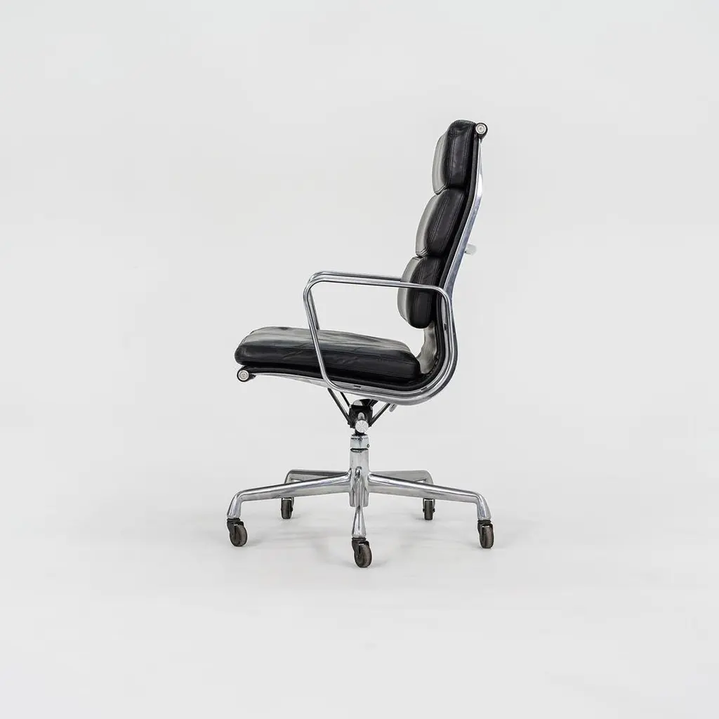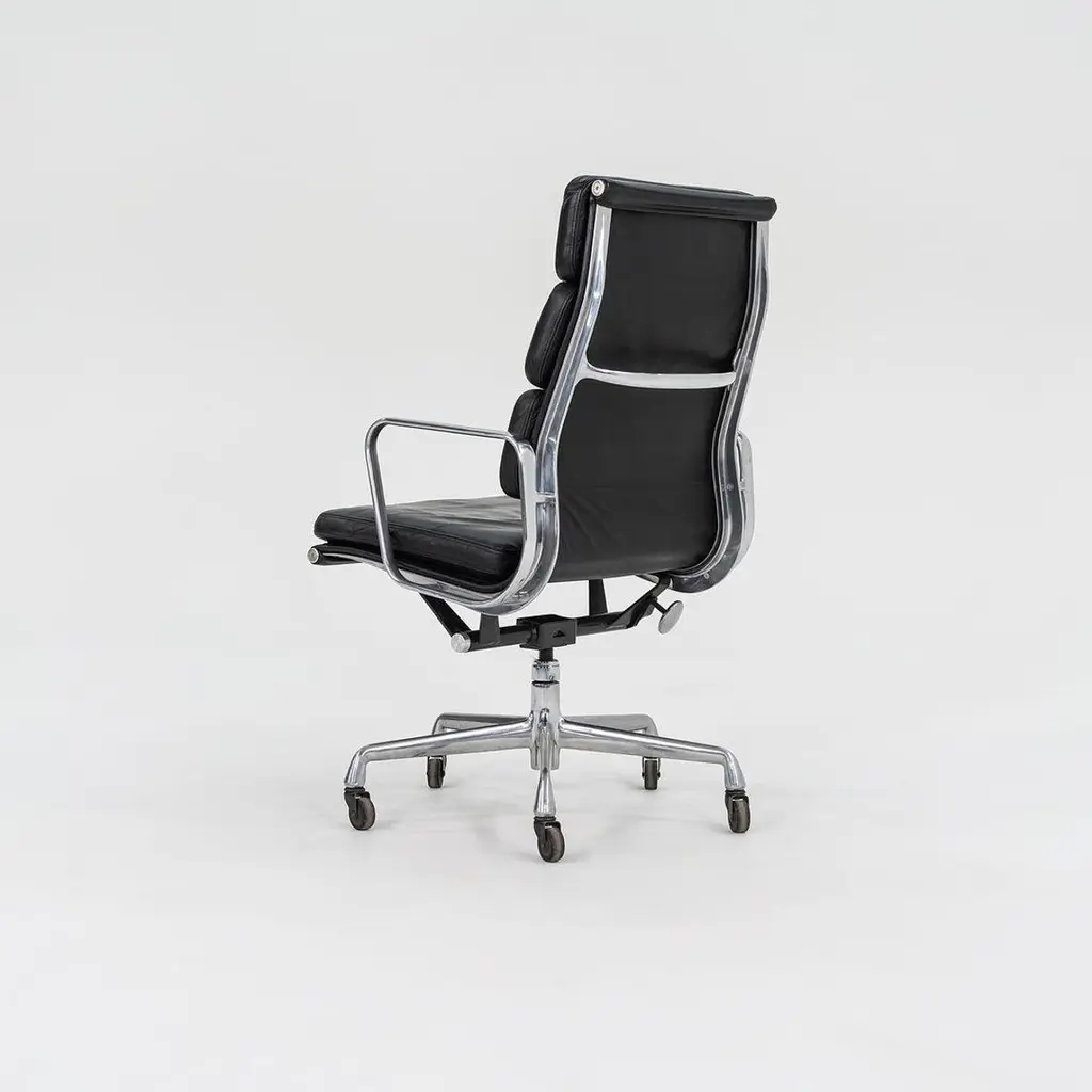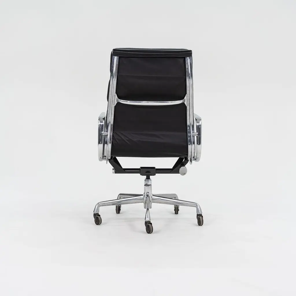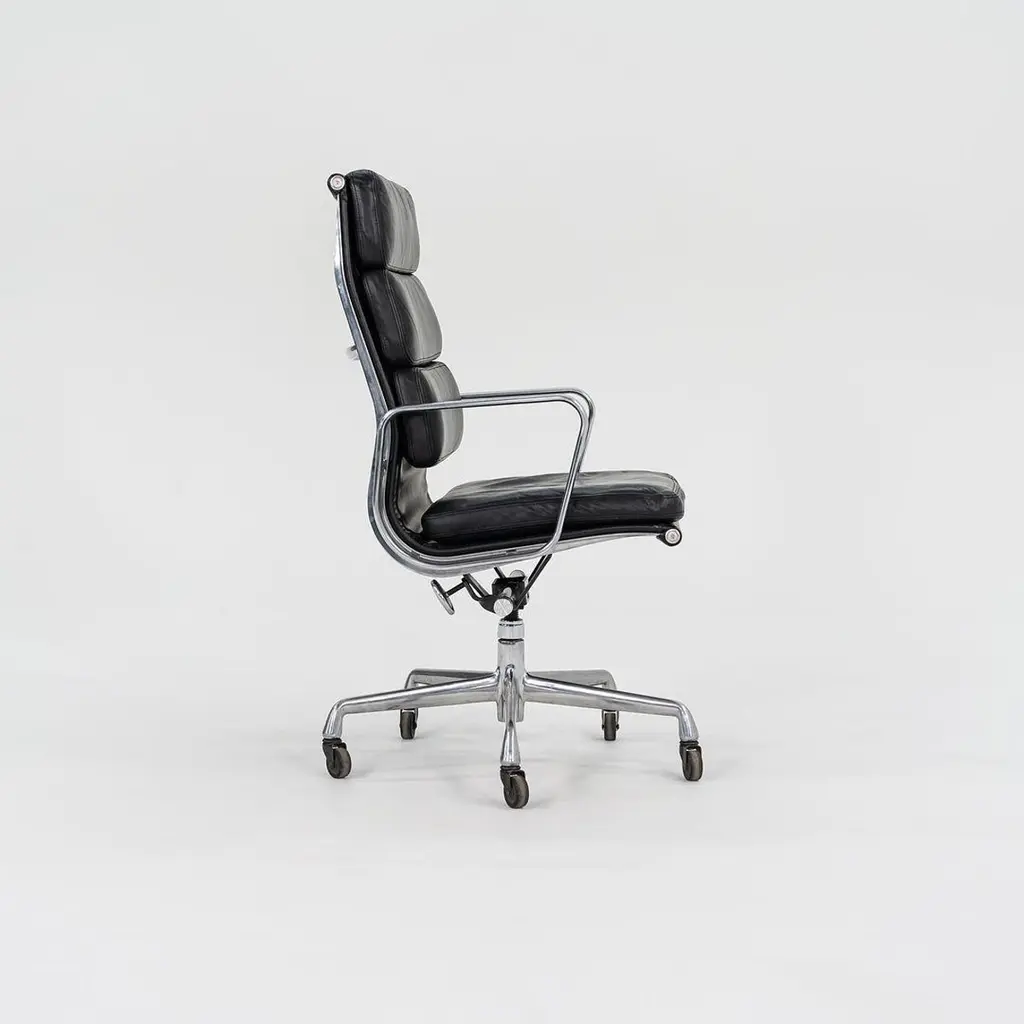 This is an Eames Aluminum Group Soft Pad Executive Chair, Model EA437, initially designed by Charles and Ray Eames for Herman Miller in 1968. These examples date to 2002. The listed price includes one chair, and we have several available for purchase. Their design features a die-cast aluminum frame with an adjustable five-star base and has thick black leather upholstery. The seats and backs have plush cushions that are 2 inches thick, ensuring a comfortable seating situation. Each chair measures 23 inches deep, 23 inches wide, and is 40.25 inches high. They have a minimum seat height of 19.25 inches that is adjustable to 22.5 inches, and they have a seat depth of 16.5 inches. The leather on all of these examples is in very good condition with some patina present, and the bases and frames show some normal wear from use. The arms are in terrific shape. Overall, these chairs are in very good condition with some signs of use. Please see photos. Genuinely faulty goods will be replaced or money refunded on a case by case basis, however we must be advised of any faulty goods upon receipt of the item. It is the customer's responsibility to pay for return shipping and ship the item back to us. If the item is found to be faulty, we will also refund the postage cost. If there is no damage to the item, but a return is approved, the buyer will be responsible for both the initial and return shipping cost. It is at our discretion to refuse the refund of undamaged goods. If an order is placed and you would like to cancel the order, please notify us immediately. Any refunds will be processed via the same means that payment was made.
