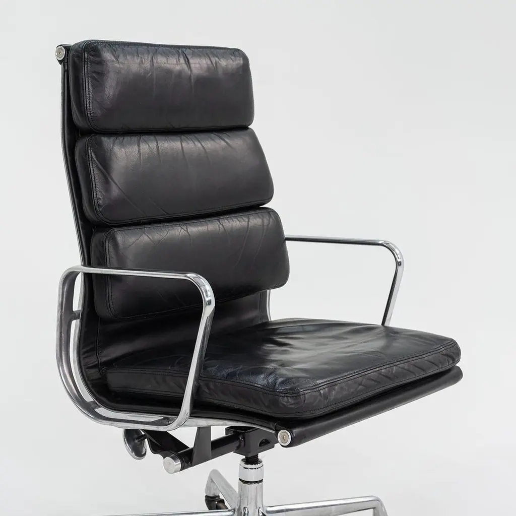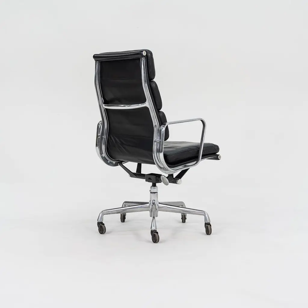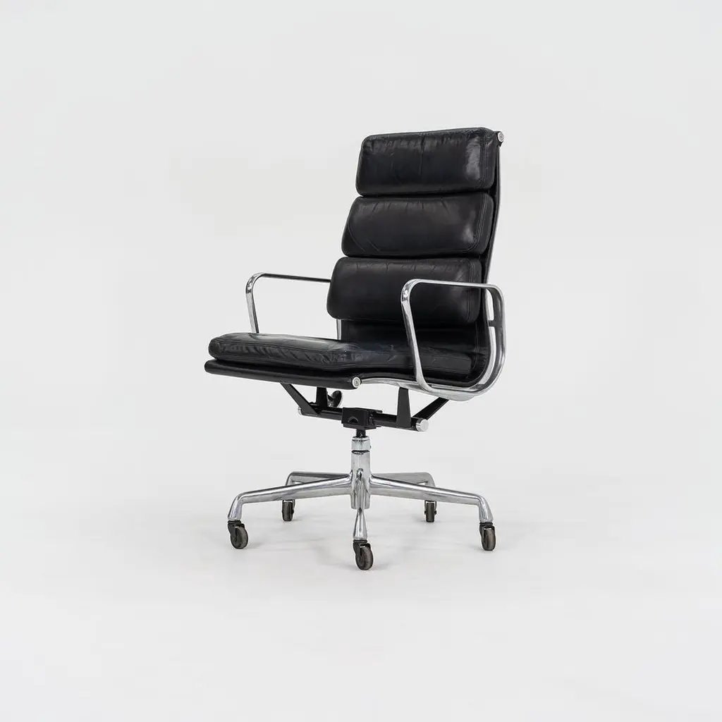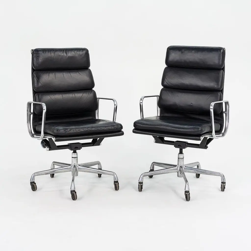 This is an Eames Aluminum Group Soft Pad Executive Chair, Model EA437, initially designed by Charles and Ray Eames for Herman Miller in 1968. These examples date to 2002. The listed price includes one chair, and we have several available for purchase. Their design features a die-cast aluminum frame with an adjustable five-star base and has thick black leather upholstery. The seats and backs have plush cushions that are 2 inches thick, ensuring a comfortable seating situation. Each chair measures 23 inches deep, 23 inches wide, and is 40.25 inches high. They have a minimum seat height of 19.25 inches that is adjustable to 22.5 inches, and they have a seat depth of 16.5 inches. The leather on all of these examples is in very good condition with some patina present, and the bases and frames show some normal wear from use. The arms are in terrific shape. Overall, these chairs are in very good condition with some signs of use. Please see photos. Genuinely faulty goods will be replaced or money refunded on a case by case basis, however we must be advised of any faulty goods upon receipt of the item. It is the customer's responsibility to pay for return shipping and ship the item back to us. If the item is found to be faulty, we will also refund the postage cost. If there is no damage to the item, but a return is approved, the buyer will be responsible for both the initial and return shipping cost. It is at our discretion to refuse the refund of undamaged goods. If an order is placed and you would like to cancel the order, please notify us immediately. Any refunds will be processed via the same means that payment was made.