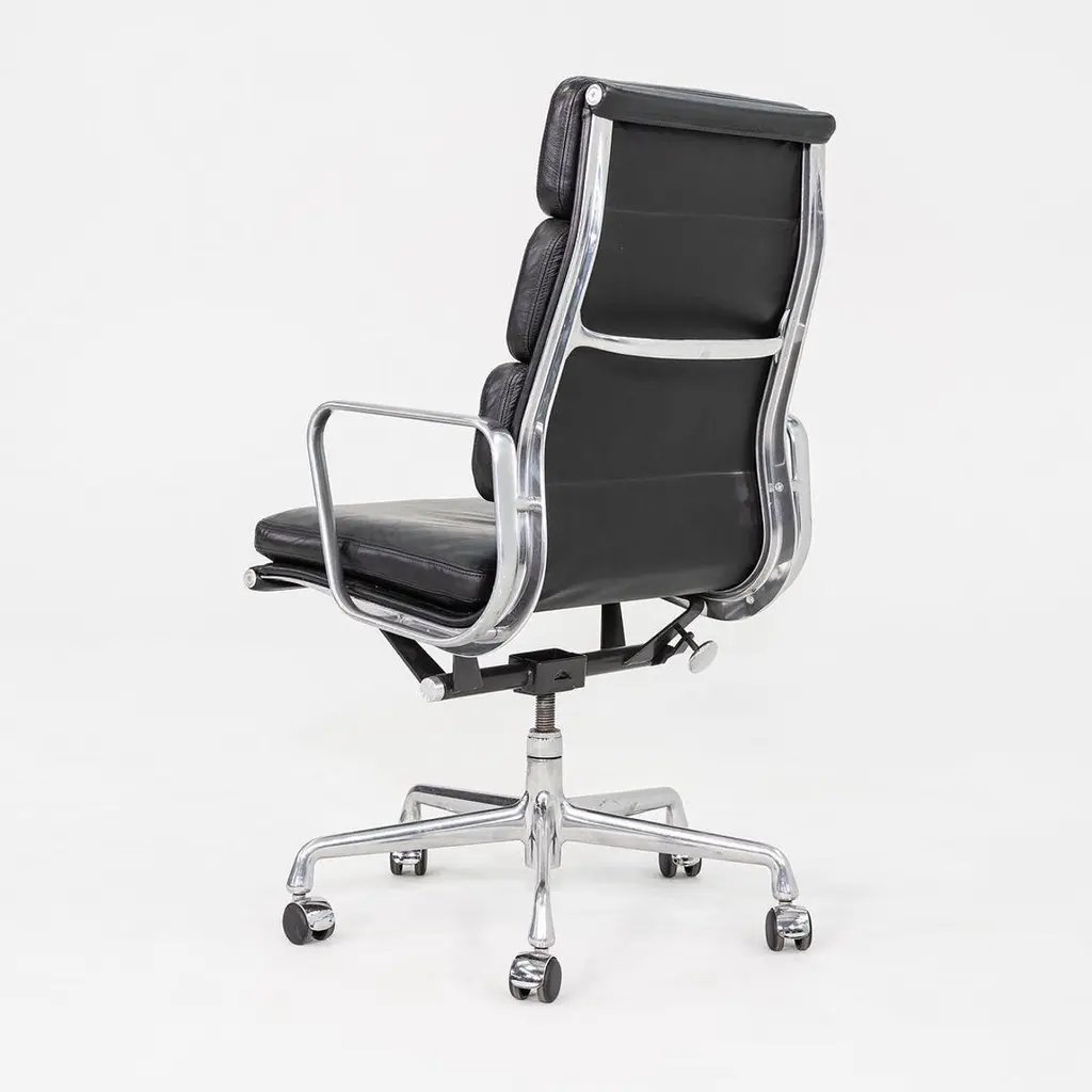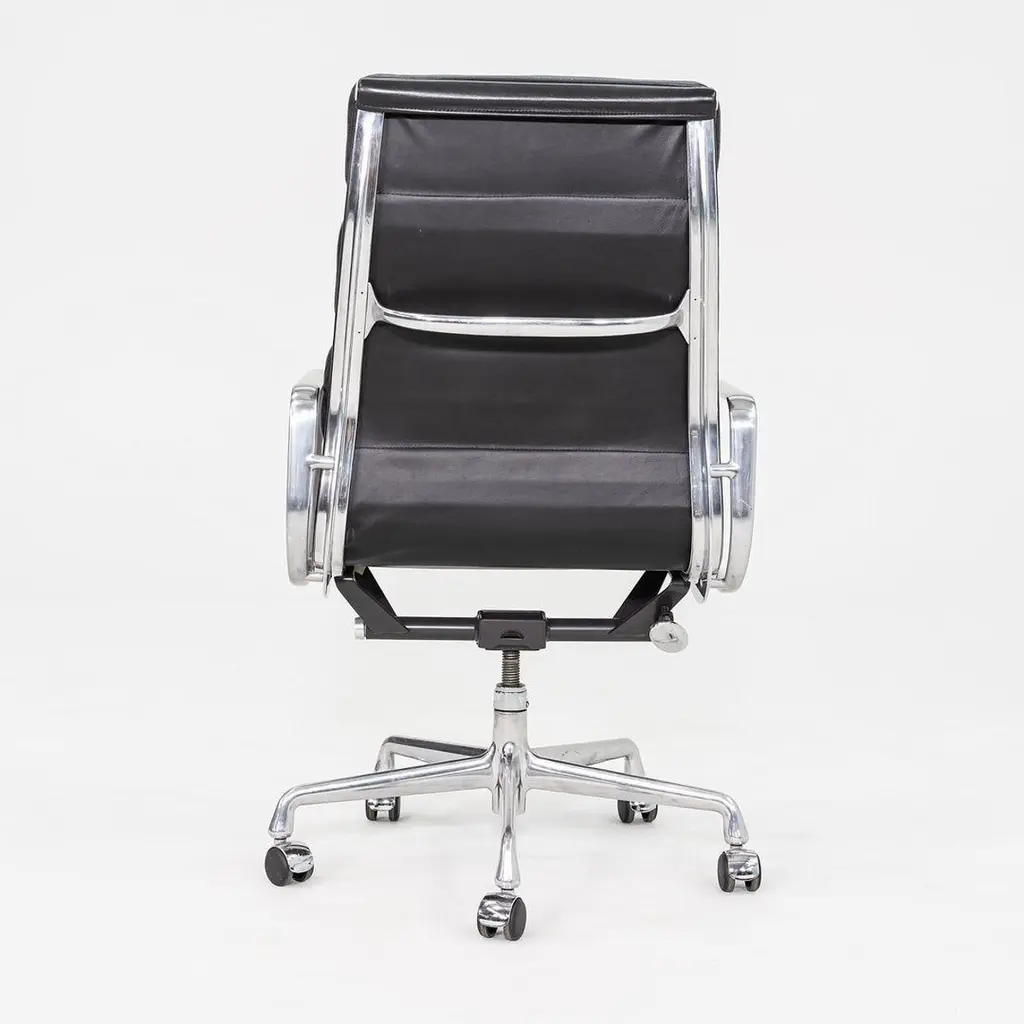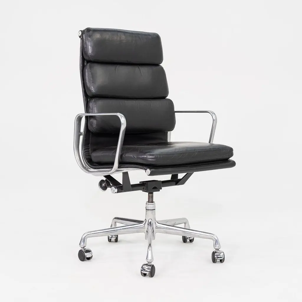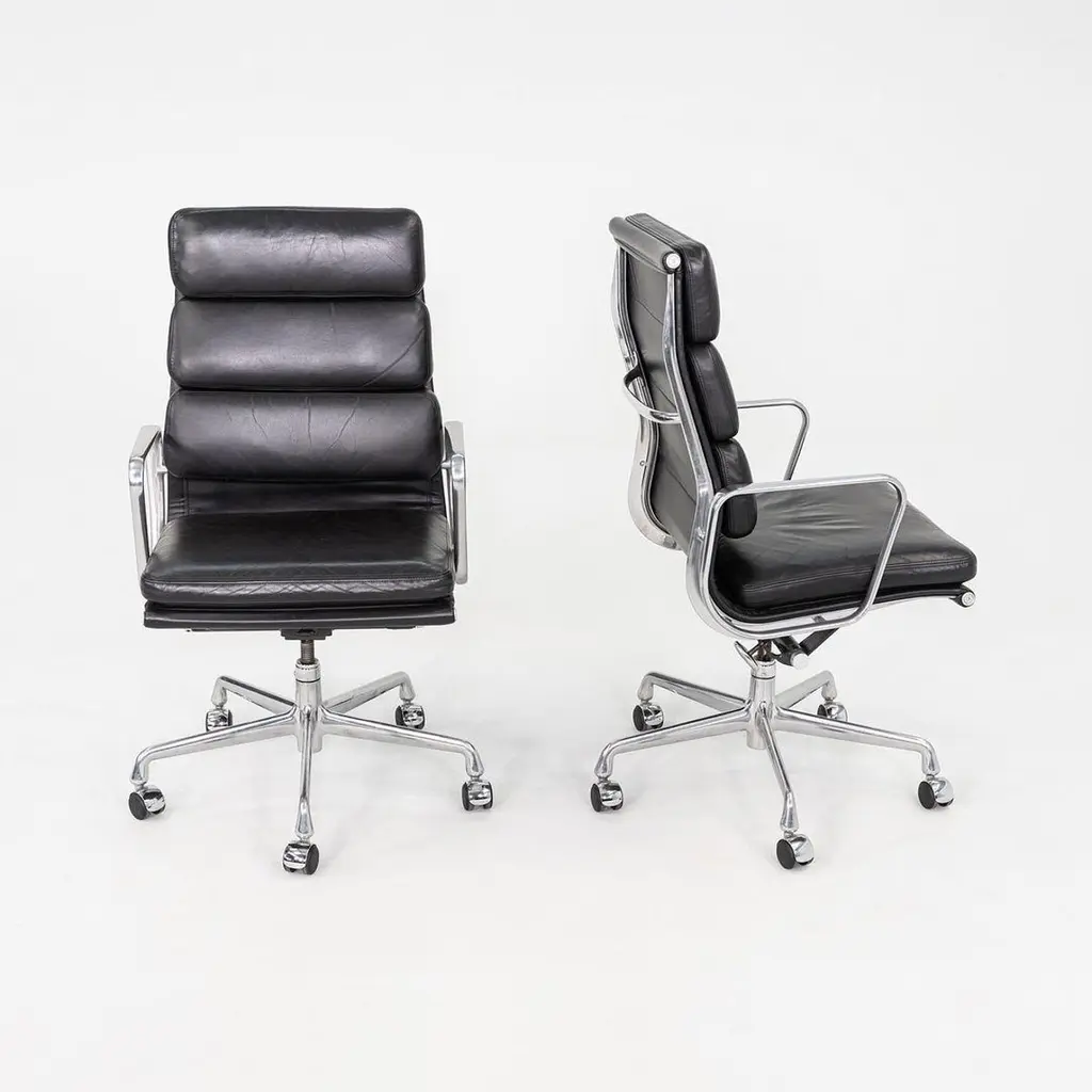 This is an Eames Aluminum Group Executive-Height Soft Pad Desk Chair, originally designed by Charles and Ray Eames for Herman Miller in 1969. These particular examples date to 2003. Their design features black leather upholstery and they have polished aluminum frames. The seat and back have plush cushions that are 2 inches thick, and this model features a manual lift.The listed price includes one chair and there are more than 12 available to purchase.Each chair measures 23.75 inches deep, 22.5 inches wide, and 40 inches high, with a seat height of 18.5 inches. These pieces show minor wear from previous use, including creasing in the leather. Otherwise, their bases and armrests are in good condition with light scuffs and scratches. Overall, the chairs are in good to very good condition. Please see photos.