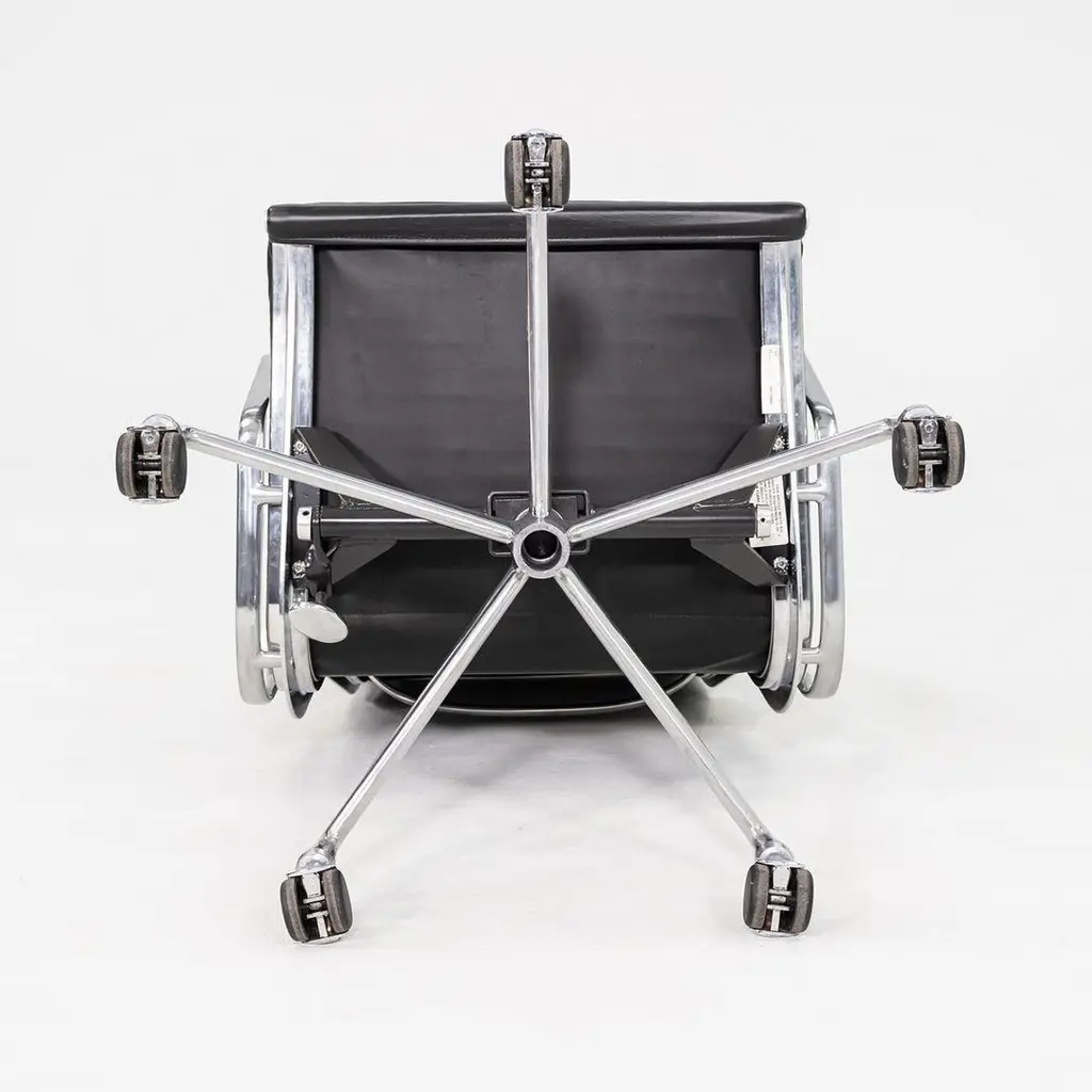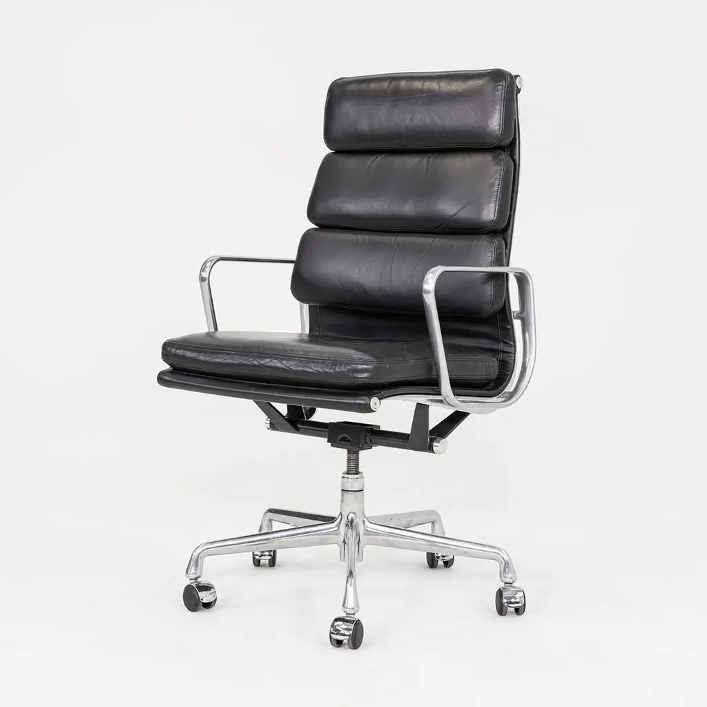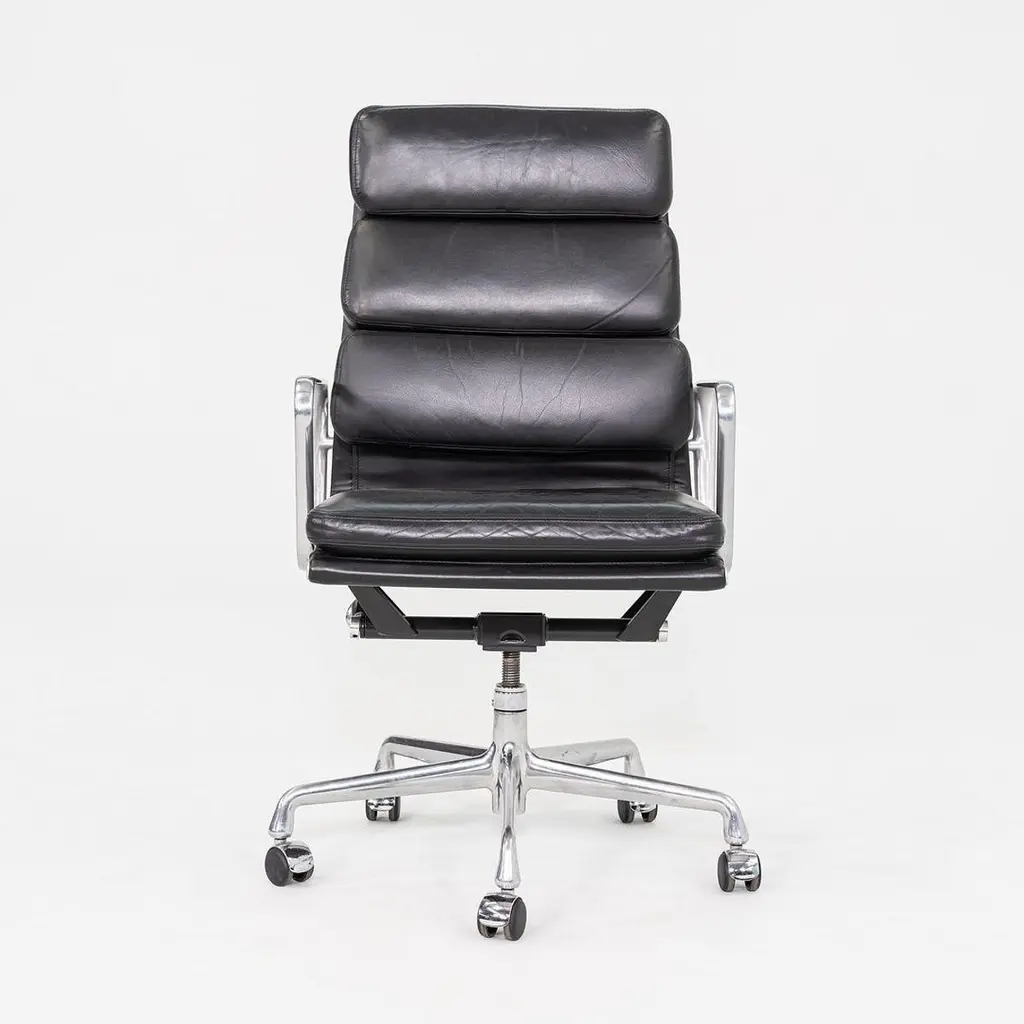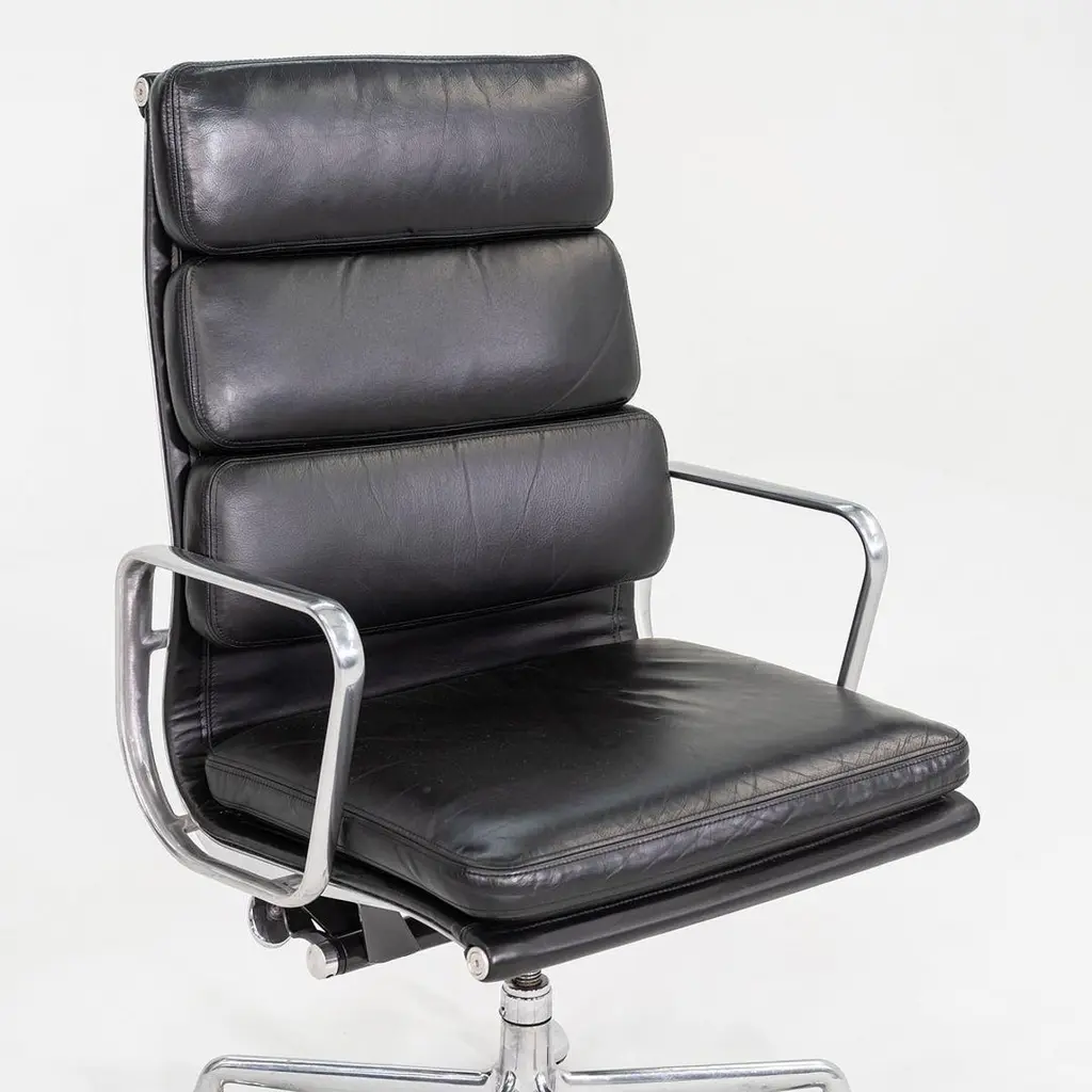 This is an Eames Aluminum Group Executive-Height Soft Pad Desk Chair, originally designed by Charles and Ray Eames for Herman Miller in 1969. These particular examples date to 2003. Their design features black leather upholstery and they have polished aluminum frames. The seat and back have plush cushions that are 2 inches thick, and this model features a manual lift.The listed price includes one chair and there are more than 12 available to purchase.Each chair measures 23.75 inches deep, 22.5 inches wide, and 40 inches high, with a seat height of 18.5 inches. These pieces show minor wear from previous use, including creasing in the leather. Otherwise, their bases and armrests are in good condition with light scuffs and scratches. Overall, the chairs are in good to very good condition. Please see photos.