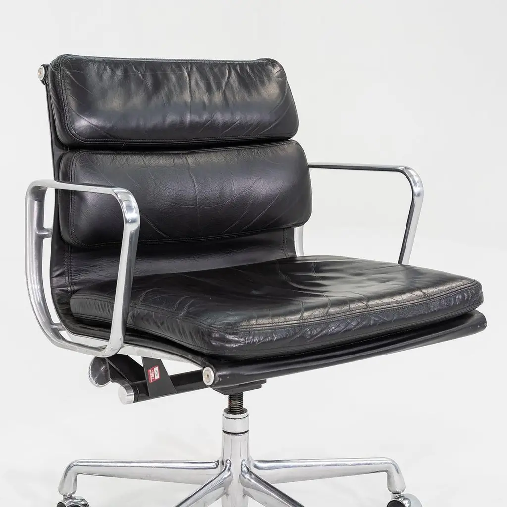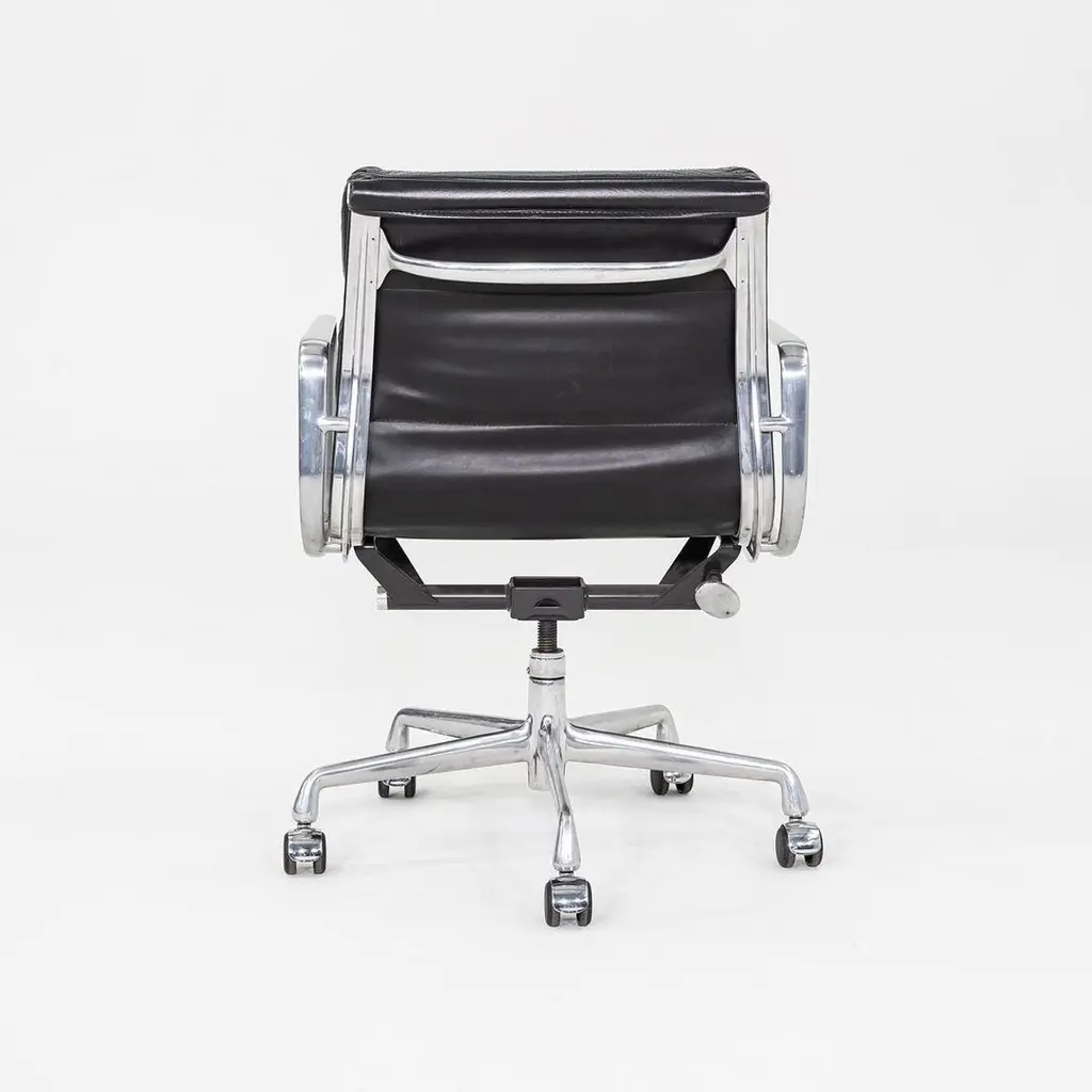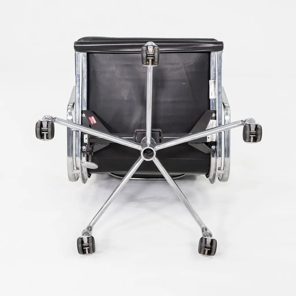 This is an Eames Aluminum Group Soft Pad Management Desk Chair, Model EA435, originally designed by Charles and Ray Eames for Herman Miller in 1969. These examples date to the year 2003. Their design features a cast aluminum frame with an adjustable 5-star base on casters. The seats have plush cushions that are 2 inches thick, and they're upholstered in black leather. These pieces have a tilt feature with locking capability, a full 360-degree swivel, and a manual lift mechanism.The listed price includes one chair and there are eight available to purchase.Each chair measures 24 inches deep, 22.5 inches wide, and 34 inches high, with a seat height of 20.5 inches. The chairs do show wear consistent with previous use. There are minor scuffs and scratches on the frame and base, as well as creases and wear in the leather. Overall the chair is in good to very good condition. Please see photos.