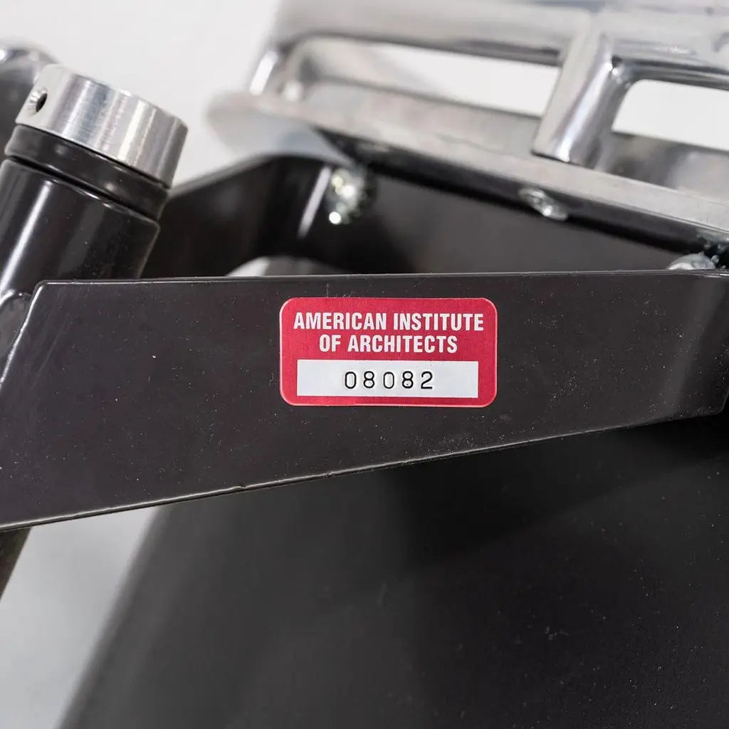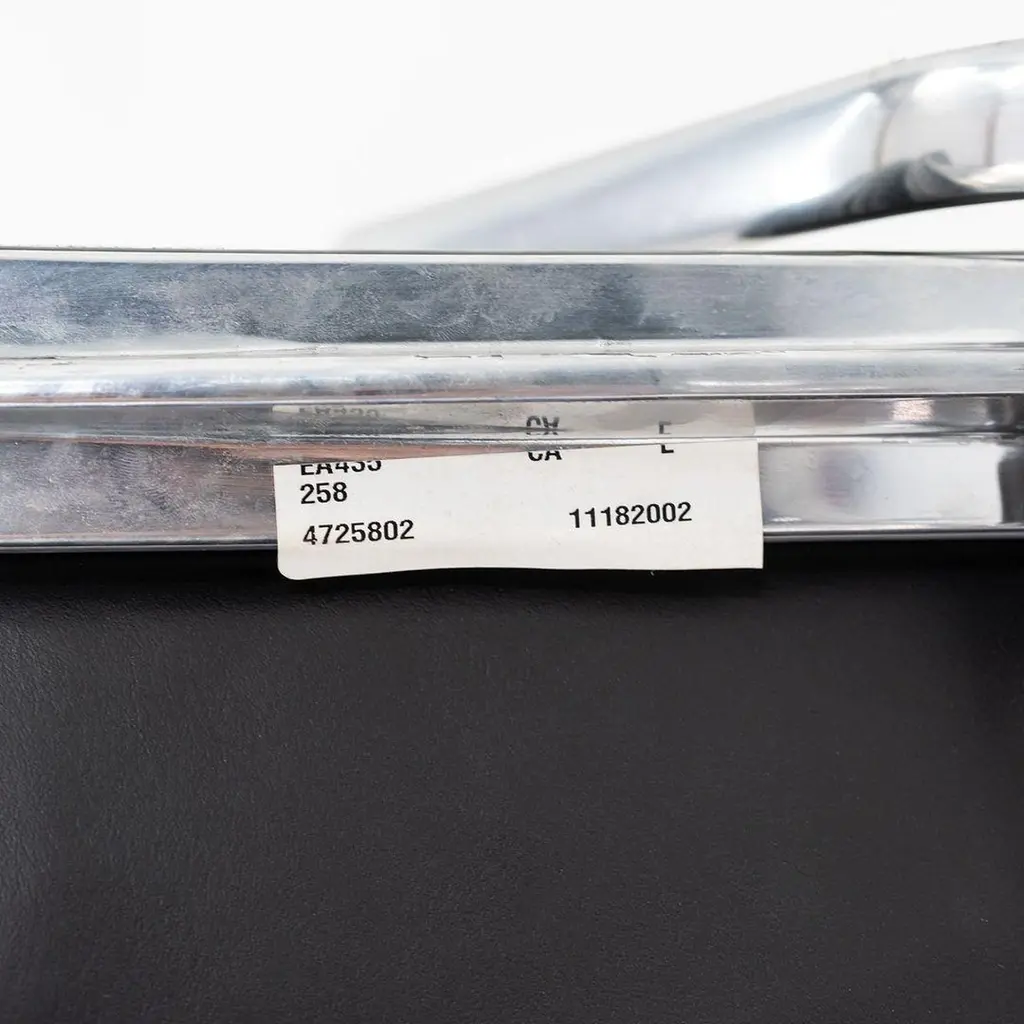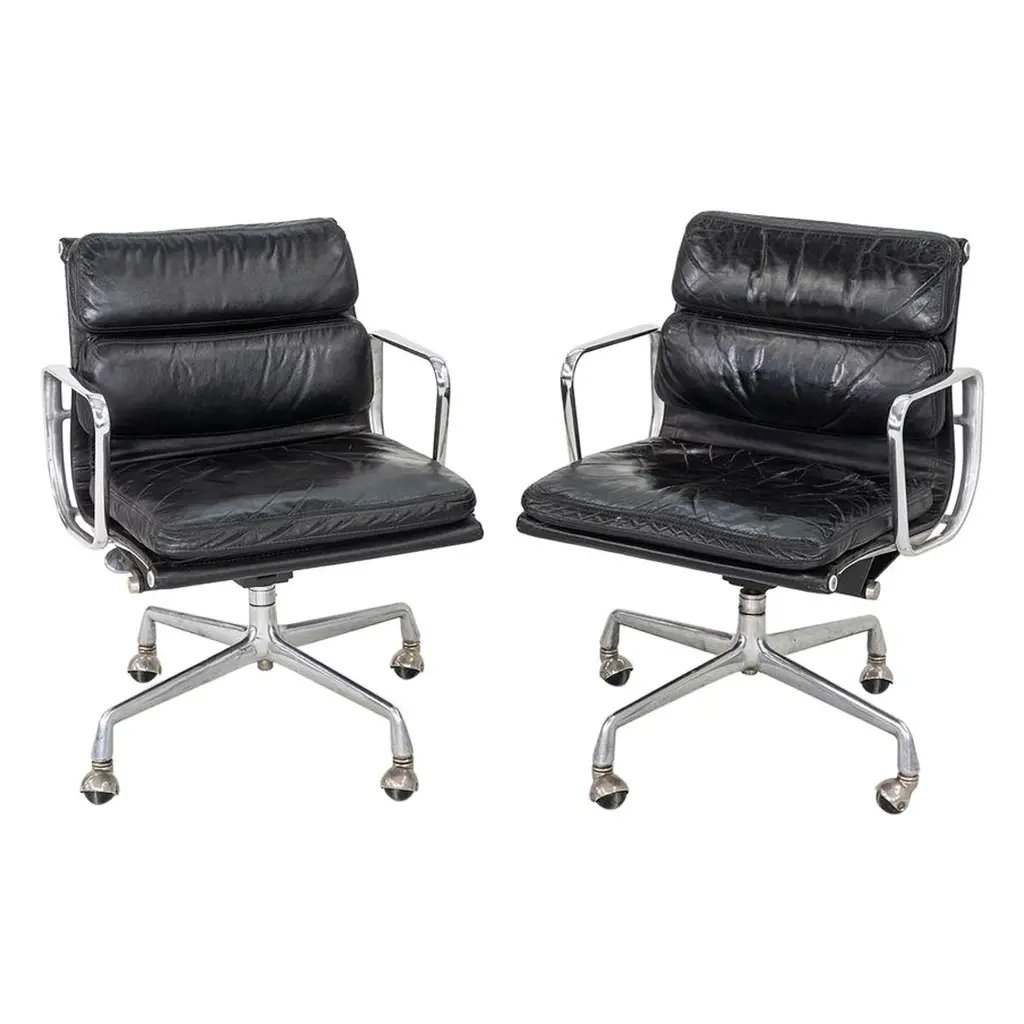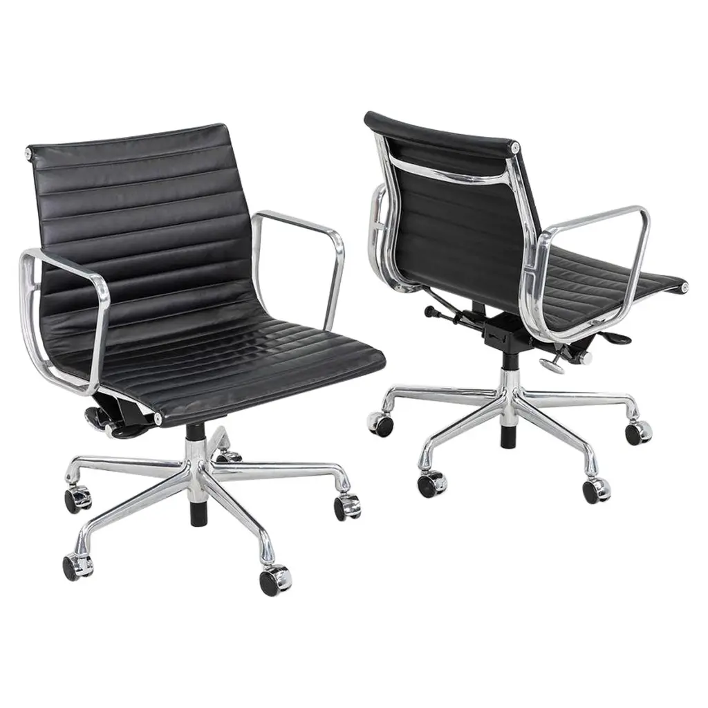 This is an Eames Aluminum Group Soft Pad Management Desk Chair, Model EA435, originally designed by Charles and Ray Eames for Herman Miller in 1969. These examples date to the year 2003. Their design features a cast aluminum frame with an adjustable 5-star base on casters. The seats have plush cushions that are 2 inches thick, and they're upholstered in black leather. These pieces have a tilt feature with locking capability, a full 360-degree swivel, and a manual lift mechanism.The listed price includes one chair and there are eight available to purchase.Each chair measures 24 inches deep, 22.5 inches wide, and 34 inches high, with a seat height of 20.5 inches. The chairs do show wear consistent with previous use. There are minor scuffs and scratches on the frame and base, as well as creases and wear in the leather. Overall the chair is in good to very good condition. Please see photos.