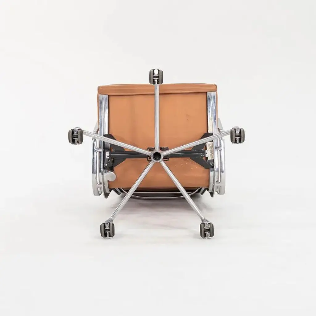 This is an Eames Aluminum Group Executive-Height Soft Pad Desk Chair, originally designed by Charles and Ray Eames for Herman Miller in 1968. This particular example dates to 2004. The listed price includes one chair and we have several executive chairs available for purchase. The design features dark tan leather upholstery and has a frame of polished aluminum. The seat and back have plush cushions that are 2 inches thick, and this model features a manual lift.Each chair measures 23 inches deep, 23 inches wide, and 40.25 inches high. It has a minimum seat height of 19.25 inches that is adjustable to 22.5 inches. It has a seat depth of 16.5 inches. In all of these examples, the leather is in good condition with some patina present. The aluminum bases have some normal light wear present. The arms are in terrific shape and shine beautifully with minimal wear. Overall, these pieces are in very good condition. Please see photos.