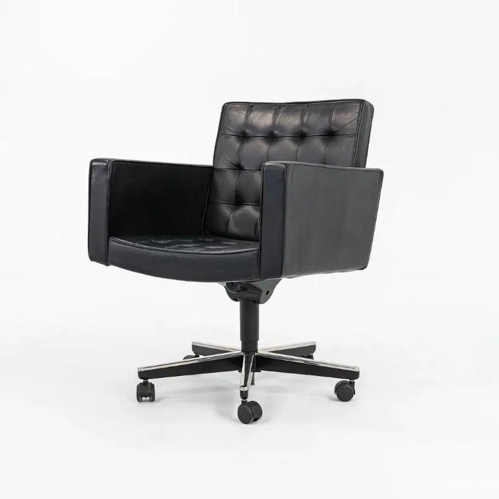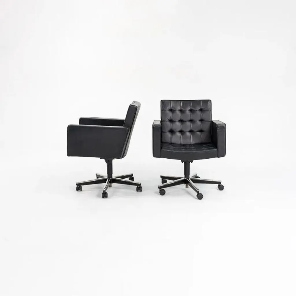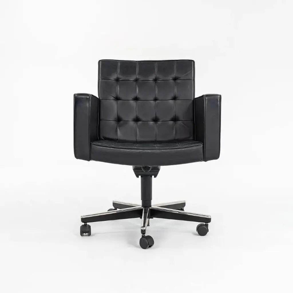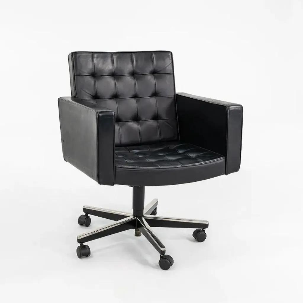 These are Cafiero Executive Desk Chairs, Model 180 SPS, designed by Vincent Cafiero for Knoll in 1960. These examples date to 2004. The listed price includes one Cafiero chair, and we have several on hand. Their design features black tufted leather upholstery with piping, and has a swiveling 5-point enameled-steel base on casters. Each chair measures 25.5 inches long, 25.5 inches wide, and 33.5 inches tall. They have a base seat height of 20 inches and an arm height of 27.75 inches. There is Knoll signature fabric underneath each chair. The leather is beautifully broken-in, and shows some creasing. There are several light scratches and marks to the leather. The polished steel bases have some small spots, and have a light patina to their finish. Overall, these chairs are in good condition with some wear apparent. Please see photos.