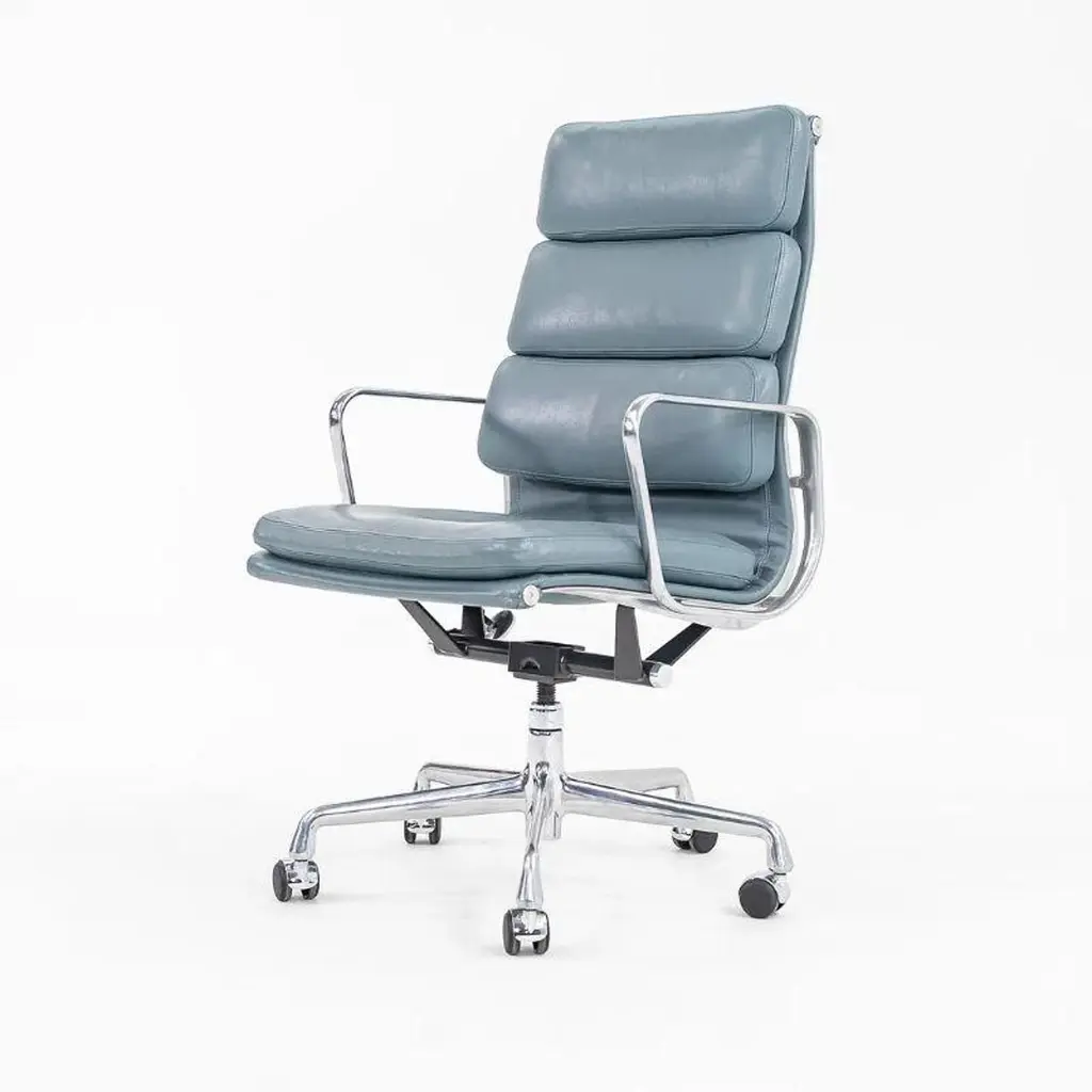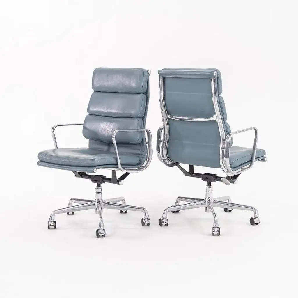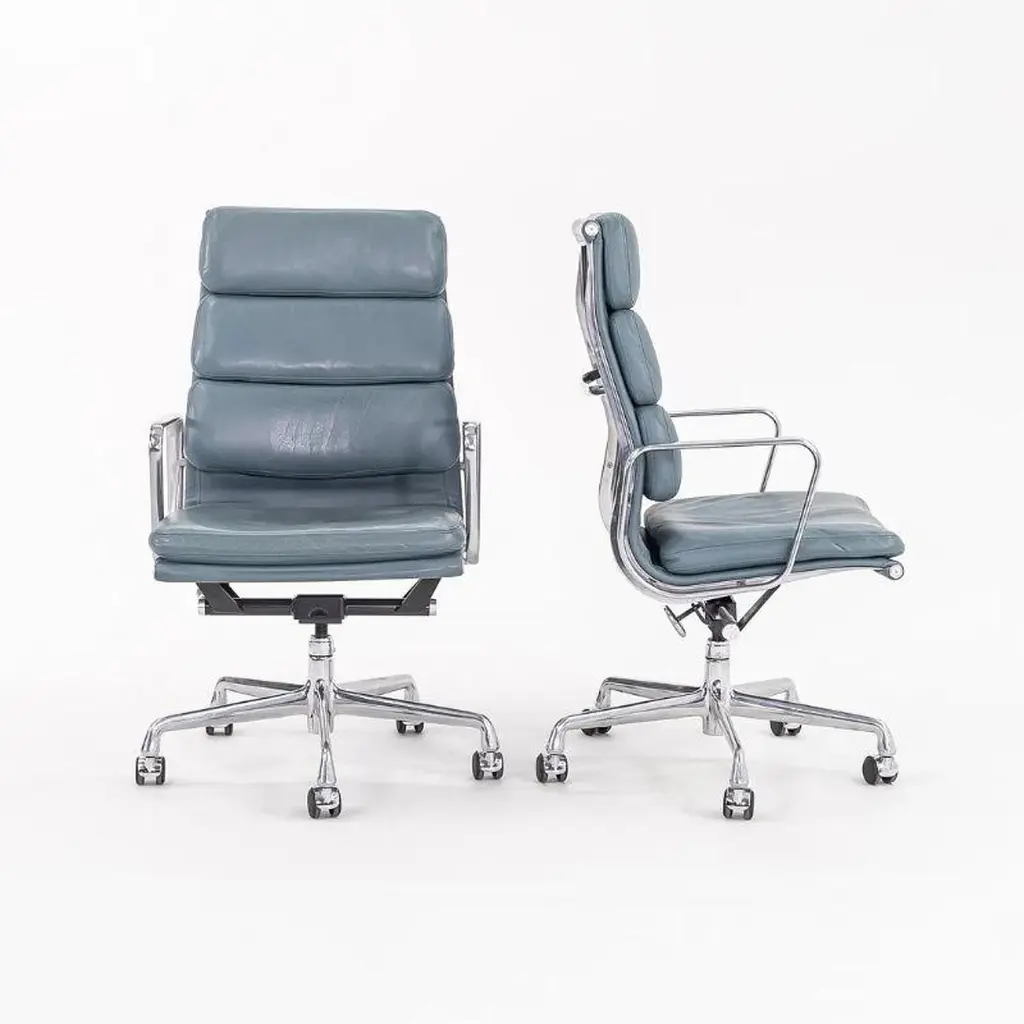 This is an Eames Aluminum Group Executive-Height Soft Pad Desk Chair, originally designed by Charles and Ray Eames for Herman Miller in 1968. This particular example dates to 2005. The listed price includes one chair and we have several executive chairs available for purchase. The design features blue leather upholstery and has a frame of polished aluminum. The seat and back have plush cushions that are 2 inches thick, and this model features a manual lift.Each chair measures 23 inches deep, 23 inches wide, and 40.25 inches high. It has a minimum seat height of 19.25 inches that is adjustable to 22.5 inches. It has a seat depth of 16.5 inches. In all of these examples, the leather is in good condition with some patina present. The aluminum bases have some normal light wear present. The arms are in terrific shape and shine beautifully with minimal wear. Overall, these pieces are in very good condition. Please see photos.