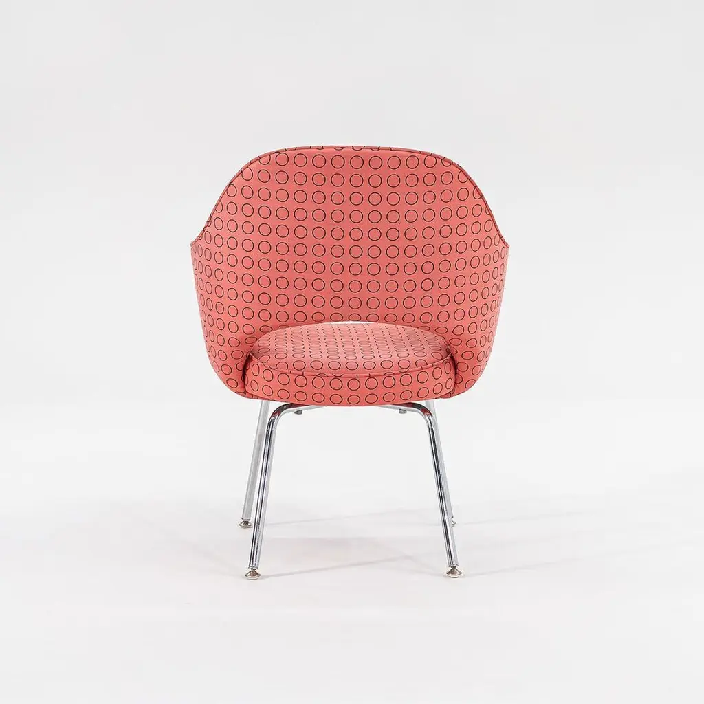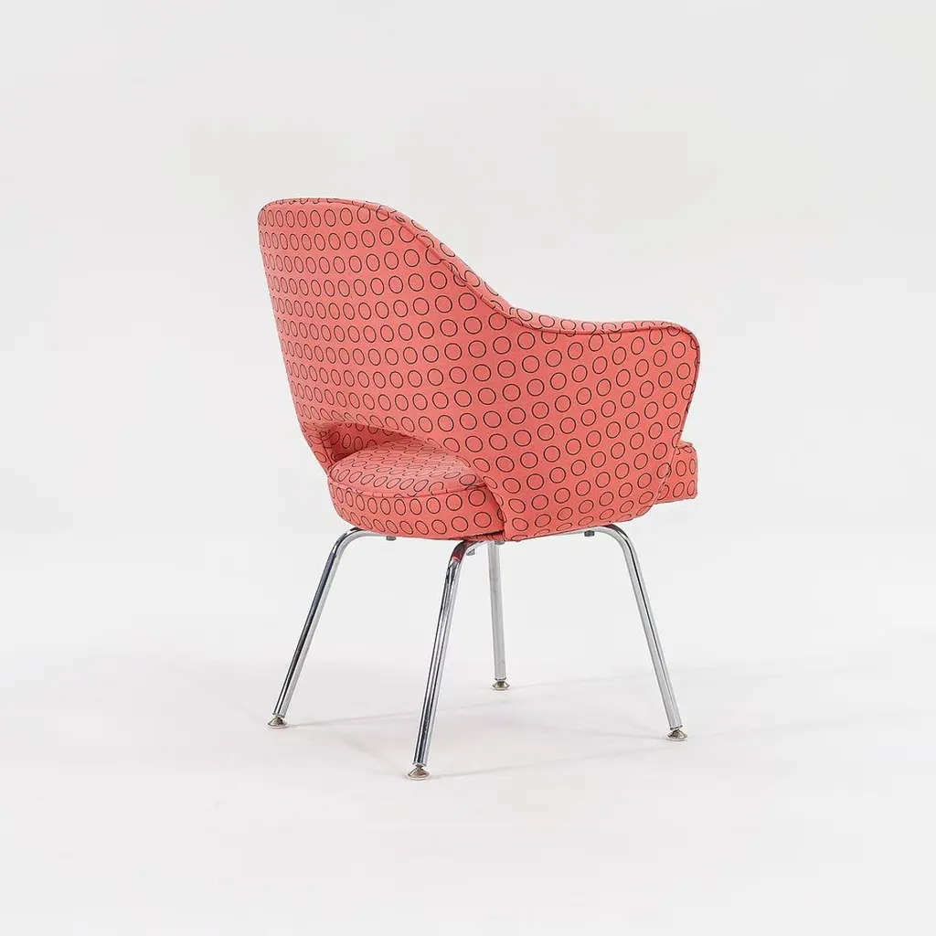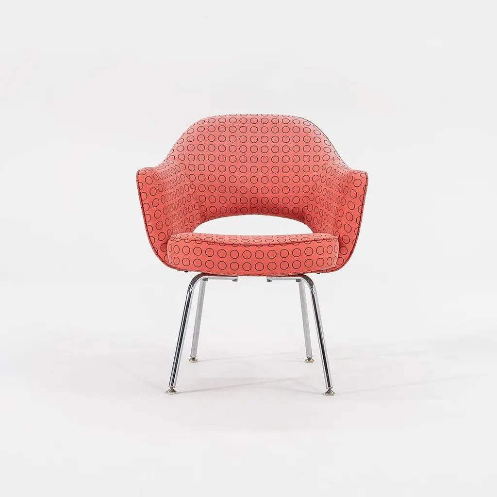 These are Saarinen Executive Chairs, Model 71 APC, originally designed by Eero Saarinen for Knoll in 1950. These particular examples date to 2007. The listed price includes one chair, and we have several chairs available for purchase. Their design features legs of polished tubular stainless steel and has an upholstered seat and back. They are currently upholstered in a light pinky-red fabric with a repeat circle pattern, designed by Hella Jongerius for Maharam. Each chair measures 24.75 inches deep, 26 inches wide, and 31.5 inches high. They have an 18-inch seat height, and a 25-inch arm height. Each chair has the Knoll logo on its underside dustcover. The upholstery has a handful of small spots and shows a bit of fading. The bases have a few errant scratches, but present quite nicely. Overall, these chairs are in good condition with some wear apparent. Please see photos. Genuinely faulty goods will be replaced or money refunded on a case by case basis, however we must be advised of any faulty goods upon receipt of the item. It is the customer's responsibility to pay for return shipping and ship the item back to us. If the item is found to be faulty, we will also refund the postage cost. If there is no damage to the item, but a return is approved, the buyer will be responsible for both the initial and return shipping cost. It is at our discretion to refuse the refund of undamaged goods. If an order is placed and you would like to cancel the order, please notify us immediately. Any refunds will be processed via the same means that payment was made.