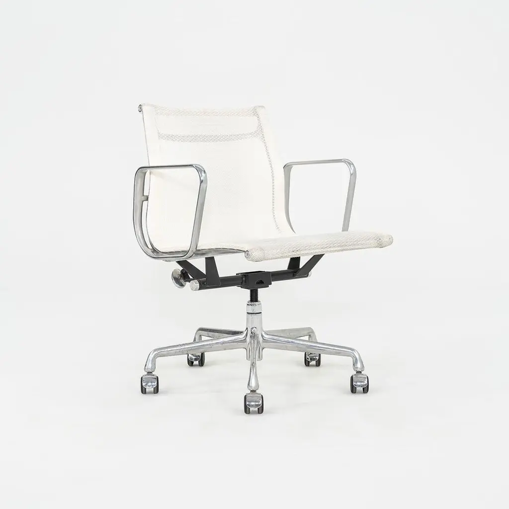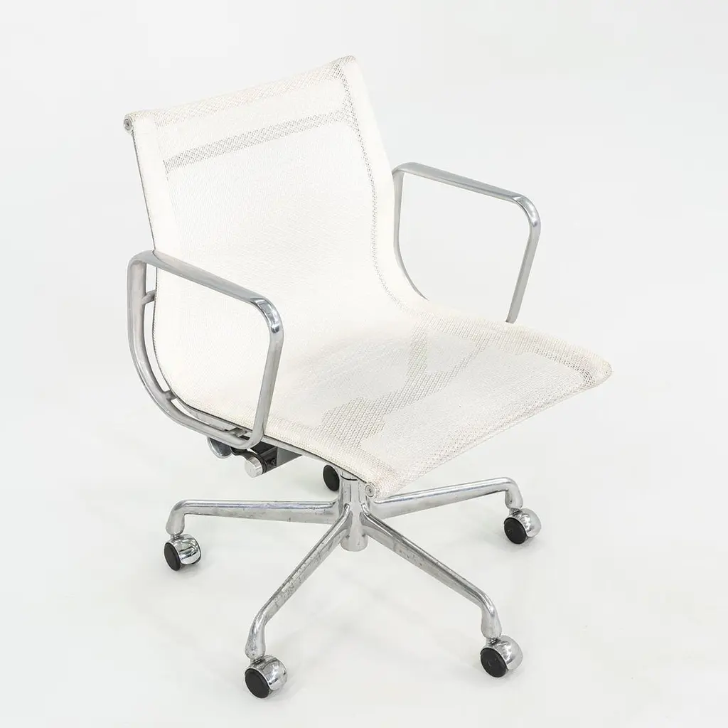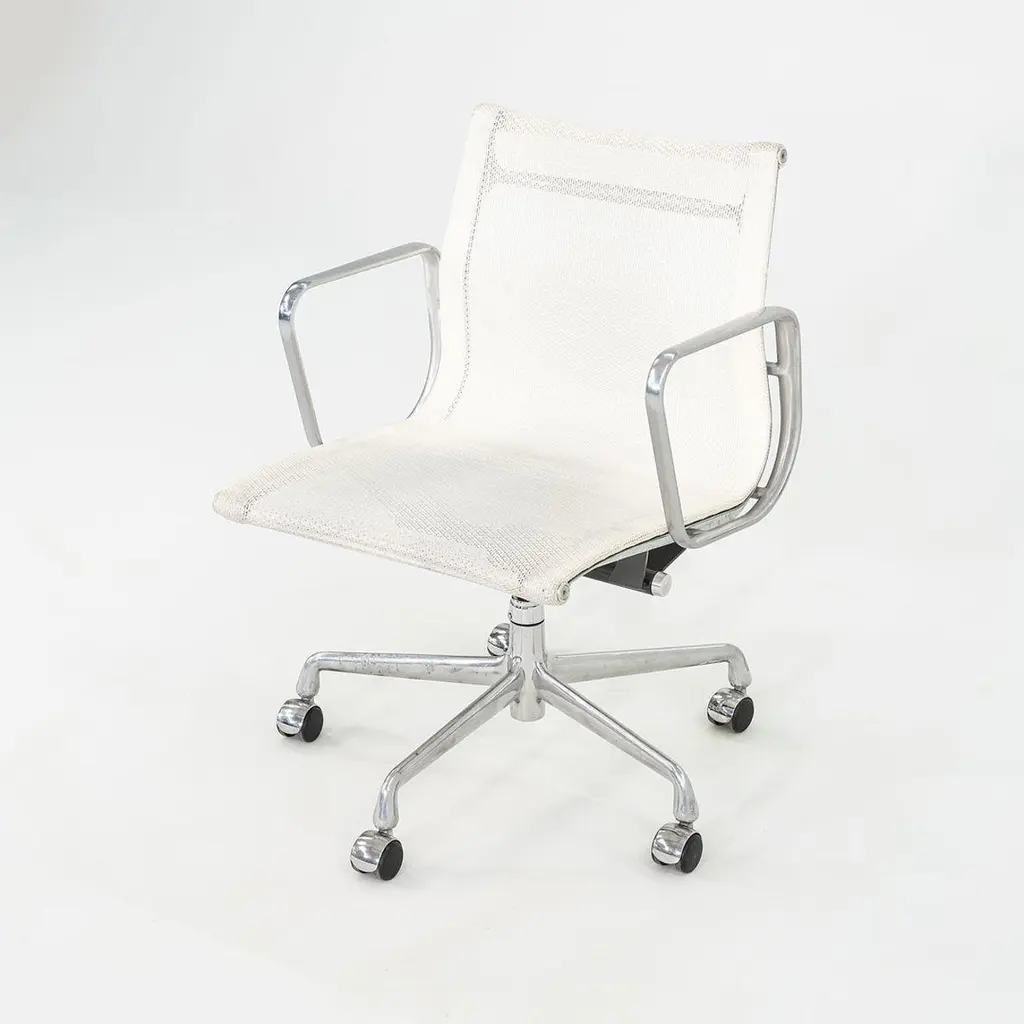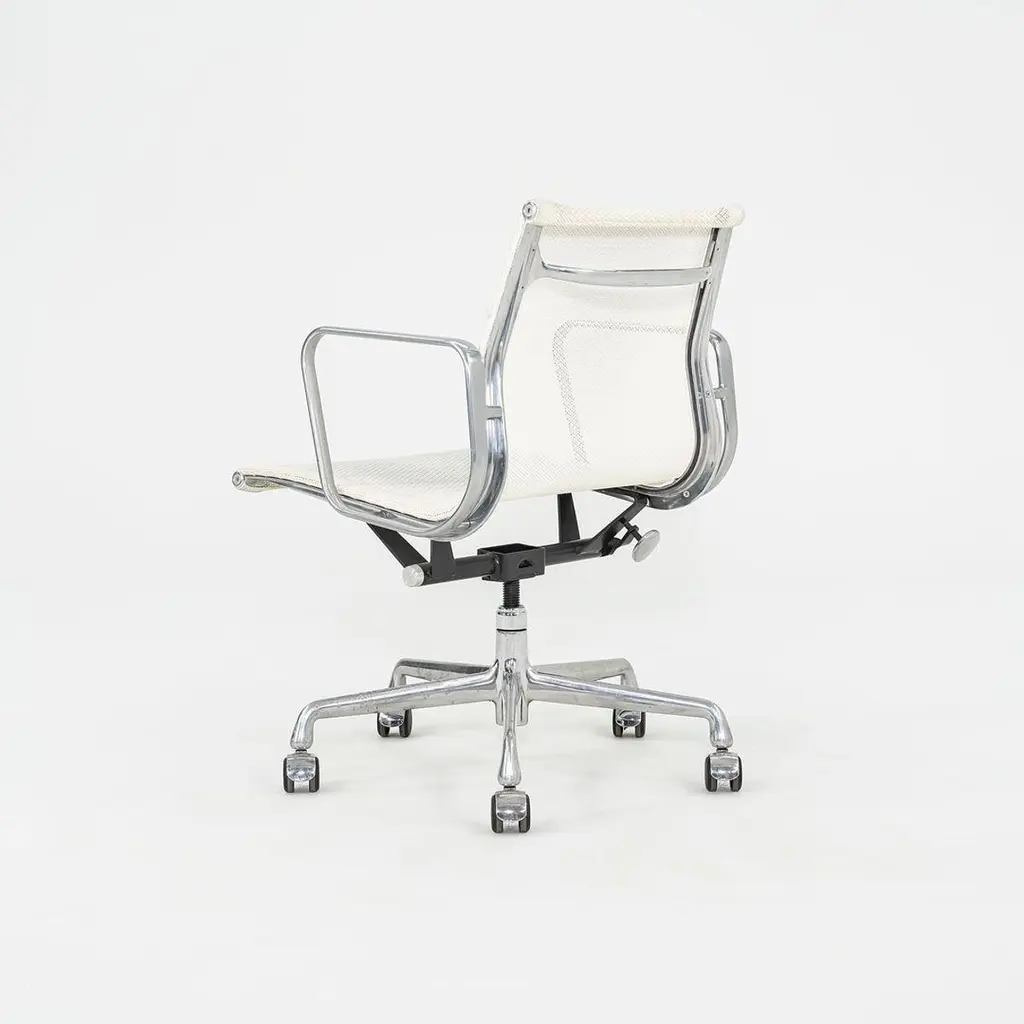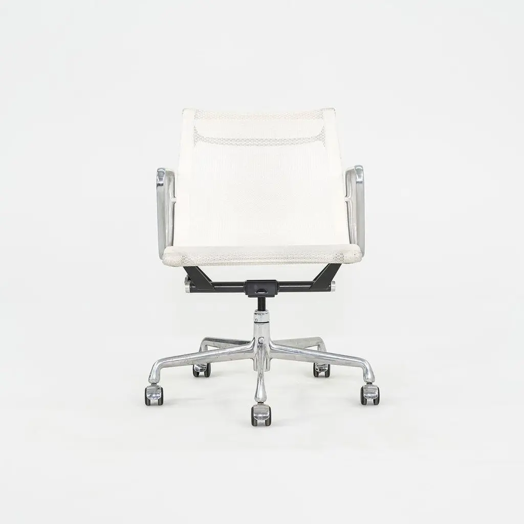 These are Eames Aluminum Group Management Chairs, originally designed by Charles and Ray Eames for Herman Miller in 1958. These particular examples were produced in 2009. Their design features an adjustable aluminum 5-star base with a 360-degree swivel, and a white mesh seat. The listed price includes one chair and there are 12+ available to purchase. Each chair measures 21.25 inches deep, 22 inches wide, and 33 inches high with a seat height is 18.5 inches. The chairs are in good condition with expected wear from use. Please see photos.