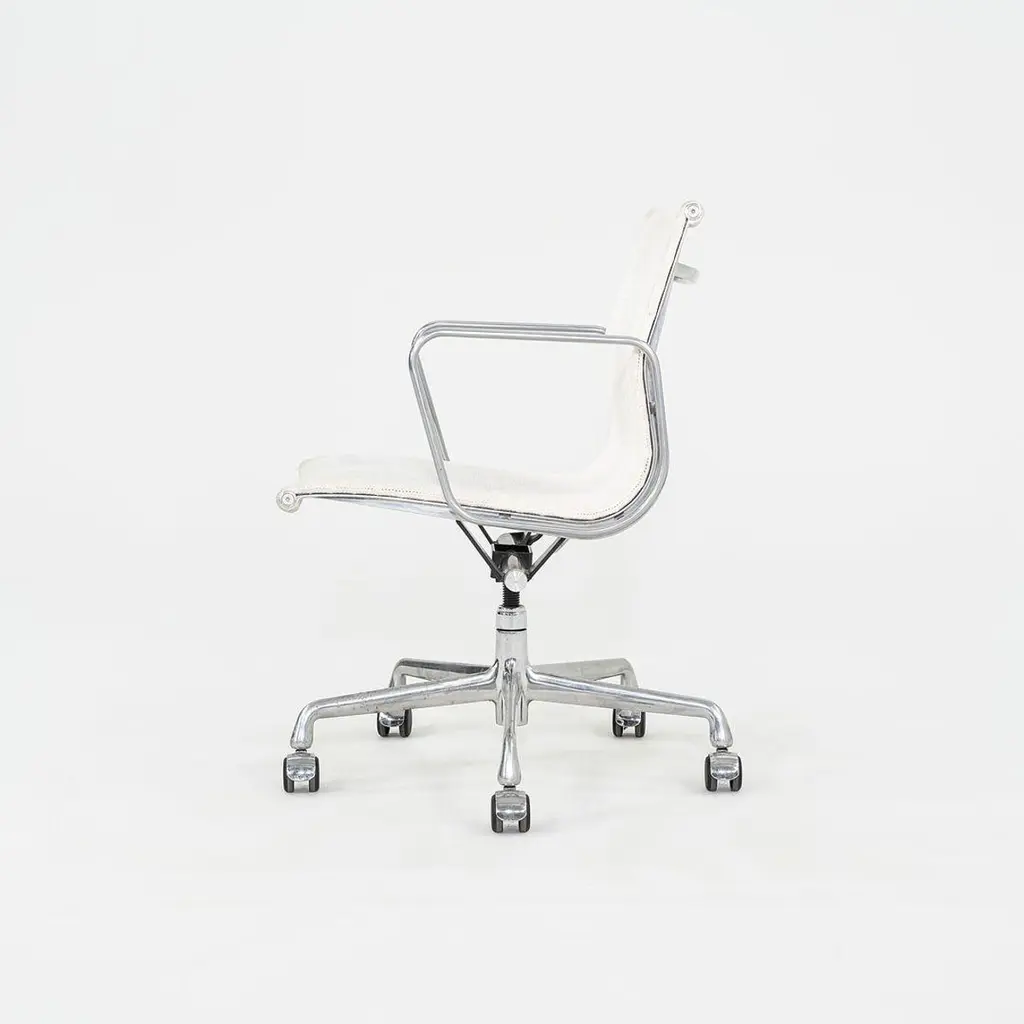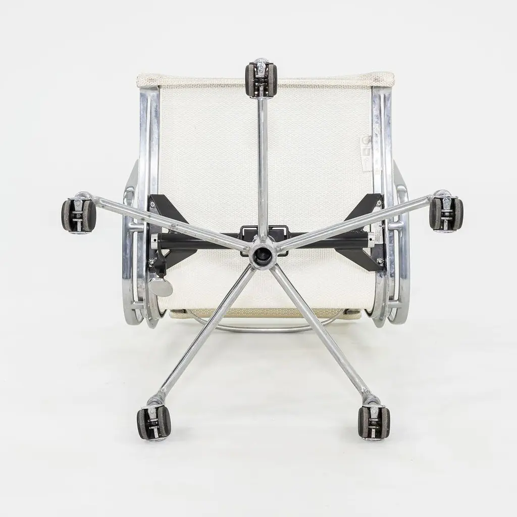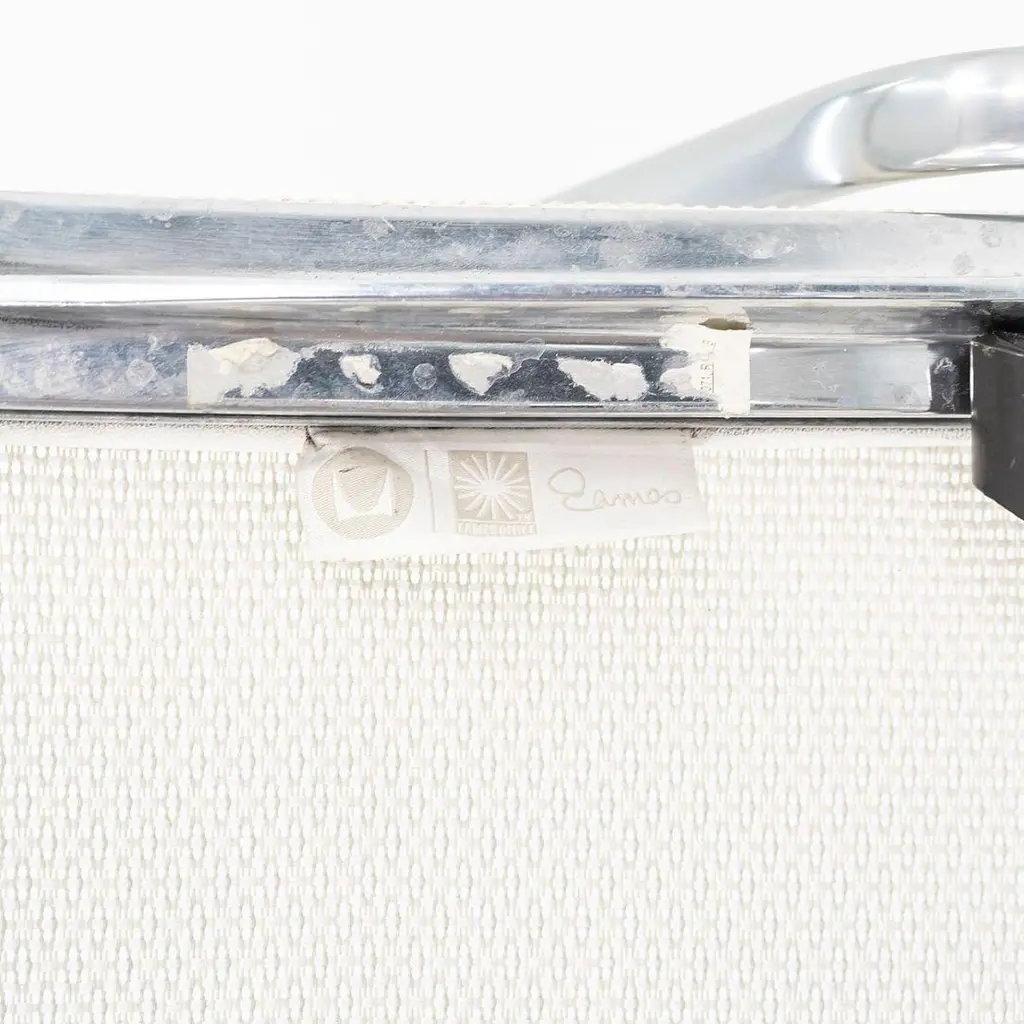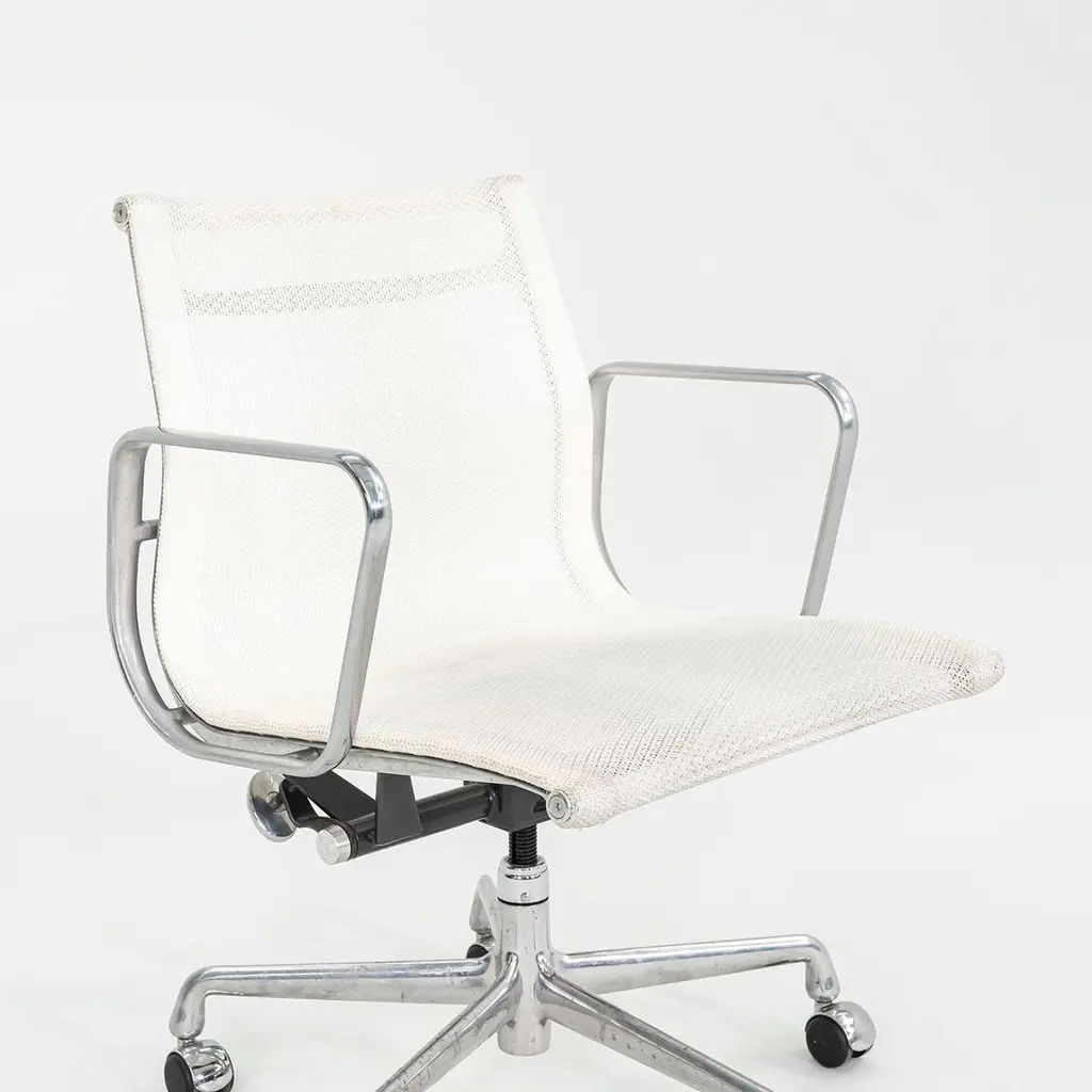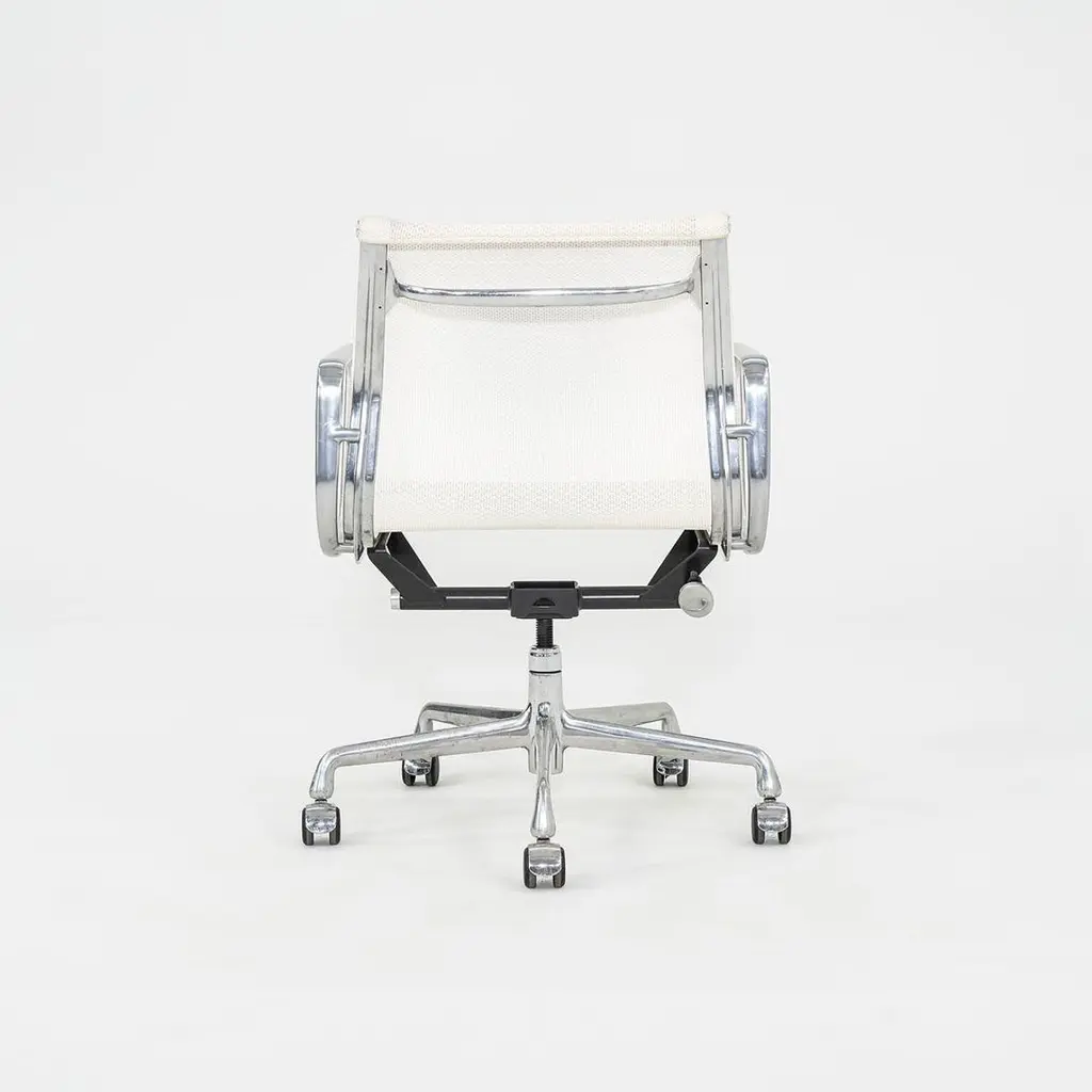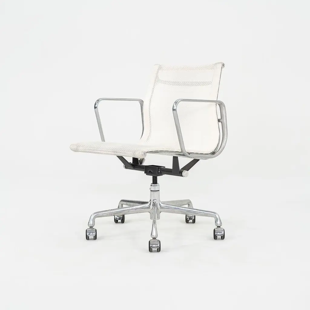 These are Eames Aluminum Group Management Chairs, originally designed by Charles and Ray Eames for Herman Miller in 1958. These particular examples were produced in 2009. Their design features an adjustable aluminum 5-star base with a 360-degree swivel, and a white mesh seat. The listed price includes one chair and there are 12+ available to purchase. Each chair measures 21.25 inches deep, 22 inches wide, and 33 inches high with a seat height is 18.5 inches. The chairs are in good condition with expected wear from use. Please see photos.