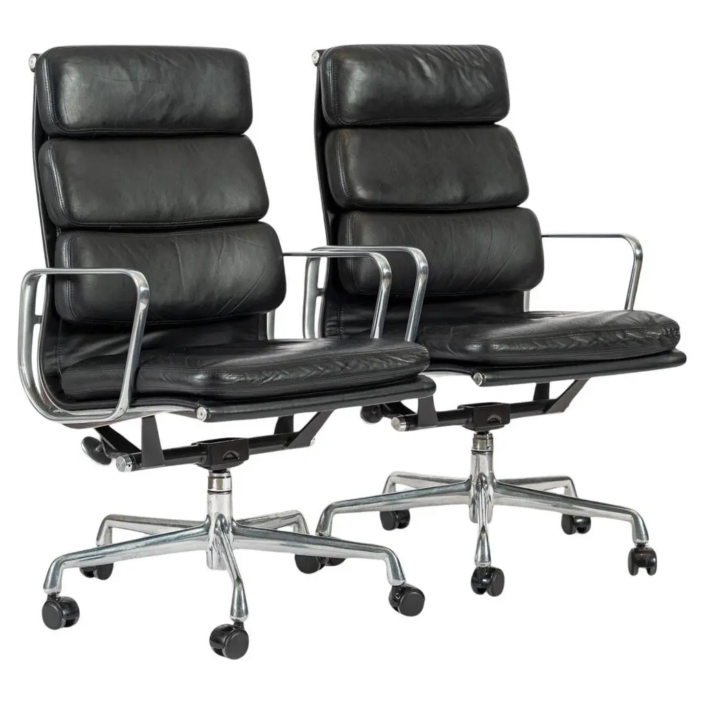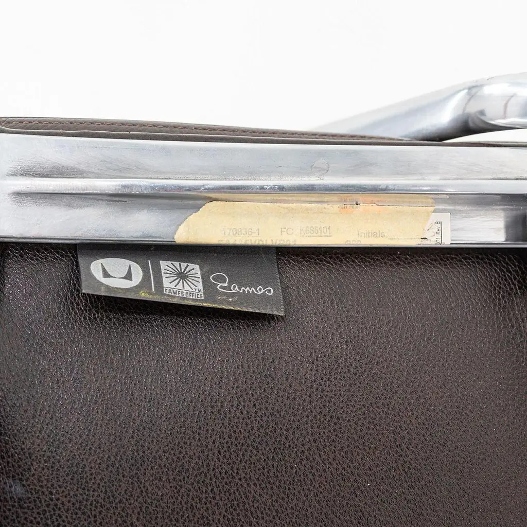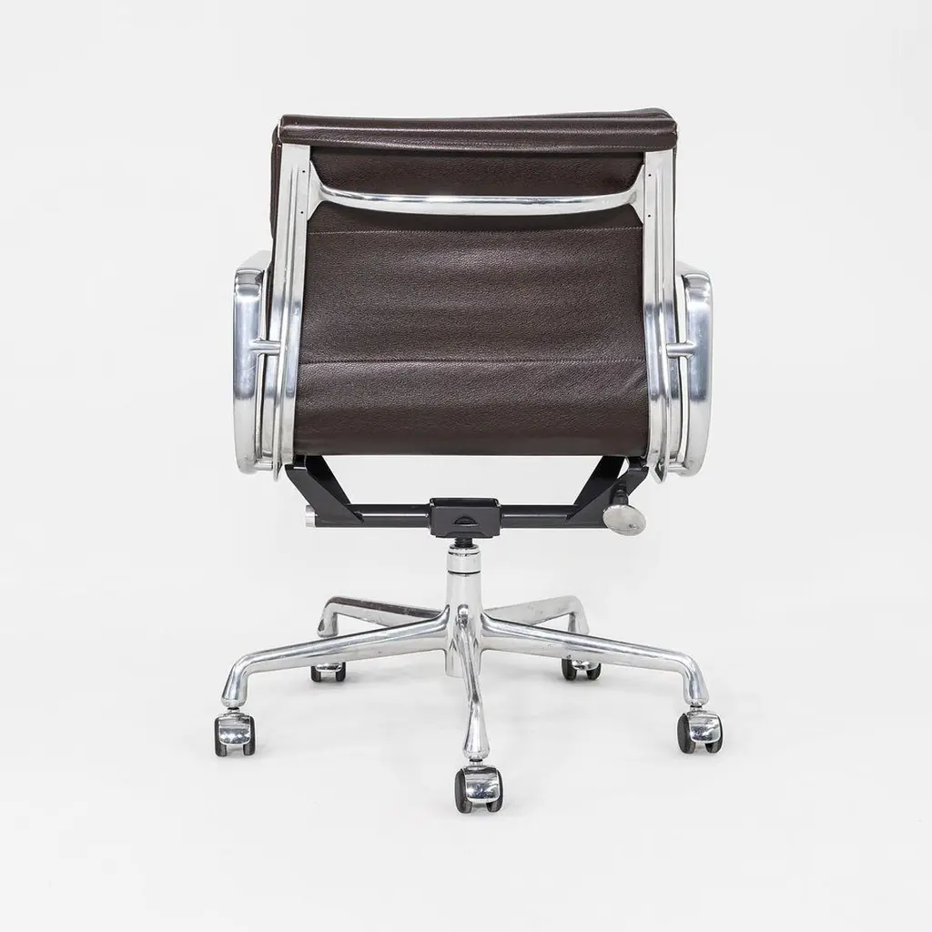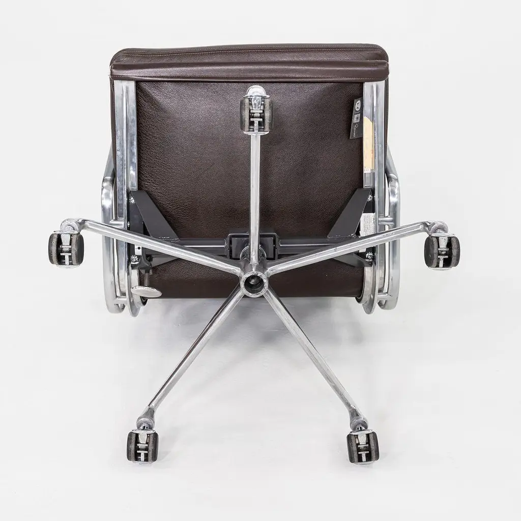 This is an Eames Aluminum Group Soft Pad Management Desk Chair, Model EA435, originally designed by Charles and Ray Eames for Herman Miller in 1969. These examples date to the year 2009. The design features a cast aluminum frame with 5-star bases on casters. The seats have plush cushions that are 2 inches thick, and they're upholstered in Pitch Brown Edelman Leather VB01. The chairs have a tilt feature with locking capability, a full 360-degree swivel, and a manual lift mechanism.The listed price includes one chair and there are seven available to purchase.Each chair measures 24 inches deep, 22.5 inches wide, and 34 inches high, with a seat height of 20.5 inches. The chairs show light wear from previous use and overall are in very good condition. Please see photos.