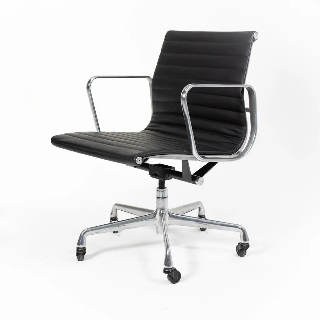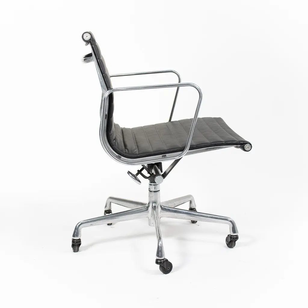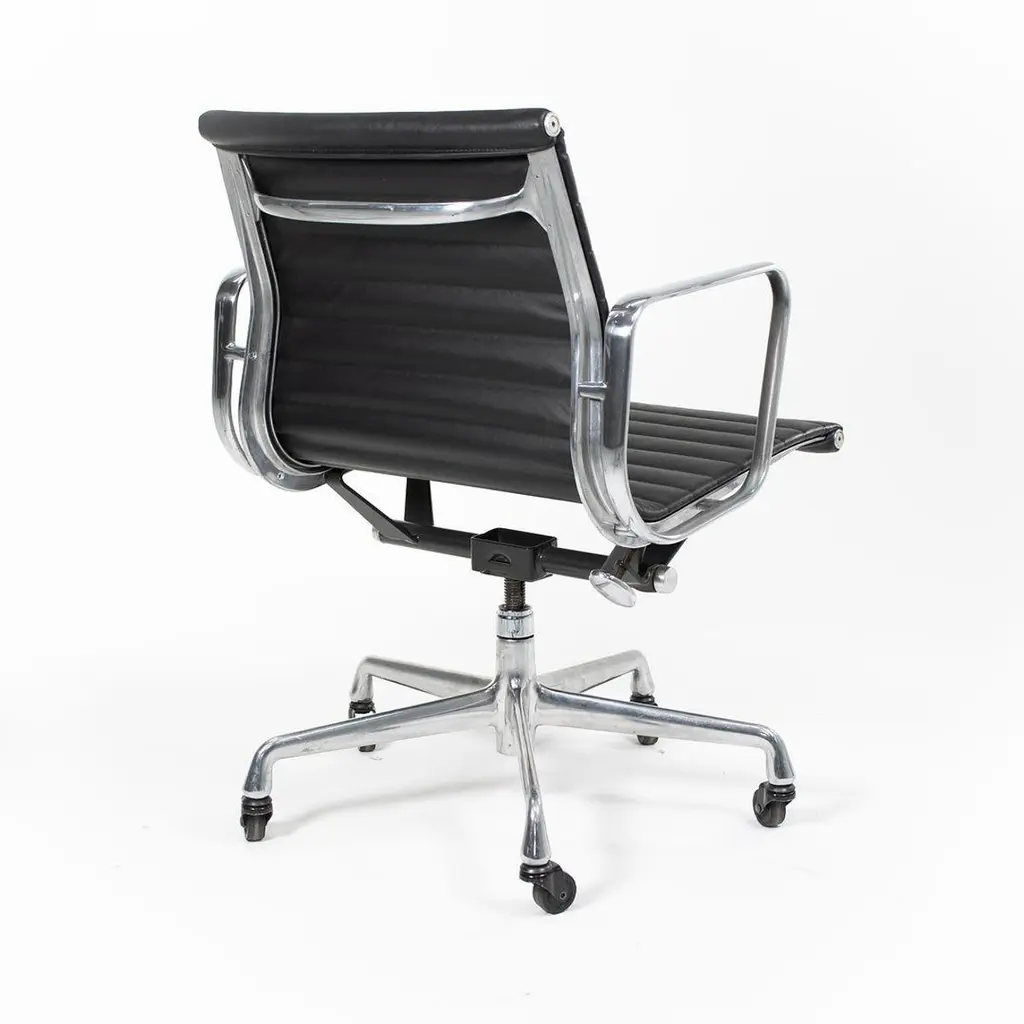 This is a single (multiple chairs are available, though sold individually) Eames Aluminum Group Management Desk Chair, designed by Charles and Ray Eames for Herman Miller in 1958. This particular chair was produced circa 2010s. The design sports a solid yet lightweight aluminum frame and is extremely well-made. The upholstery is done in a handsome smooth black leather. It has a tilt feature with locking capability and a full 360-degree swivel. The price listed is for one chair. Multiple chairs are available for individual purchase. Each chair measures 32.5 inches in height, is 23 inches wide, and is 23 inches in depth. The median seat height is 18.5 inches and it has a 3 inch height adjustment range. Condition overall is very good to excellent, with some light signs of wear to the frame to be expected. The upholstery is seemingly near immaculate and looks as though it's never been sat on. The arms are also in exceptionally nice condition. See photos.