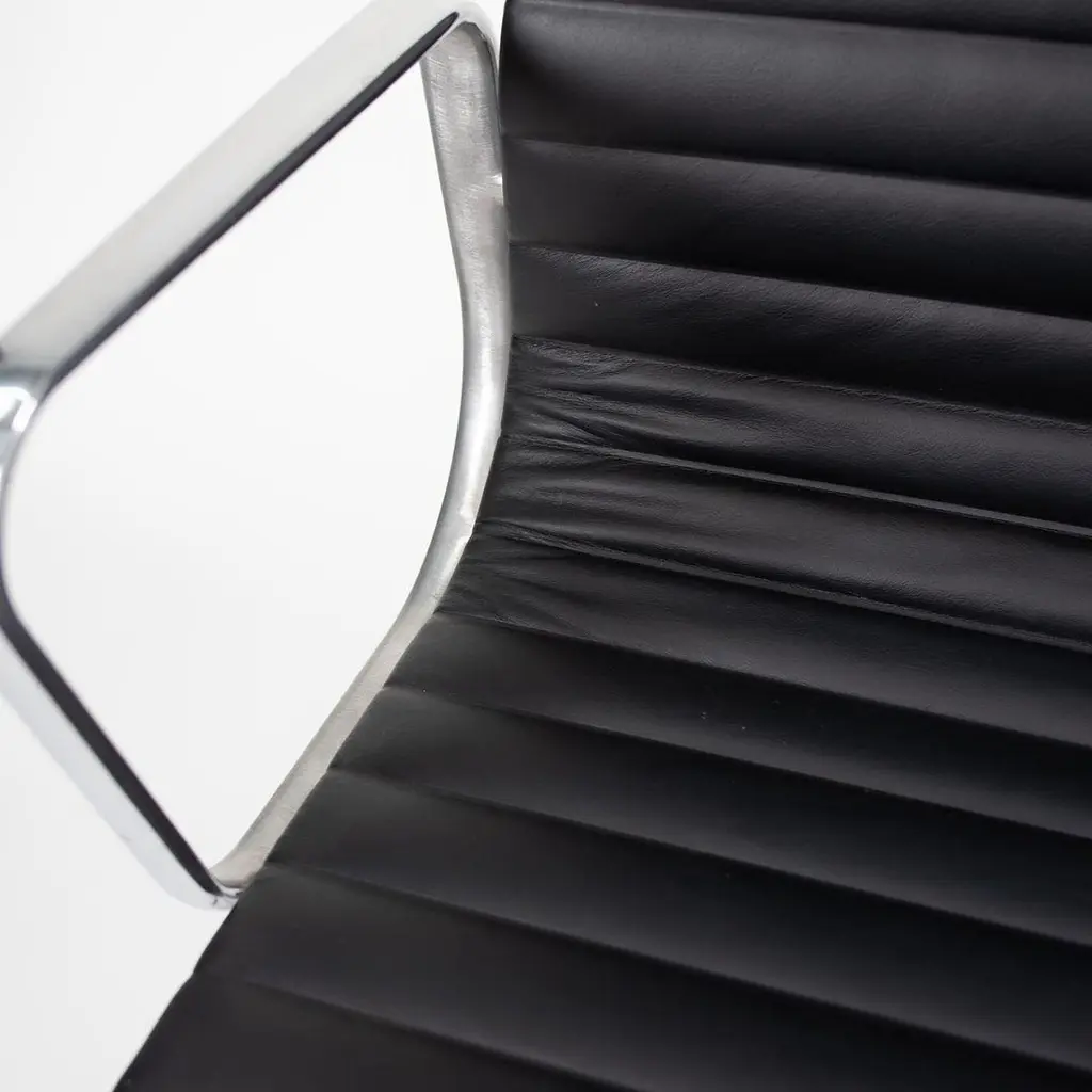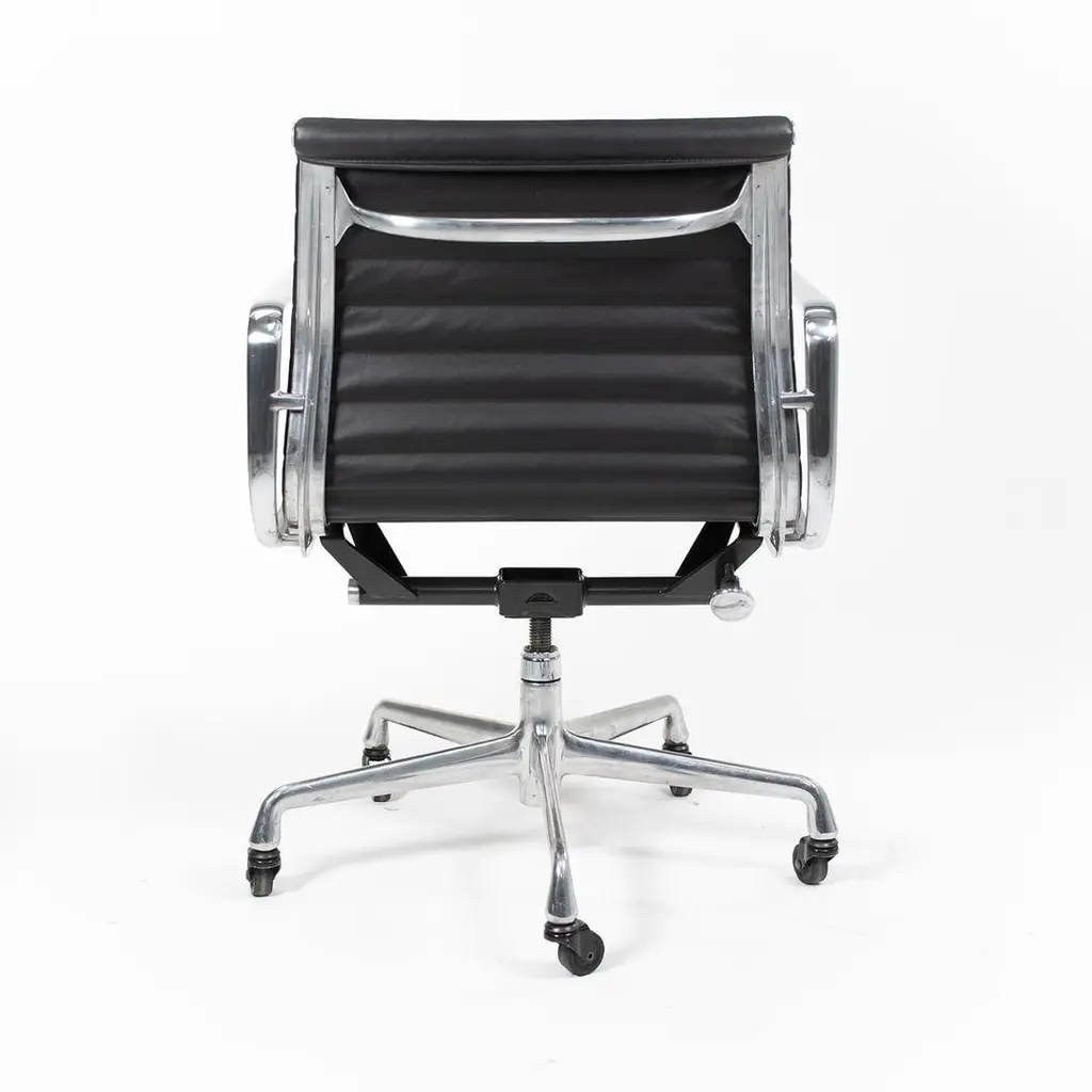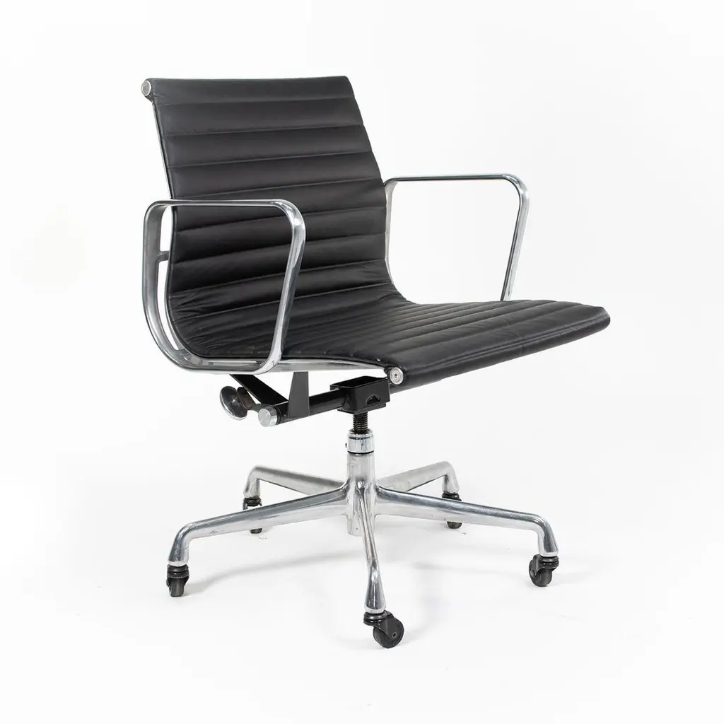 This is a single (multiple chairs are available, though sold individually) Eames Aluminum Group Management Desk Chair, designed by Charles and Ray Eames for Herman Miller in 1958. This particular chair was produced circa 2010s. The design sports a solid yet lightweight aluminum frame and is extremely well-made. The upholstery is done in a handsome smooth black leather. It has a tilt feature with locking capability and a full 360-degree swivel. The price listed is for one chair. Multiple chairs are available for individual purchase. Each chair measures 32.5 inches in height, is 23 inches wide, and is 23 inches in depth. The median seat height is 18.5 inches and it has a 3 inch height adjustment range. Condition overall is very good to excellent, with some light signs of wear to the frame to be expected. The upholstery is seemingly near immaculate and looks as though it's never been sat on. The arms are also in exceptionally nice condition. See photos.