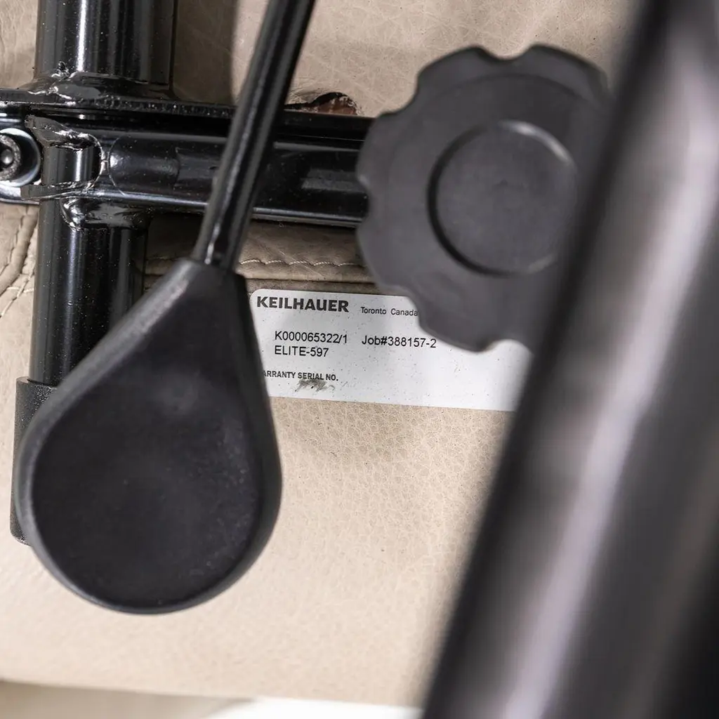 These are Elite Desk Chairs, Model 597-5, designed by Ed Keilhauer for Keilhauer in 1983. The listed price includes one chair, and we have several pieces available for purchase. Their design features a mid-height back with an underlying seat of plywood, and has thick foam cushions on its seat and back. They have a steel frame with a pneumatic height adjustment, with upholstered arms and a swivel and tilt function. Their upholstery is done in a tumbled ecru leather. Each chair measures 30 inches deep, 26.5 inches wide, and 36.75 inches at lowest height. Their height is adjustable up to 40.75 inches. Their seat height varies between 17 inches at lowest, and 21 inches at its highest level. The arm height varies between 24.75 inches and 28.75 inches. These chairs are all in terrific shape, with some slight scratches and scuffs on bases, and some darkening of the leather. They roll and swivel smoothly. Overall, these chairs are in very good condition with some signs of use. Please see photos. Genuinely faulty goods will be replaced or money refunded on a case by case basis, however we must be advised of any faulty goods upon receipt of the item. It is the customer's responsibility to pay for return shipping and ship the item back to us. If the item is found to be faulty, we will also refund the postage cost. If there is no damage to the item, but a return is approved, the buyer will be responsible for both the initial and return shipping cost. It is at our discretion to refuse the refund of undamaged goods. If an order is placed and you would like to cancel the order, please notify us immediately. Any refunds will be processed via the same means that payment was made.