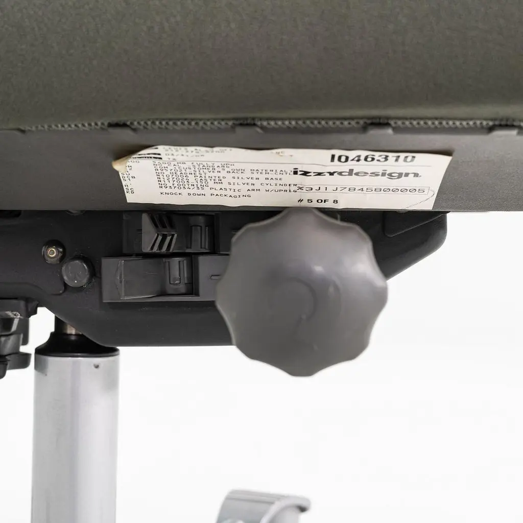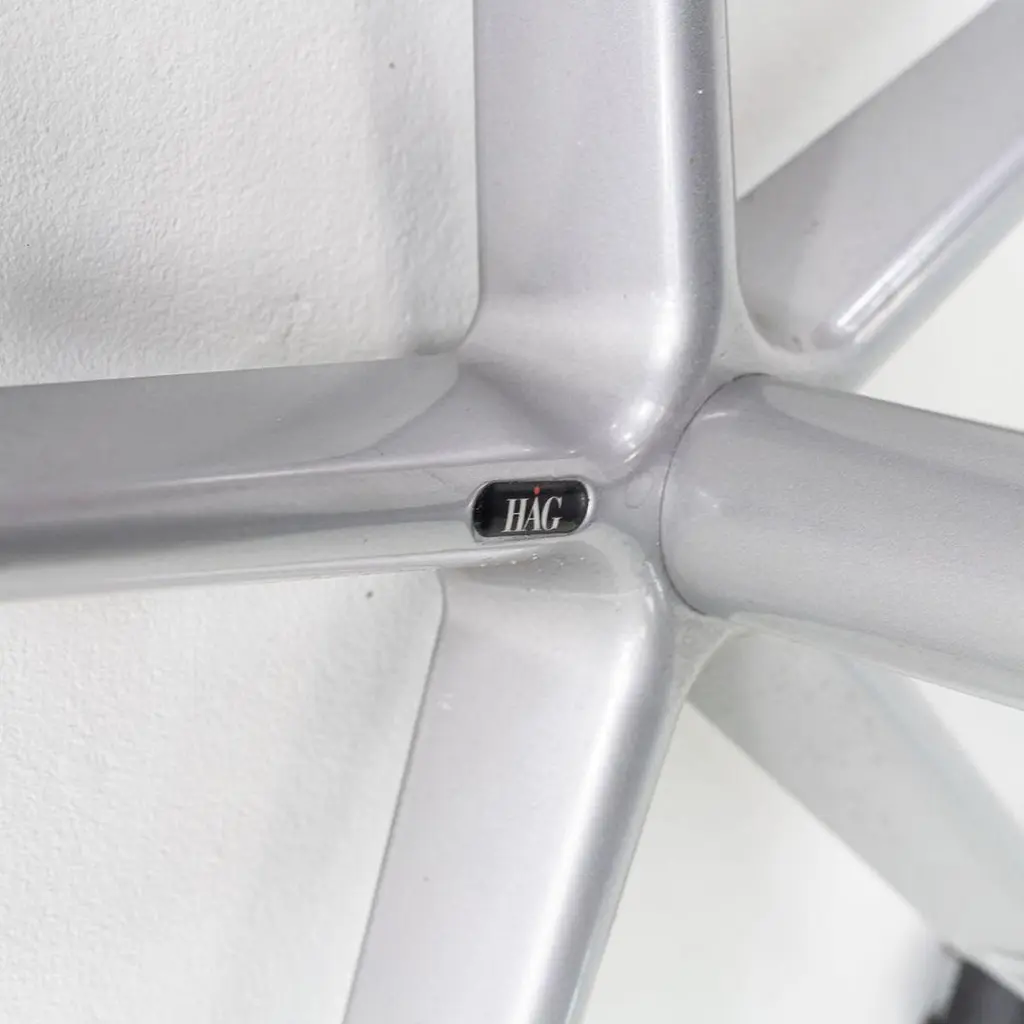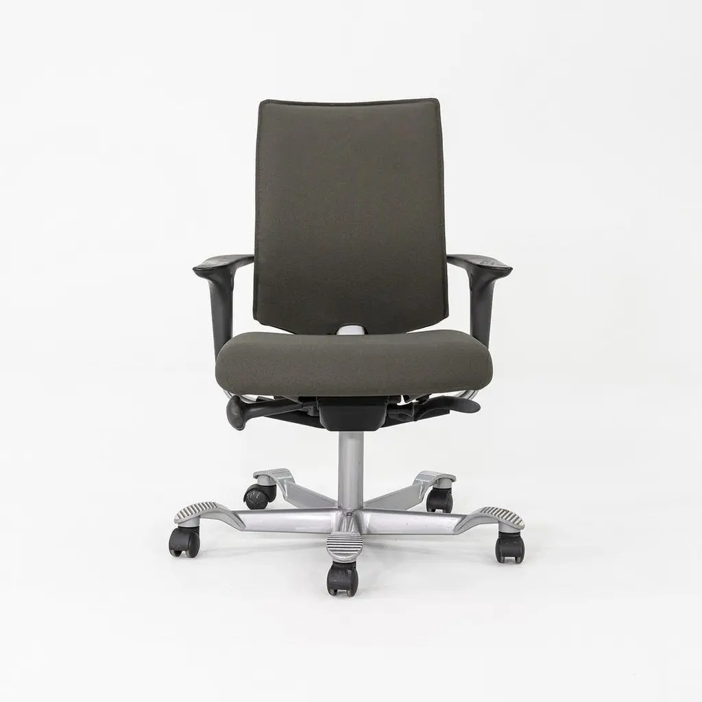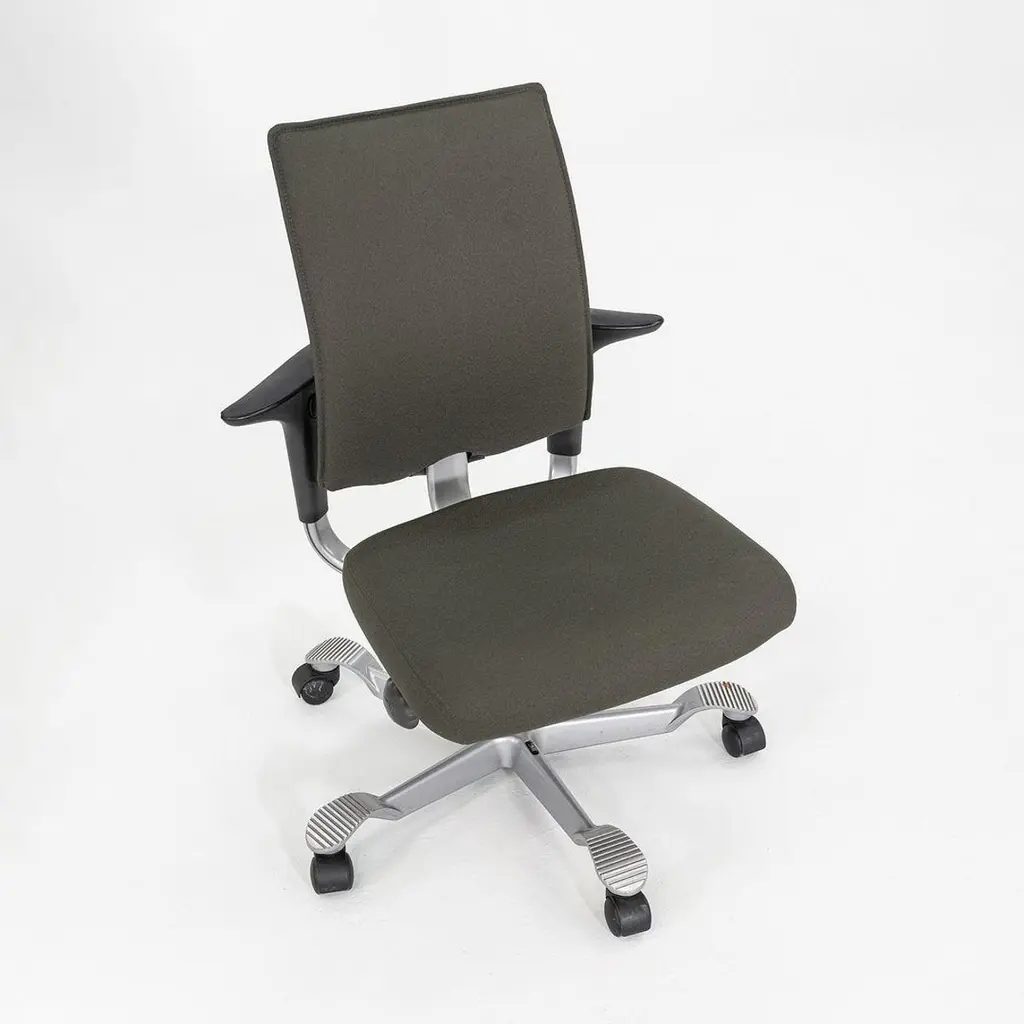 These are H05 Desk Chairs, originally designed by Peter Opsvik for HAG Creed in 2000. These particular examples were produced in Norway in the 2010s. The chairs are comprised of steel, aluminum, plastic, and their seats are upholstered in a green fabric. The design features movable arm rests, as well as lift and seat adjustment mechanisms. The listed price includes one chair and there are two available to purchase. Each chair measures 19.3 inches deep, 17.3 inches wide, and 37.5 inches high with a seat height of 15.5 inches. These pieces do show some light wear from previous use including minor surface blemishes on the fabric and base. Overall, they are in very good condition. Please see photos.