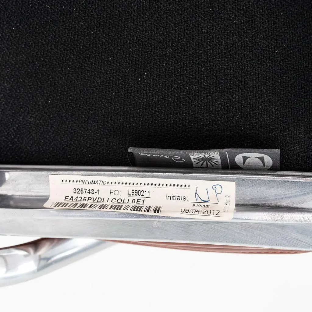 This is an Eames Aluminum Group Soft Pad Management Desk Chair, Model EA435, originally designed by Charles and Ray Eames for Herman Miller in 1969. These particular examples date to the the year 2012. The design features a cast aluminum frame with a pneumatic adjustable 5-star base on casters. The seat is upholstered in dark rust leather and features plush cushions that are 2 inches thick. The listed price includes one chair and there are ten available to purchase.The chairs measure 24 inches deep, 22.5 inches wide, and 34 inches high with a seat height of 20.5 inches. These pieces show light wear from previous use, including some creasing in the leather and minor marks on the frames. Overall, the chairs are in very good to excellent condition. Please see photos.