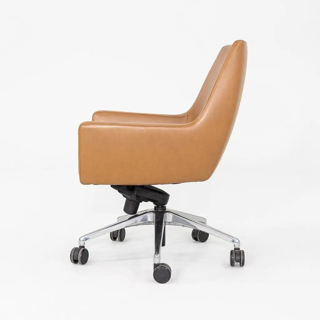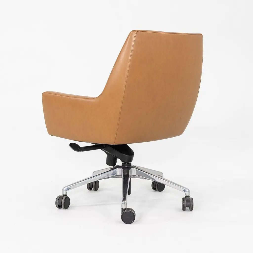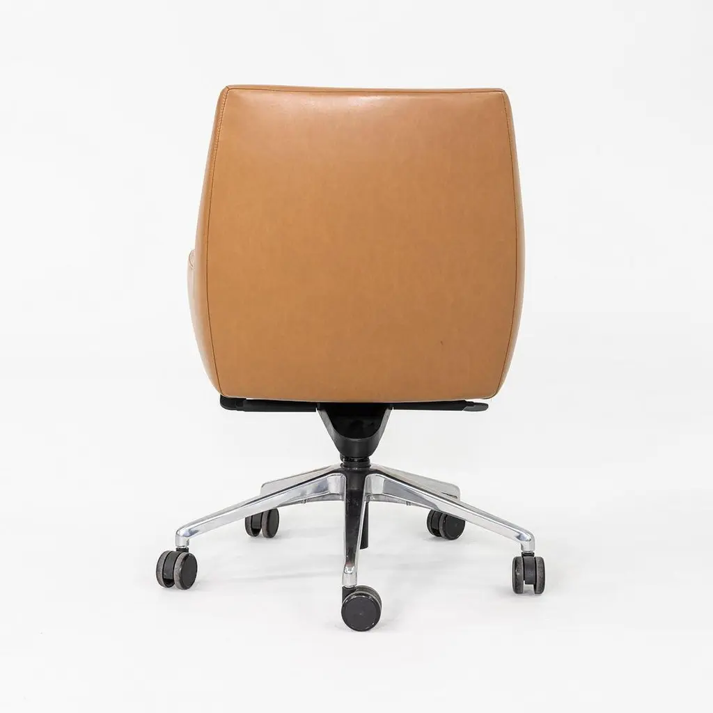 This is a Cardan Swivel Office Desk Chair, originally designed in 2011 by Bernhardt Design. These particular examples were produced in the United States in 2016. Their design includes a 5-star polished aluminum swivel base on dual wheel casters, and these examples have a pneumatic height lift function. The fully-padded shell seats are upholstered in a tan leather.The listed price includes one chair and there are six available to purchase.Each chair measures 26.5 inches deep, 26 inches wide, and is 34 inches high, with a seat height of 17.75 inches. These pieces show light wear, including scuffs and scratches on the base and minor pen marks on the leather. Overall, the chairs are in good to very good condition with light wear. Please see photos.