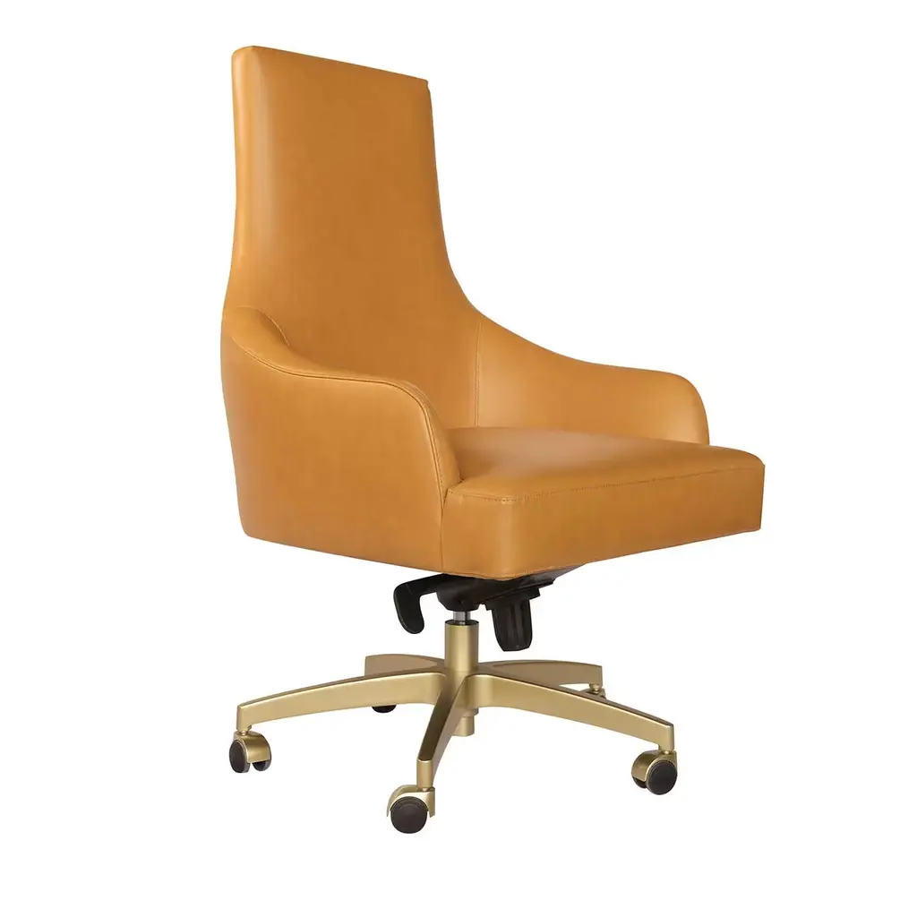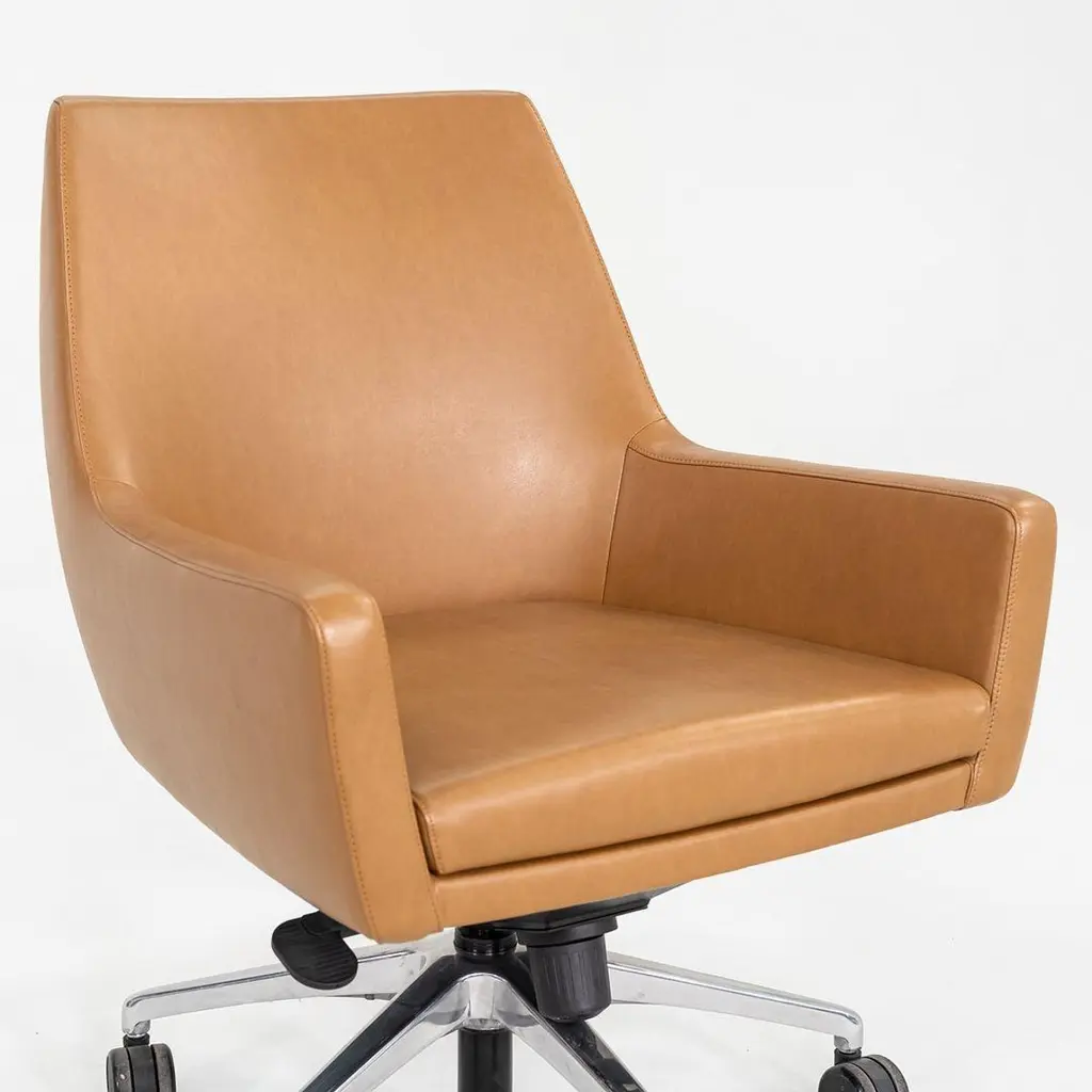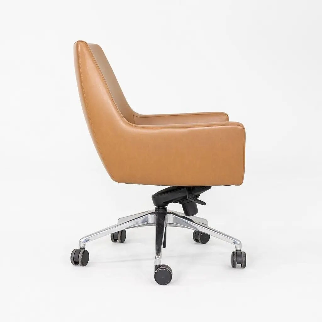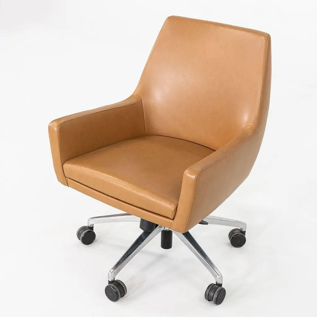This is a Cardan Swivel Office Desk Chair, originally designed in 2011 by Bernhardt Design. These particular examples were produced in the United States in 2016. Their design includes a 5-star polished aluminum swivel base on dual wheel casters, and these examples have a pneumatic height lift function. The fully-padded shell seats are upholstered in a tan leather.The listed price includes one chair and there are six available to purchase.Each chair measures 26.5 inches deep, 26 inches wide, and is 34 inches high, with a seat height of 17.75 inches. These pieces show light wear, including scuffs and scratches on the base and minor pen marks on the leather. Overall, the chairs are in good to very good condition with light wear. Please see photos.
