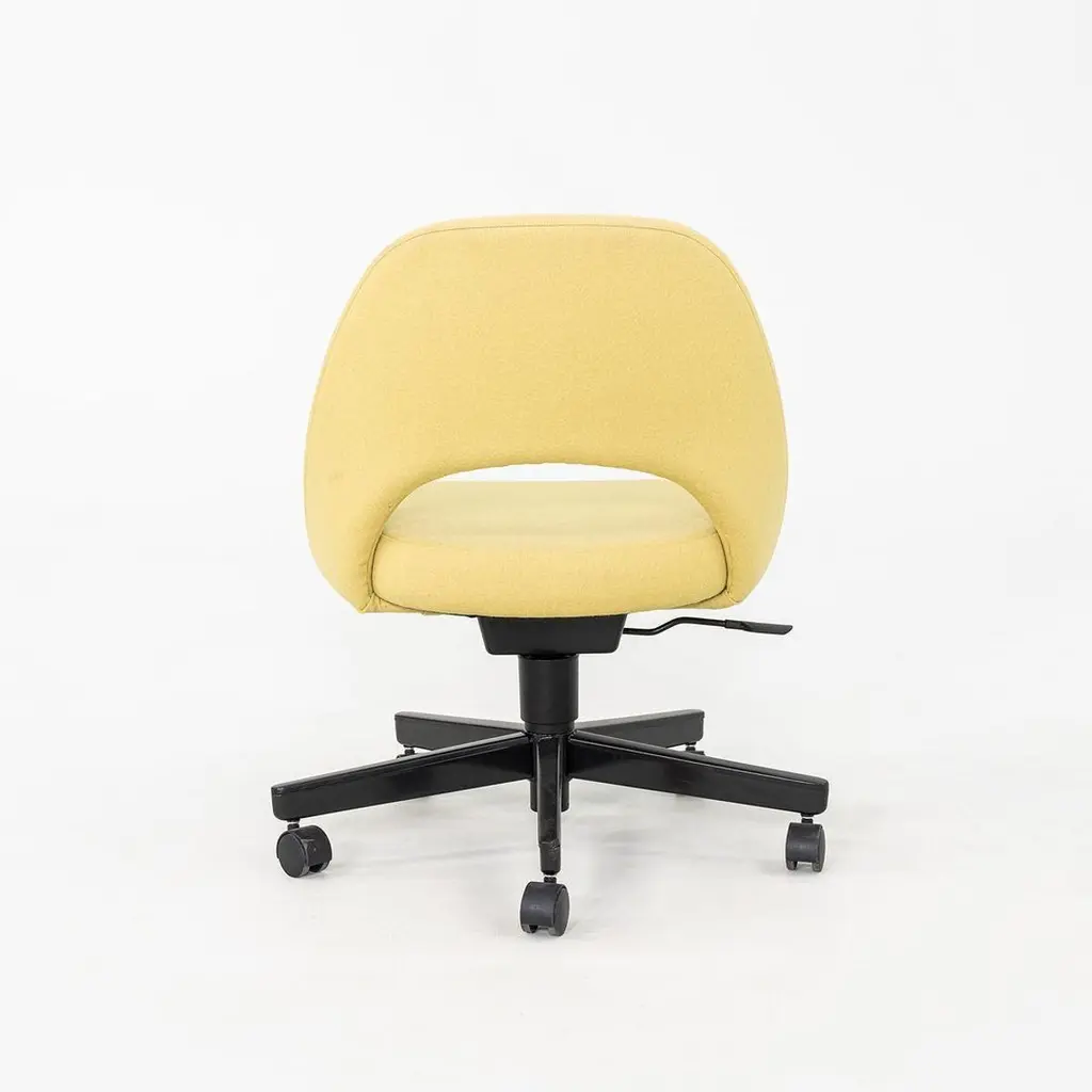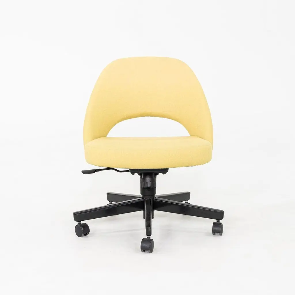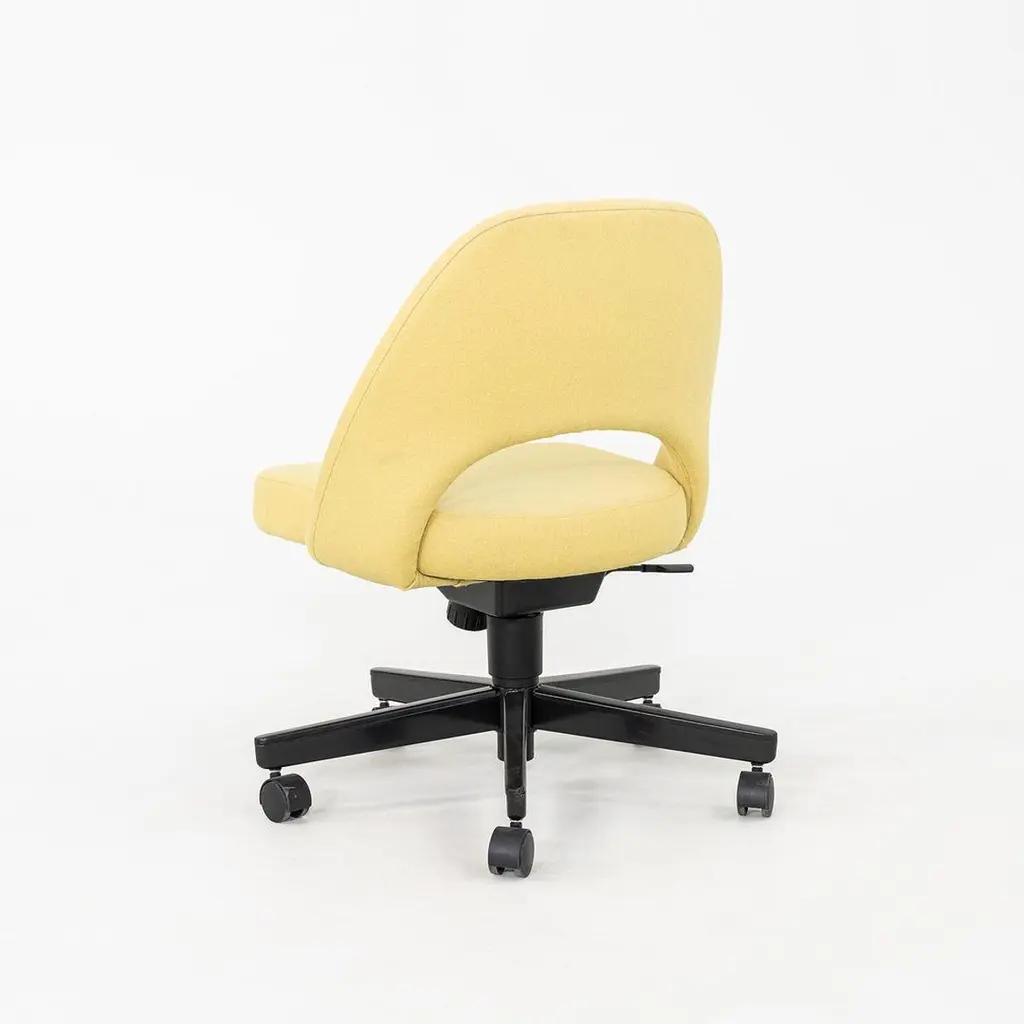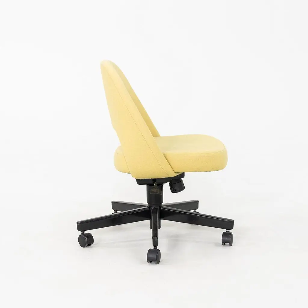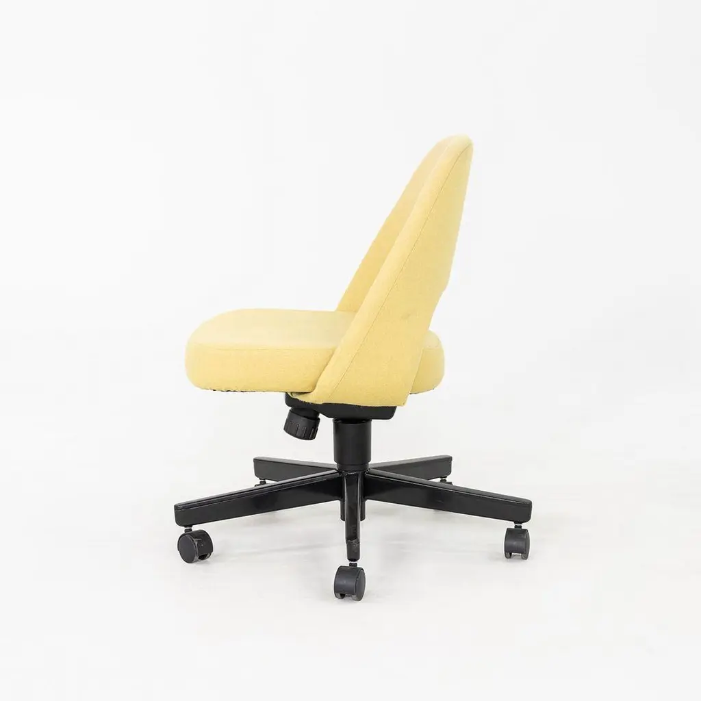 These are Saarinen Executive Armless Desk Chairs with swivel bases, originally designed in 1957 by Eero Saarinen and produced by Knoll. These particular examples were produced in 2017. Their design features a black steel base, and they have upholstered seats in yellow fabric. These examples feature a pneumatic lift base. The listed price includes one chair and there are six available to purchase. Each chair measures 22.5 inches wide, 25 inches deep, and 31 inches high with a seat height of 14.5 inches. These pieces show minor wear from previous use and overall are in very good to excellent condition. Please see photos.