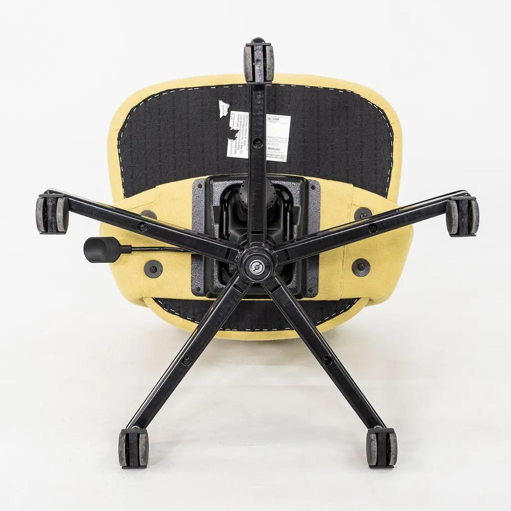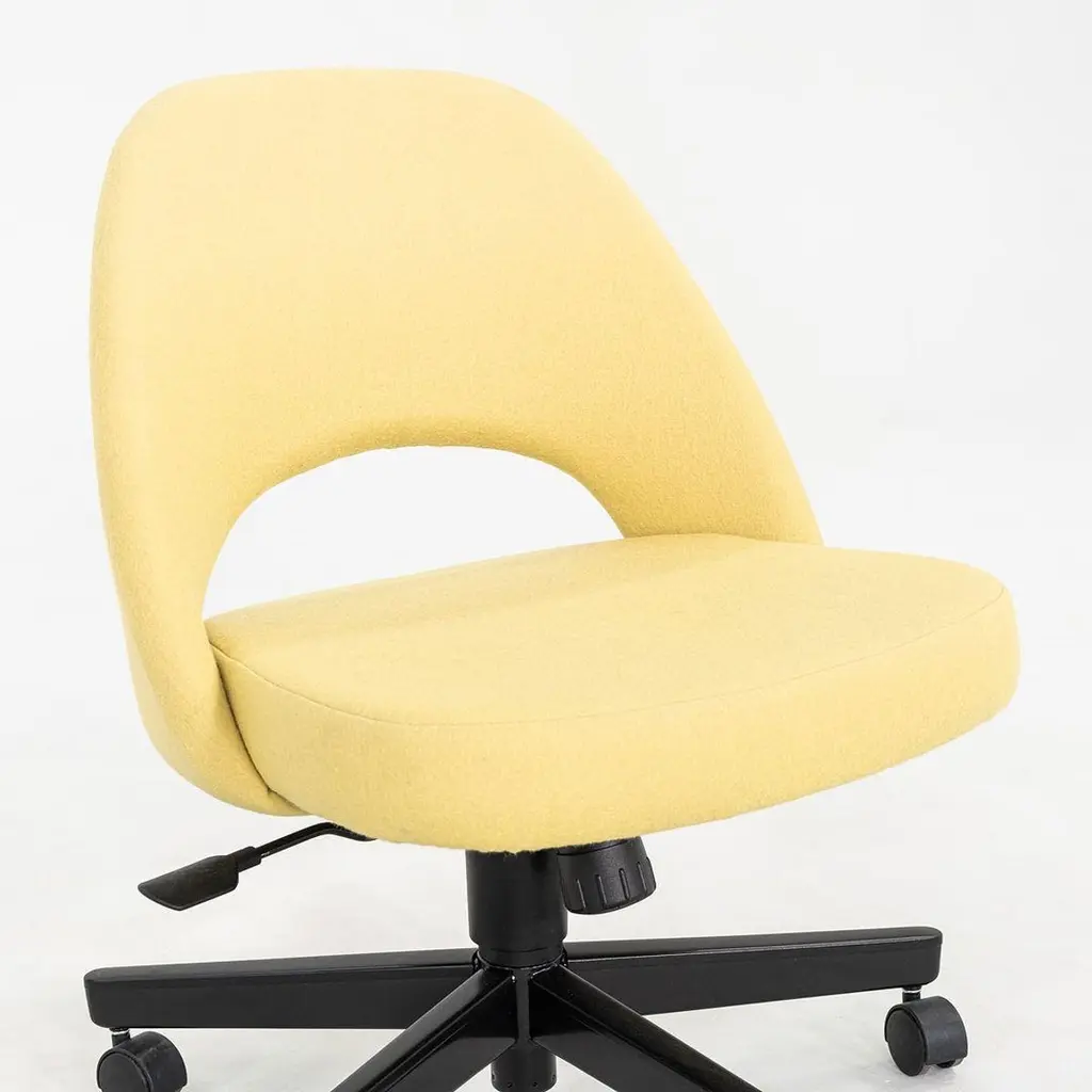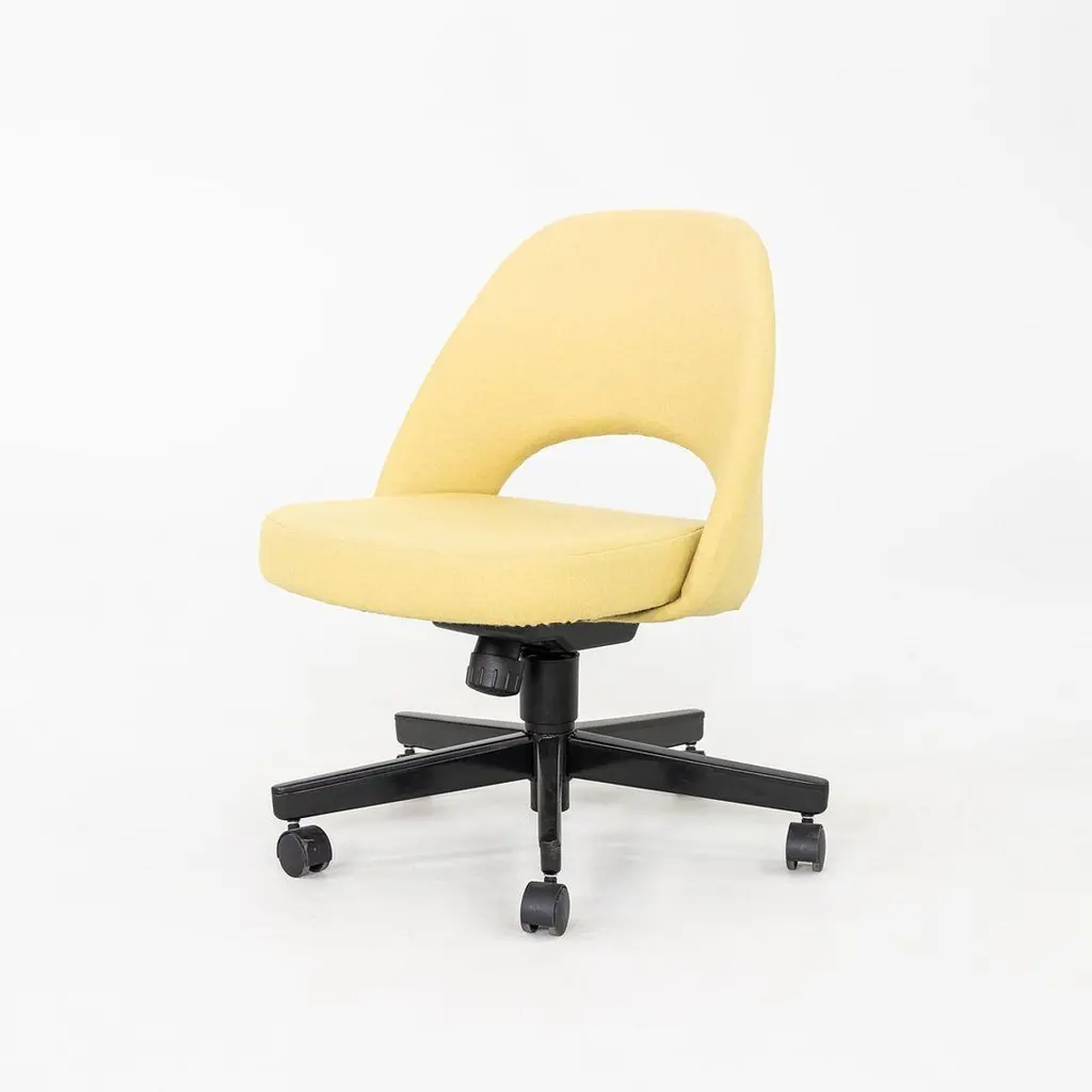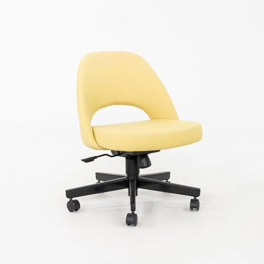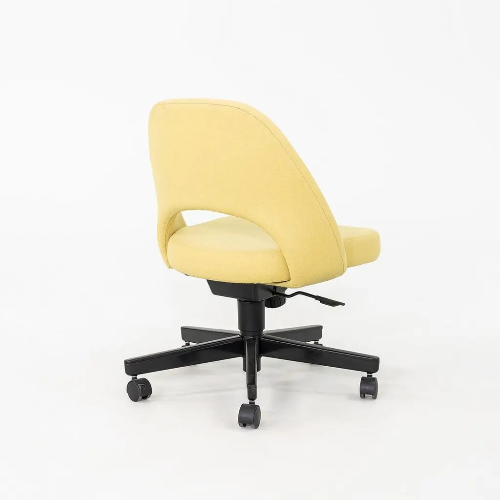 These are Saarinen Executive Armless Desk Chairs with swivel bases, originally designed in 1957 by Eero Saarinen and produced by Knoll. These particular examples were produced in 2017. Their design features a black steel base, and they have upholstered seats in yellow fabric. These examples feature a pneumatic lift base. The listed price includes one chair and there are six available to purchase. Each chair measures 22.5 inches wide, 25 inches deep, and 31 inches high with a seat height of 14.5 inches. These pieces show minor wear from previous use and overall are in very good to excellent condition. Please see photos.