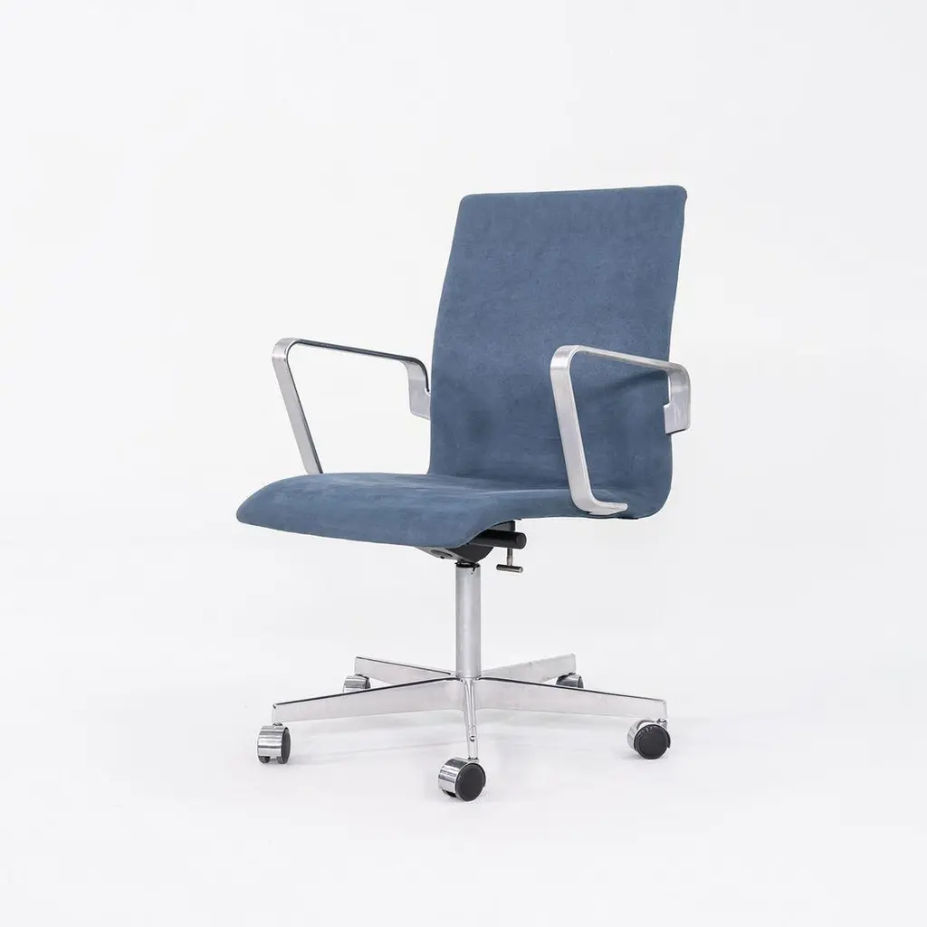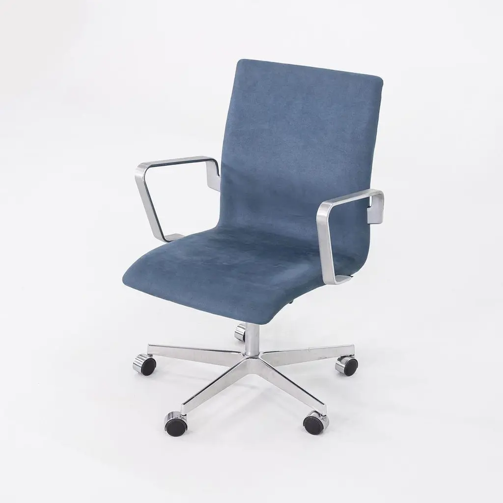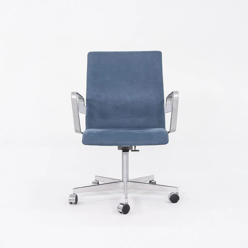 These are Oxford Desk Chairs, Model 3271W, originally designed by Arne Jacobsen in 1965. These particular examples were produced by Fritz Hansen in Poland. They were ordered by an architecture firm for a commercial project and then never put into use. They were produced in 2022 and 2023. The chairs are comprised of a 5-star aluminum base with castors and their seats are upholstered in blue suede. The listed price includes one chair and there are more than 12 available to purchase. Each chair measures 24 inches deep, 24.4 inches wide, and 35 inches high. They have a seat height of 18.1 inches. These pieces show minimal wear and overall are in very good to excellent condition. Please see photos.