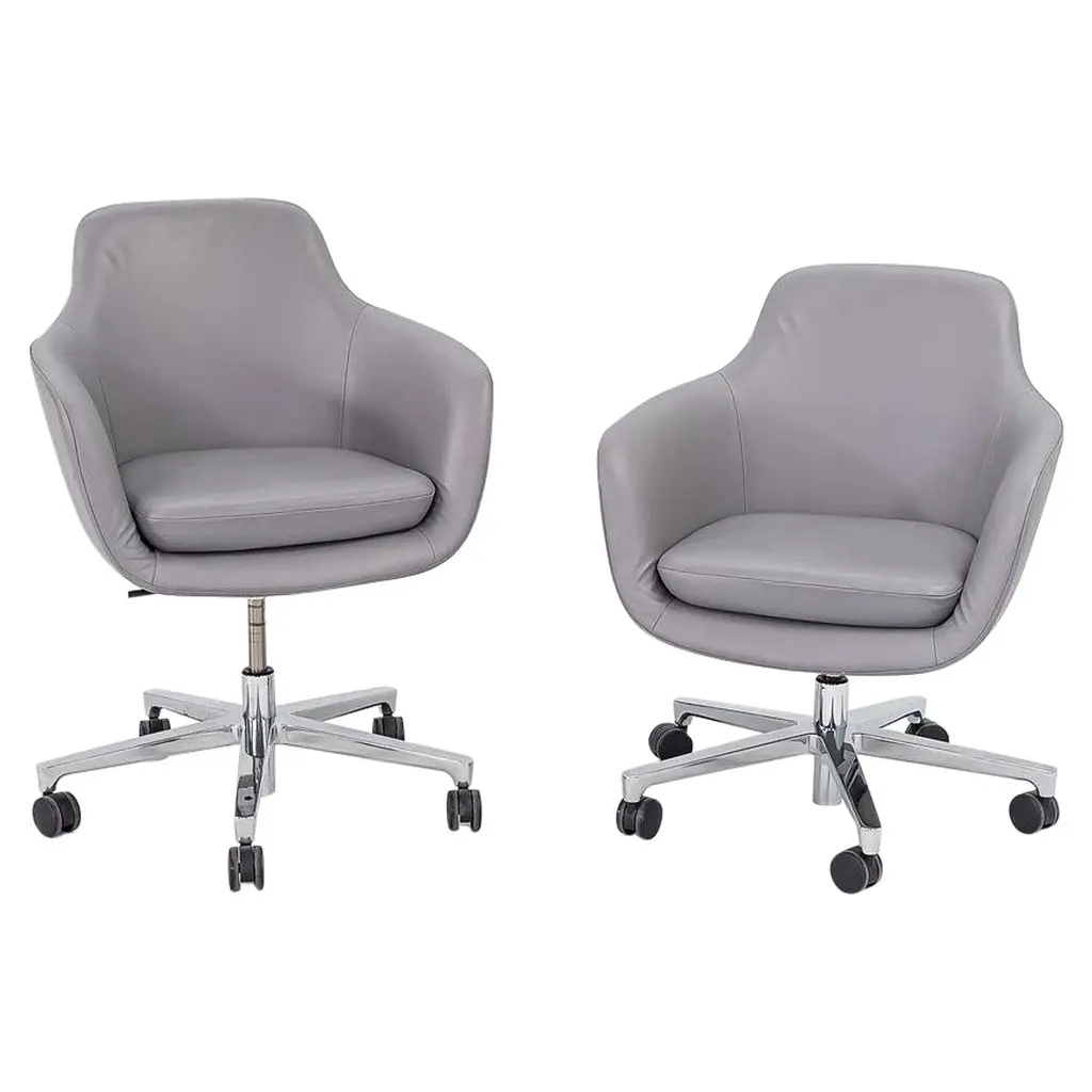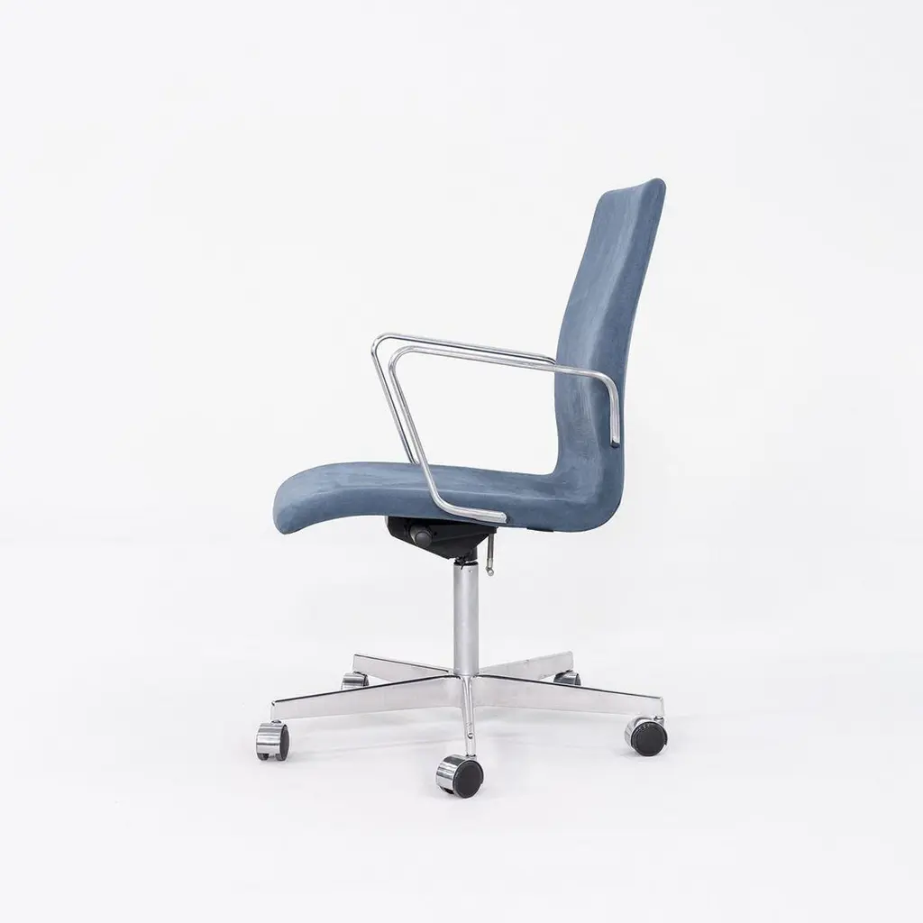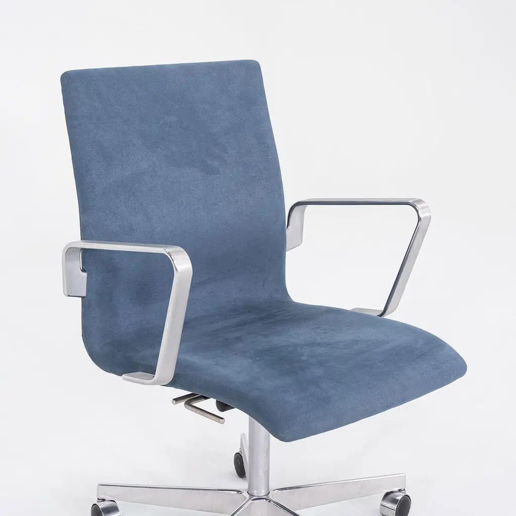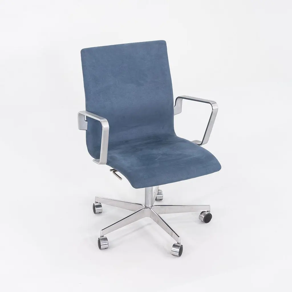 These are Oxford Desk Chairs, Model 3271W, originally designed by Arne Jacobsen in 1965. These particular examples were produced by Fritz Hansen in Poland. They were ordered by an architecture firm for a commercial project and then never put into use. They were produced in 2022 and 2023. The chairs are comprised of a 5-star aluminum base with castors and their seats are upholstered in blue suede. The listed price includes one chair and there are more than 12 available to purchase. Each chair measures 24 inches deep, 24.4 inches wide, and 35 inches high. They have a seat height of 18.1 inches. These pieces show minimal wear and overall are in very good to excellent condition. Please see photos.