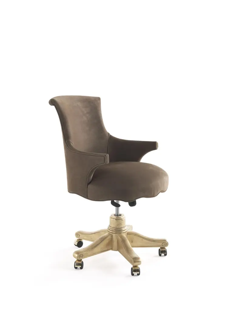 Rivoli is a swivel armchair with armrests, with a welcoming and comfortable shape. The leather upholstery and antique gold finish base help make this chair the perfect complement to prestigious offices.Rivoli executive chair with structure in solid poplar wood. Padding in foam. Upholstery in Brown Nabuk 21.12B. Base finished in antique gold with patina J288O.