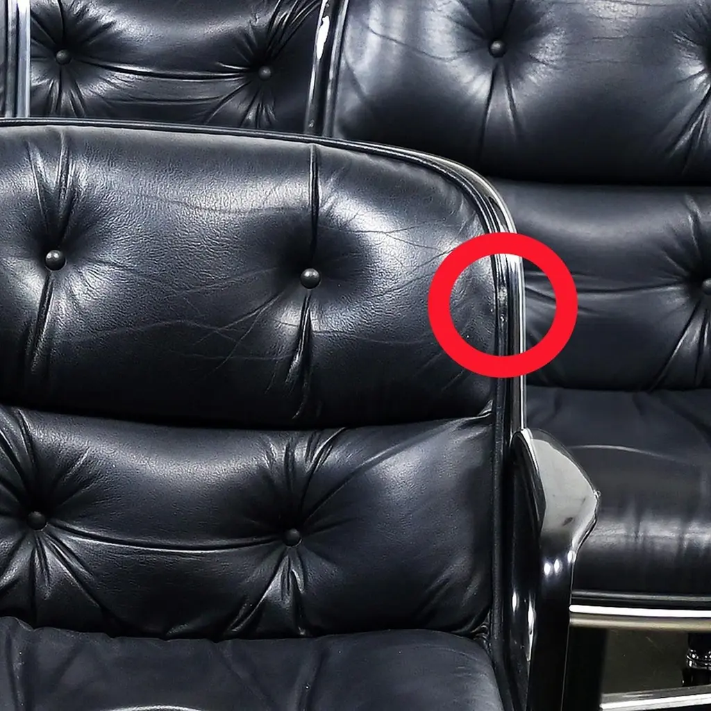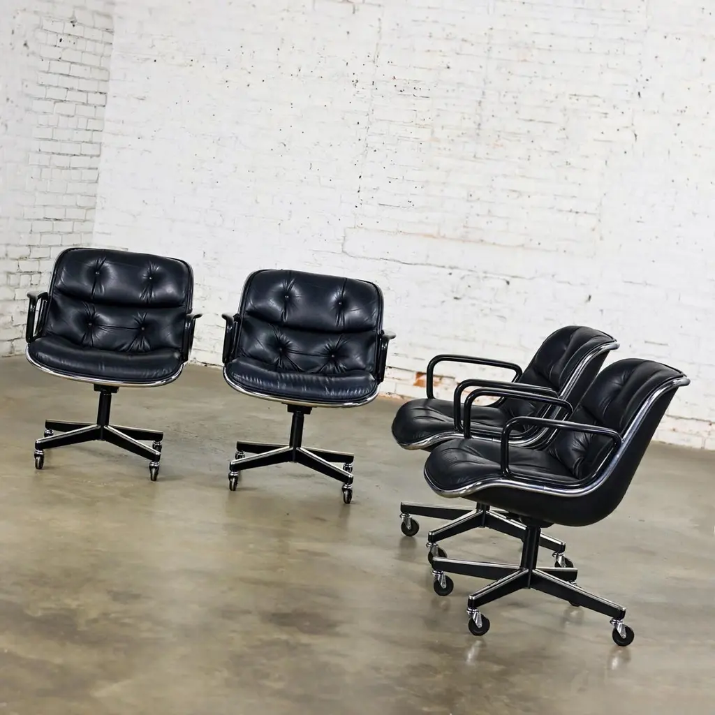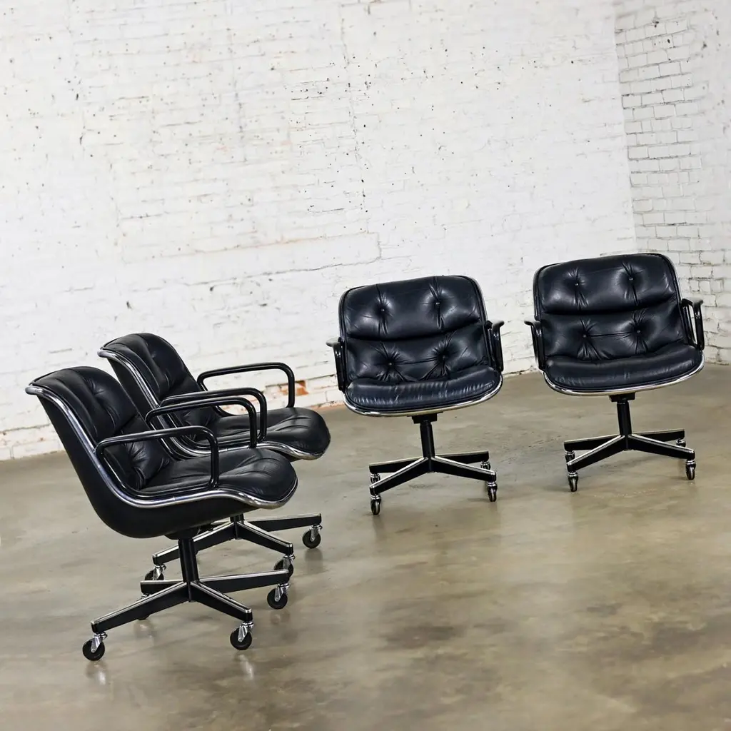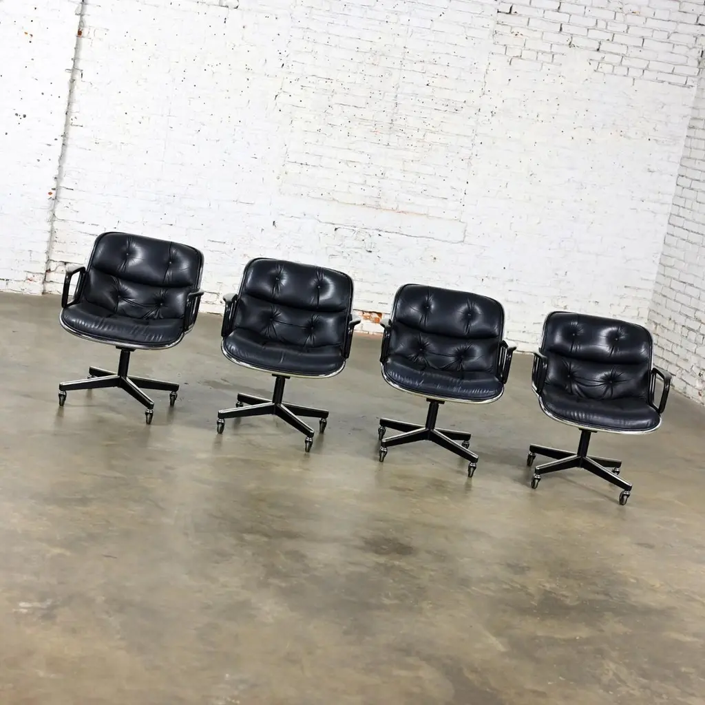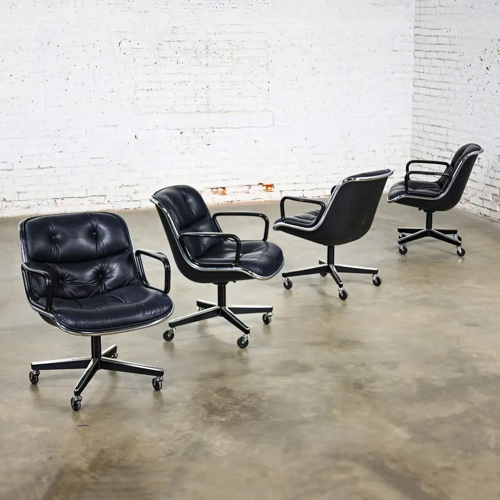 Fabulous MCM (Mid-Century Modern) to Modern Executive armchairs by Charles Pollock for Knoll set of 4. Each chair is comprised of a black leather seat and back with button detail, aluminum band, chrome shaft, black plastic arms, and a 4-prong stainless base with casters. Beautiful condition, keeping in mind that these are vintage and not new so will have signs of use and wear even if it has been refinished or restored. Specifically, no outstanding flaws that we have detected. Please see photos, zoom in for details, and see long description as they are part of the condition report. We attempt to portray any imperfections. Circa, Designed 1963, Production 1986. NOTE: We have 13 of these Executive Armchairs by Charles Pollock for Knoll available. We have several listings composed of other groupings here for sale, check them out!! We will also send you a photo of the exact chair you would be getting so you can examine and approve prior to shipping.Talk about a FAB FOUR!!! Did someone say Charles Pollock for KNOLL??? YES, PLEASE!!!! Without a doubt, this is JUST the classic chair set you have been looking for! I mean, what’s not to love? First off, they’re designed by the iconic Charles Pollock…. for the ELITE Knoll Furniture, and they bear a quintessential Mid Century Modern to Modern CLASSIC style sure to withstand the hands of time. And as if that’s not enough to entice you, let’s talk about the epic 4-prong base with stainless arms and painted black sides, gorgeous casters, and cylindrical chrome shaft! The ergonomically pleasing bucket style seat is wrapped in sultry, rich black leather with a button detail on the seat and back, and it has precisely complacent black plastic arms. The entire bucket seat is surrounded by an aluminum band that was described by Charles Pollock as “rim technology.” Which he created to hold the entire design together both structurally and visually. This design was first introduced in 1963 and is an appealing and sought-after look still today. This exemplary office chair is both stylish and comfortable. They could be just what you need for your new home office, around a game table or breakfast nook, or as extra seating in your living or family room. Whether you have a mid-century modern home, an industrial loft, modern country, mountain ranch home, OR an executive position at the office… this design is simply timeless and will blend in beautifully with any décor. It’s Charles Pollock for Knoll folks… you can’t go wrong!!The Pollock Executive Chair was designed for Knoll in 1963 and is among the best-selling executive chairs in the history of office furniture design. Pollock’s connection with Knoll began after he designed a chair in 1963 specifically to introduce them. He remembered… “I had a crummy little apartment on West 25th Street starting in the 1940s,” Pollock once stated in a Bauhaus interview, “With hardly anything to build anything, I built this damn chair with my bare hands. One day, I carried it on an elevator–it’s heavy! –and I was getting off the elevator, and I knocked Florence Knoll down! I just left; I was so embarrassed. I told my psychiatrist, and he said, ‘This is perfect! Now you write her a letter and you say you were so embarrassed and how much you love Knoll and how you worked so hard on this chair.’ And she hired me.” And that’s the beginning of Knoll and the infamous chair designer, Charles Pollock. In addition to designing for Knoll and his Pollock Executive chair collection, he is also well-known for his designs for Bernhardt and the CP Lounge Collection. The Pollock Executive chair for Knoll features what Pollock described as “rim technology” which is the use of a single aluminum band around the chairs perimeter to hold the design together both structurally, and visually. Fifty years after its introduction, the Pollock Chair continues to exude timeless elegance in any home or office.Elite Designer? Check! Iconic Manufacturer? Check! Timeless…Classic Style? Check! These fabulous Executive Armchairs by Charles Pollock for Knoll have ALL the boxes checked!! Now, all you need to do is… make them YOURS!!!Chair Size Each:- Height: 32 Inches- Width: 26.5 Inches- Depth: 28 Inches- Seat Height: 18.5 Inches- Arm Height: 26 Inches- Inside Seat Width: 21.5 Inches- Inside Seat Depth: 18.5 Inches- Inside Back Height: 16.5 Inches- Clearance to floor: 3.25 Inches- Weight: 39.62 PoundsCrated Size:- Length: 62 Inches- Width: 36 Inches- Height: 60 Inches- Weight: 325 Pounds