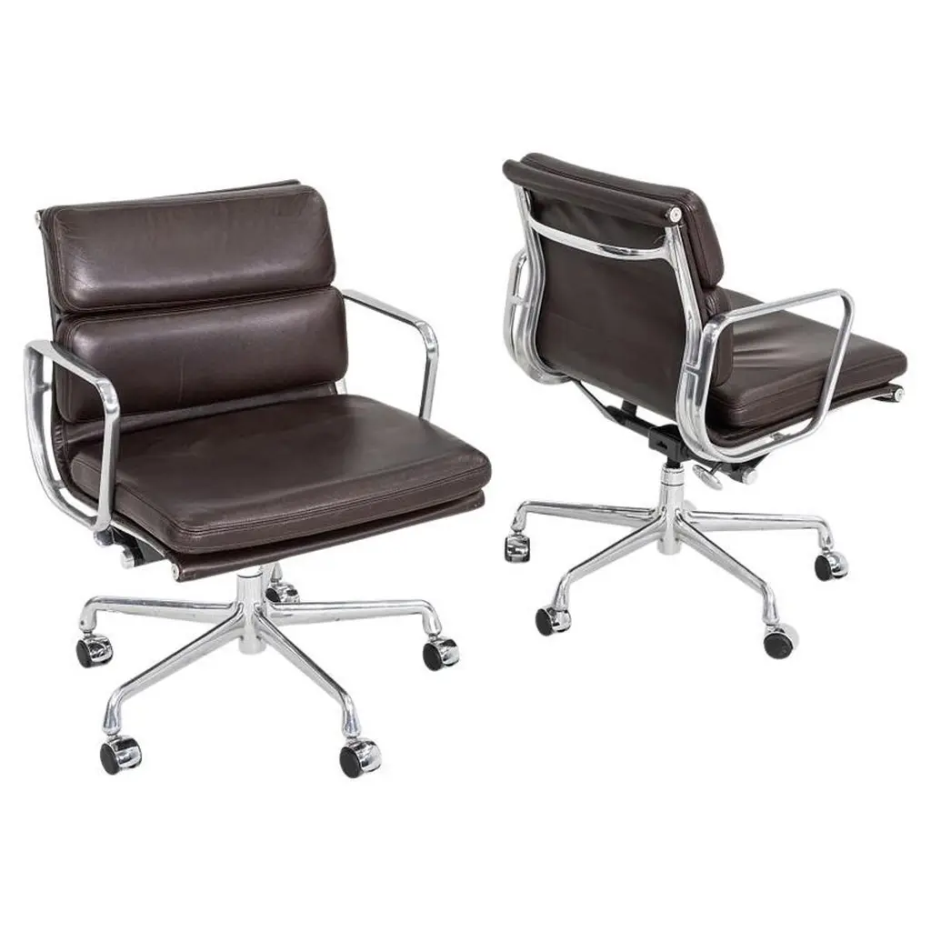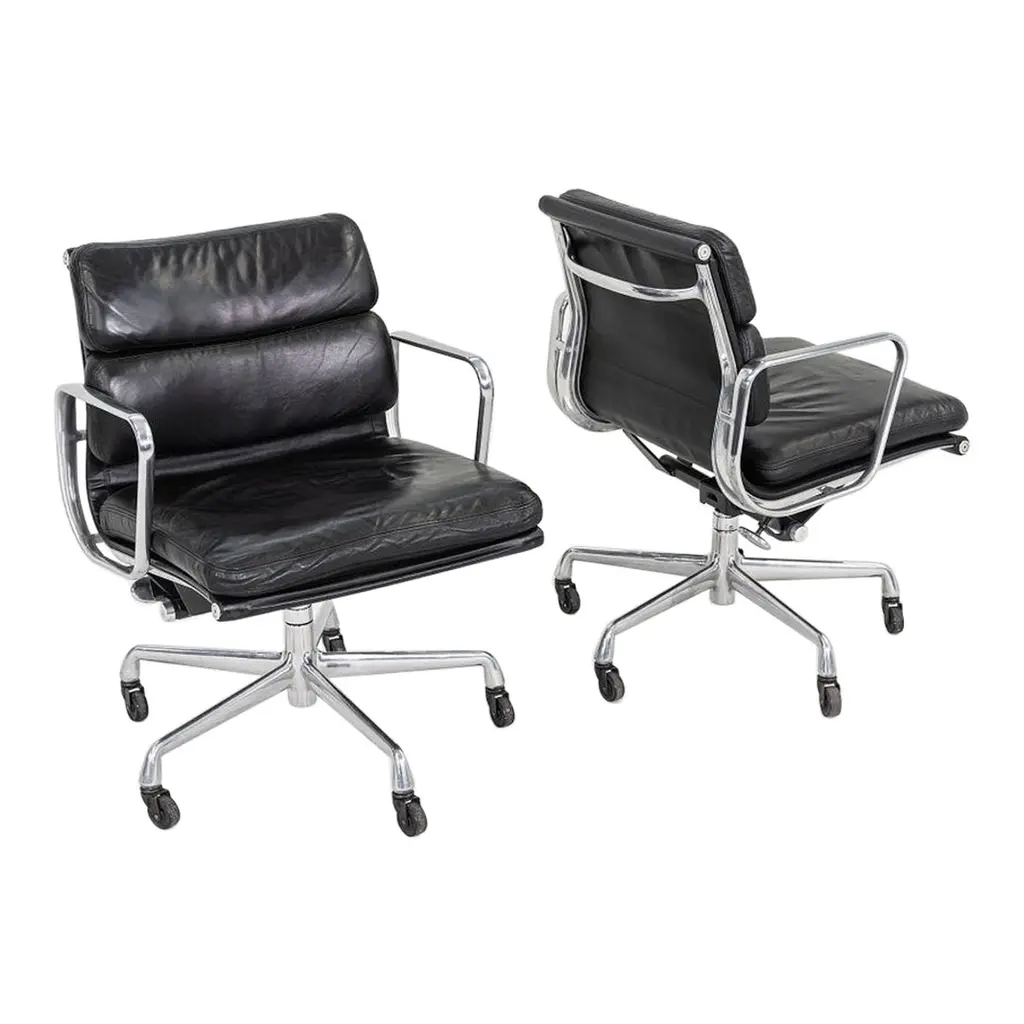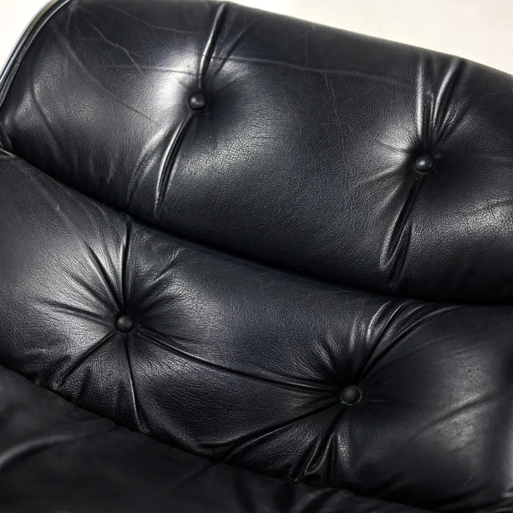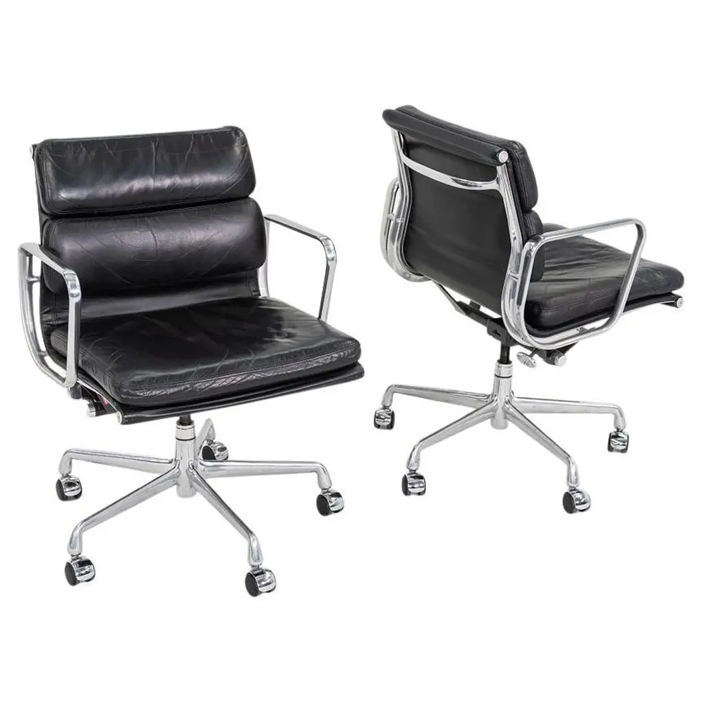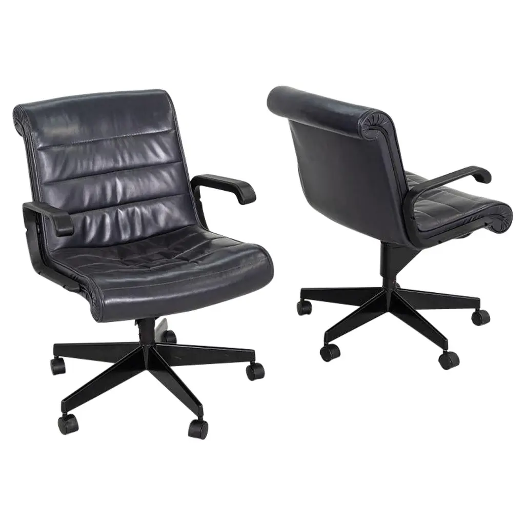 Fabulous MCM (Mid-Century Modern) to Modern Executive armchairs by Charles Pollock for Knoll set of 4. Each chair is comprised of a black leather seat and back with button detail, aluminum band, chrome shaft, black plastic arms, and a 4-prong stainless base with casters. Beautiful condition, keeping in mind that these are vintage and not new so will have signs of use and wear even if it has been refinished or restored. Specifically, no outstanding flaws that we have detected. Please see photos, zoom in for details, and see long description as they are part of the condition report. We attempt to portray any imperfections. Circa, Designed 1963, Production 1986. NOTE: We have 13 of these Executive Armchairs by Charles Pollock for Knoll available. We have several listings composed of other groupings here for sale, check them out!! We will also send you a photo of the exact chair you would be getting so you can examine and approve prior to shipping.Talk about a FAB FOUR!!! Did someone say Charles Pollock for KNOLL??? YES, PLEASE!!!! Without a doubt, this is JUST the classic chair set you have been looking for! I mean, what’s not to love? First off, they’re designed by the iconic Charles Pollock…. for the ELITE Knoll Furniture, and they bear a quintessential Mid Century Modern to Modern CLASSIC style sure to withstand the hands of time. And as if that’s not enough to entice you, let’s talk about the epic 4-prong base with stainless arms and painted black sides, gorgeous casters, and cylindrical chrome shaft! The ergonomically pleasing bucket style seat is wrapped in sultry, rich black leather with a button detail on the seat and back, and it has precisely complacent black plastic arms. The entire bucket seat is surrounded by an aluminum band that was described by Charles Pollock as “rim technology.” Which he created to hold the entire design together both structurally and visually. This design was first introduced in 1963 and is an appealing and sought-after look still today. This exemplary office chair is both stylish and comfortable. They could be just what you need for your new home office, around a game table or breakfast nook, or as extra seating in your living or family room. Whether you have a mid-century modern home, an industrial loft, modern country, mountain ranch home, OR an executive position at the office… this design is simply timeless and will blend in beautifully with any décor. It’s Charles Pollock for Knoll folks… you can’t go wrong!!The Pollock Executive Chair was designed for Knoll in 1963 and is among the best-selling executive chairs in the history of office furniture design. Pollock’s connection with Knoll began after he designed a chair in 1963 specifically to introduce them. He remembered… “I had a crummy little apartment on West 25th Street starting in the 1940s,” Pollock once stated in a Bauhaus interview, “With hardly anything to build anything, I built this damn chair with my bare hands. One day, I carried it on an elevator–it’s heavy! –and I was getting off the elevator, and I knocked Florence Knoll down! I just left; I was so embarrassed. I told my psychiatrist, and he said, ‘This is perfect! Now you write her a letter and you say you were so embarrassed and how much you love Knoll and how you worked so hard on this chair.’ And she hired me.” And that’s the beginning of Knoll and the infamous chair designer, Charles Pollock. In addition to designing for Knoll and his Pollock Executive chair collection, he is also well-known for his designs for Bernhardt and the CP Lounge Collection. The Pollock Executive chair for Knoll features what Pollock described as “rim technology” which is the use of a single aluminum band around the chairs perimeter to hold the design together both structurally, and visually. Fifty years after its introduction, the Pollock Chair continues to exude timeless elegance in any home or office.Elite Designer? Check! Iconic Manufacturer? Check! Timeless…Classic Style? Check! These fabulous Executive Armchairs by Charles Pollock for Knoll have ALL the boxes checked!! Now, all you need to do is… make them YOURS!!!Chair Size Each:- Height: 32 Inches- Width: 26.5 Inches- Depth: 28 Inches- Seat Height: 18.5 Inches- Arm Height: 26 Inches- Inside Seat Width: 21.5 Inches- Inside Seat Depth: 18.5 Inches- Inside Back Height: 16.5 Inches- Clearance to floor: 3.25 Inches- Weight: 39.62 PoundsCrated Size:- Length: 62 Inches- Width: 36 Inches- Height: 60 Inches- Weight: 325 Pounds