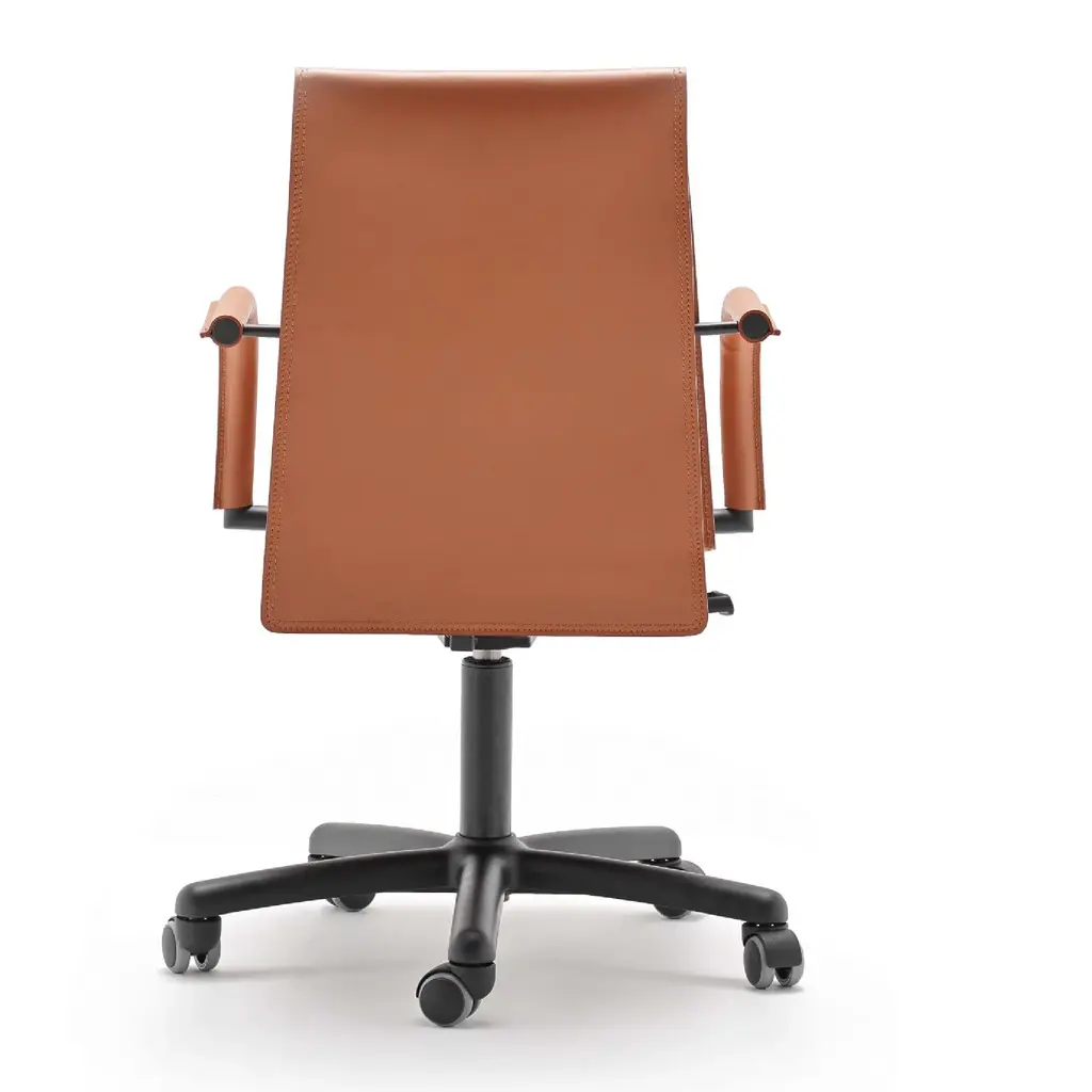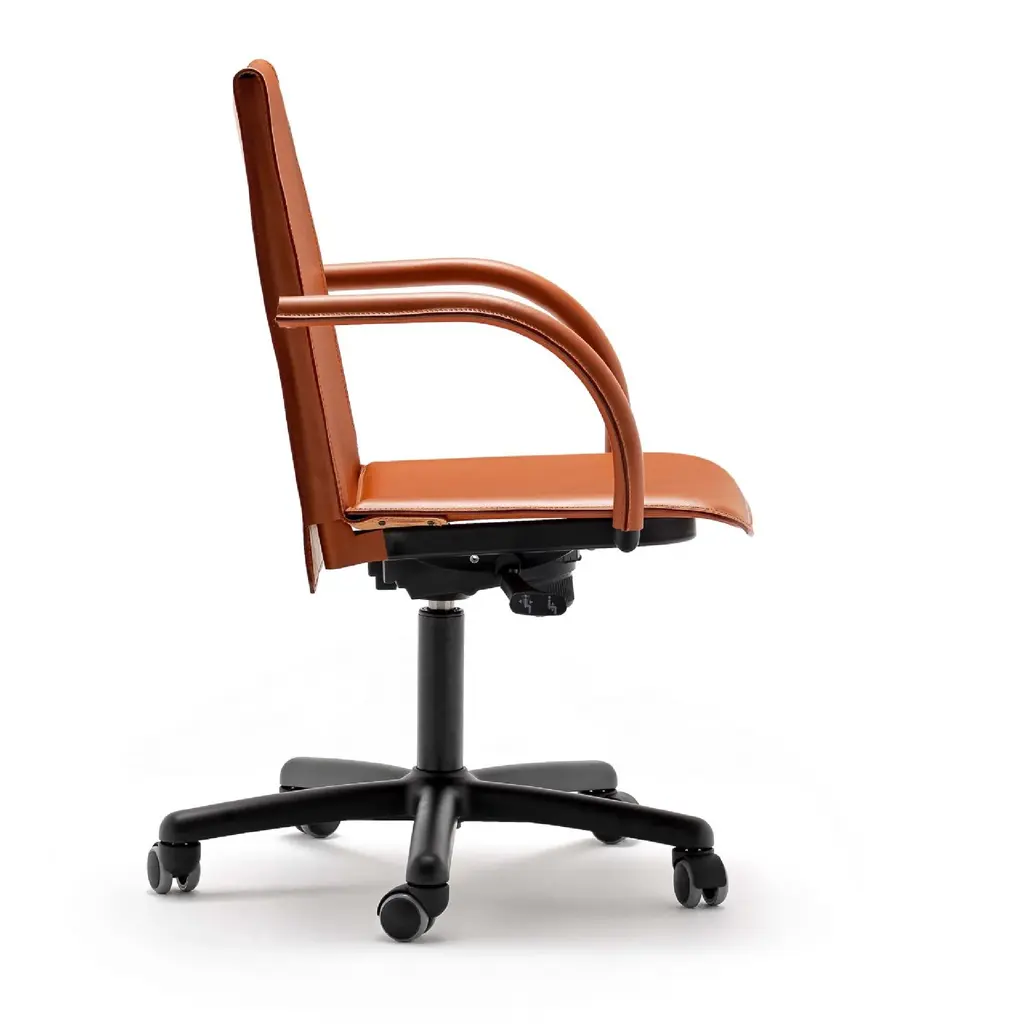 Relaix ABW is the office chair with a swiveling aluminum frame available in various finishes, adjustable height, and a five-wheel base. The shell, made of steel in various finishes, is reclining and features slightly padded multilayer beech wood. The full-grain leather upholstery almost completely envelops the chair, including the armrests.