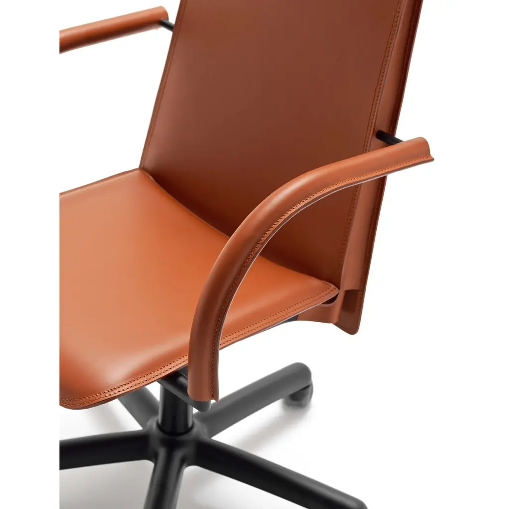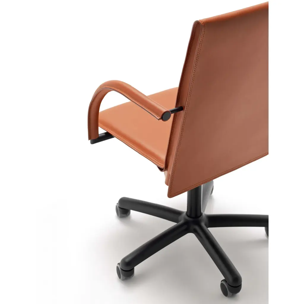Relaix ABW is the office chair with a swiveling aluminum frame available in various finishes, adjustable height, and a five-wheel base. The shell, made of steel in various finishes, is reclining and features slightly padded multilayer beech wood. The full-grain leather upholstery almost completely envelops the chair, including the armrests.