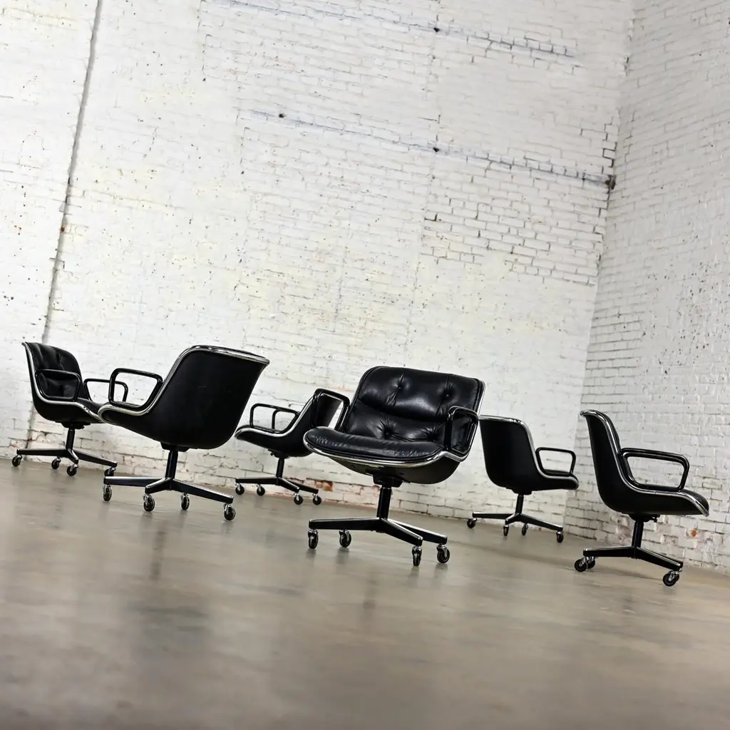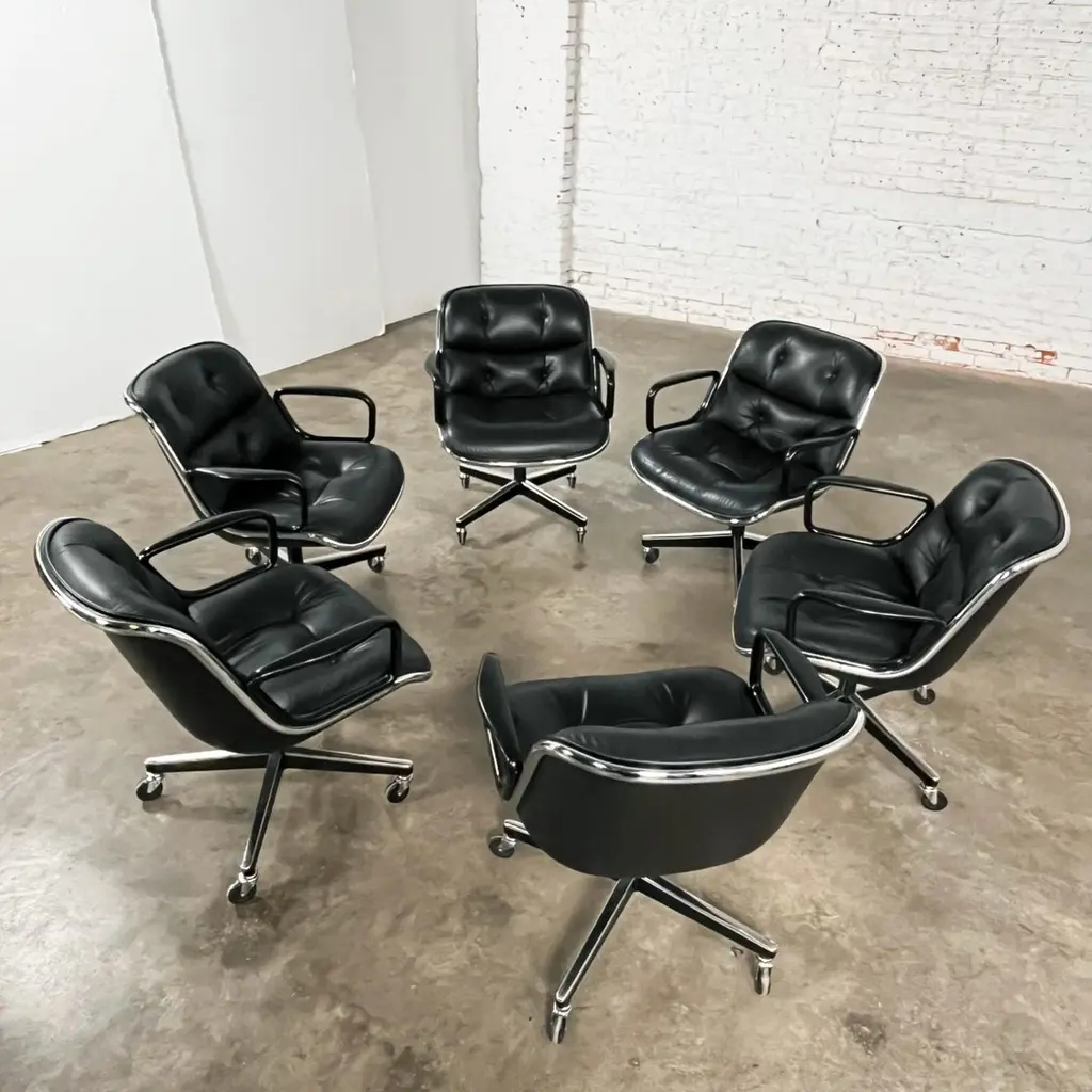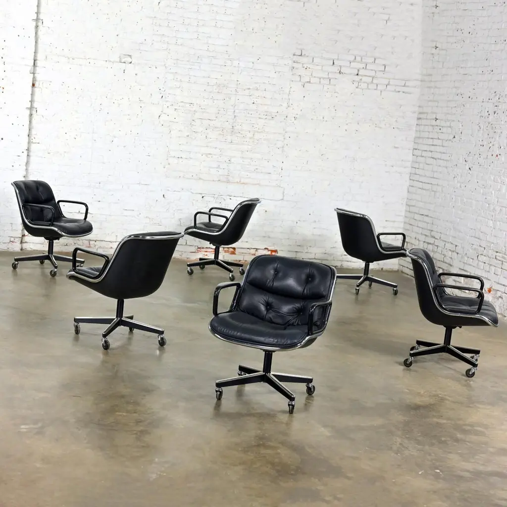 Marvelous MCM (Mid-Century Modern) to Modern Executive armchairs by Charles Pollock for Knoll set of 6. Each chair is comprised of a black leather seat and back with button detail, aluminum band, chrome shaft, black plastic arms, and a 4-prong stainless base with casters. Beautiful condition, keeping in mind that these are vintage and not new so will have signs of use and wear even if it has been refinished or restored. Specifically, no outstanding flaws that we have detected. Please see photos, zoom in for details, and see long description as they are part of the condition report. We attempt to portray any imperfections. Circa, Designed 1963, Production 1986. NOTE: We have 13 of these Executive Armchairs by Charles Pollock for Knoll available. We have several listings composed of other groupings here for sale, check them out!! We will also send you a photo of the exact chair you would be getting so you can examine and approve prior to shipping.So many cool things come in half-dozens… Donuts, Eggs, and this AWESOME set of Executive Armchairs!!! And…. Did someone say Charles Pollock for KNOLL??? YES, PLEASE!!!! Without a doubt, this is JUST the classic chair set you have been looking for! I mean, what’s not to love? First off, they’re designed by the iconic Charles Pollock…. for the ELITE Knoll Furniture, and they bear a quintessential Mid Century Modern to Modern CLASSIC style sure to withstand the hands of time. And as if that’s not enough to entice you, let’s talk about the epic 4-prong base with stainless arms and painted black sides, gorgeous casters, and cylindrical chrome shaft! The ergonomically pleasing bucket style seat is wrapped in sultry, rich black leather with a button detail on the seat and back, and it has precisely complacent black plastic arms. The entire bucket seat is surrounded by an aluminum band that was described by Charles Pollock as “rim technology.” Which he created to hold the entire design together both structurally and visually. This design was first introduced in 1963 and is an appealing and sought-after look still today. This exemplary office chair is both stylish and comfortable. They could be just what you need for your new home office, around a game table or breakfast nook, or as extra seating in your living or family room. Whether you have a mid-century modern home, an industrial loft, modern country, mountain ranch home, OR an executive position at the office… this design is simply timeless and will blend in beautifully with any décor. It’s Charles Pollock for Knoll folks… you can’t go wrong!!The Pollock Executive Chair was designed for Knoll in 1963 and is among the best-selling executive chairs in the history of office furniture design. Pollock’s connection with Knoll began after he designed a chair in 1963 specifically to introduce them. He remembered… “I had a crummy little apartment on West 25th Street starting in the 1940s,” Pollock once stated in a Bauhaus interview, “With hardly anything to build anything, I built this damn chair with my bare hands. One day, I carried it on an elevator–it’s heavy! –and I was getting off the elevator, and I knocked Florence Knoll down! I just left; I was so embarrassed. I told my psychiatrist, and he said, ‘This is perfect! Now you write her a letter and you say you were so embarrassed and how much you love Knoll and how you worked so hard on this chair.’ And she hired me.” And that’s the beginning of Knoll and the infamous chair designer, Charles Pollock. In addition to designing for Knoll and his Pollock Executive chair collection, he is also well-known for his designs for Bernhardt and the CP Lounge Collection. The Pollock Executive chair for Knoll features what Pollock described as “rim technology” which is the use of a single aluminum band around the chairs perimeter to hold the design together both structurally, and visually. Fifty years after its introduction, the Pollock Chair continues to exude timeless elegance in any home or office.Elite Designer? Check! Iconic Manufacturer? Check! Timeless…Classic Style? Check! These fabulous Executive Armchairs by Charles Pollock for Knoll have ALL the boxes checked!! Now, all you need to do is… make them YOURS!!!Chair Size Each:- Height: 32 Inches- Width: 26.5 Inches- Depth: 28 Inches- Seat Height: 18.5 Inches- Arm Height: 26 Inches- Inside Seat Width: 21.5 Inches- Inside Seat Depth: 18.5 Inches- Inside Back Height: 16.5 Inches- Clearance to floor: 3.25 Inches- Weight: 39.62 PoundsCrated Size:- Length: 88 Inches- Width: 36 Inches- Height: 60 Inches- Weight: 450 Pounds