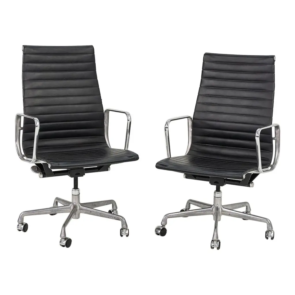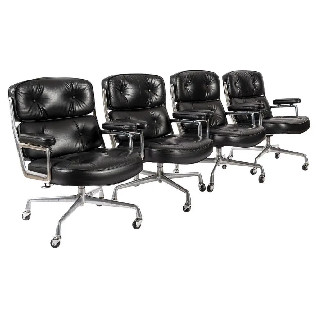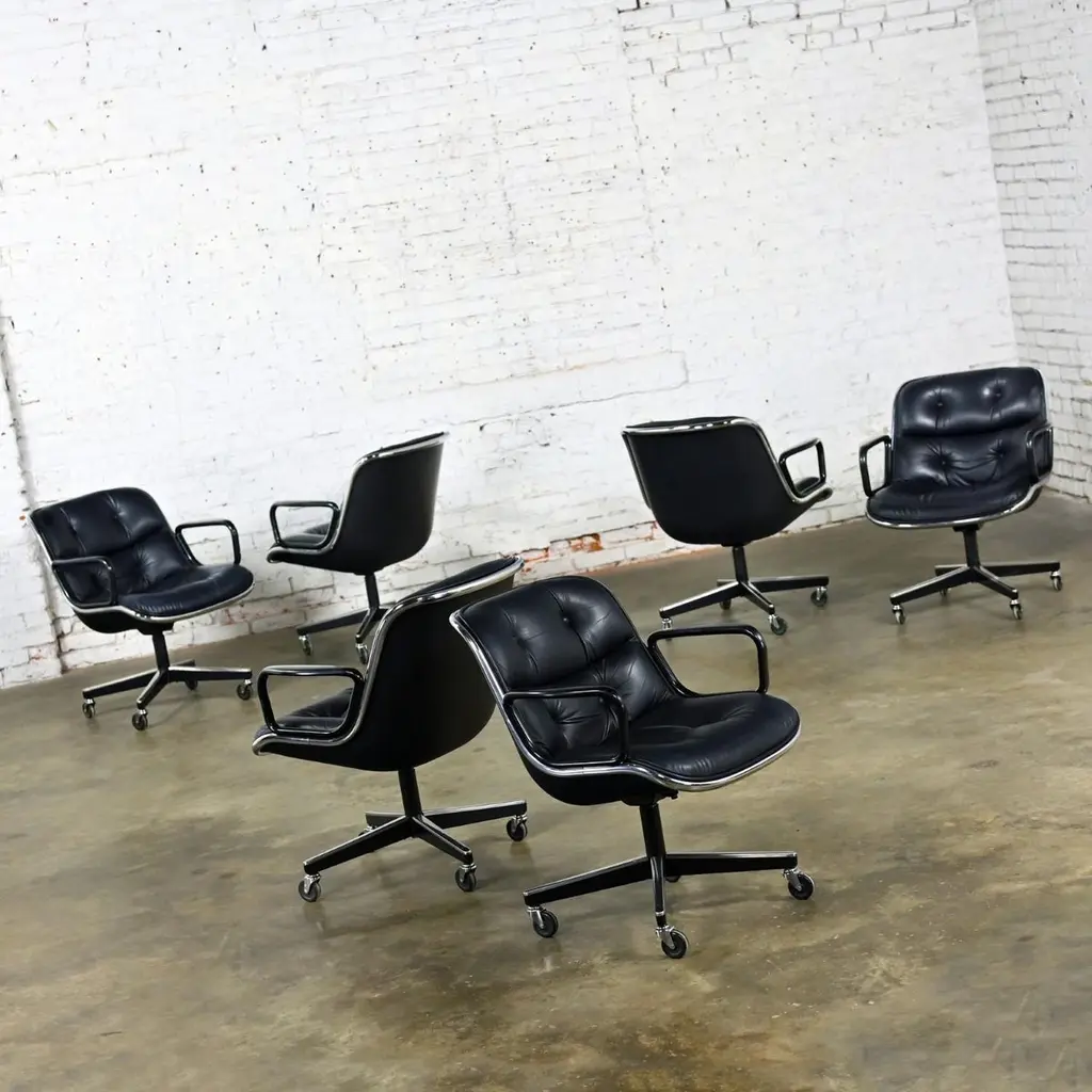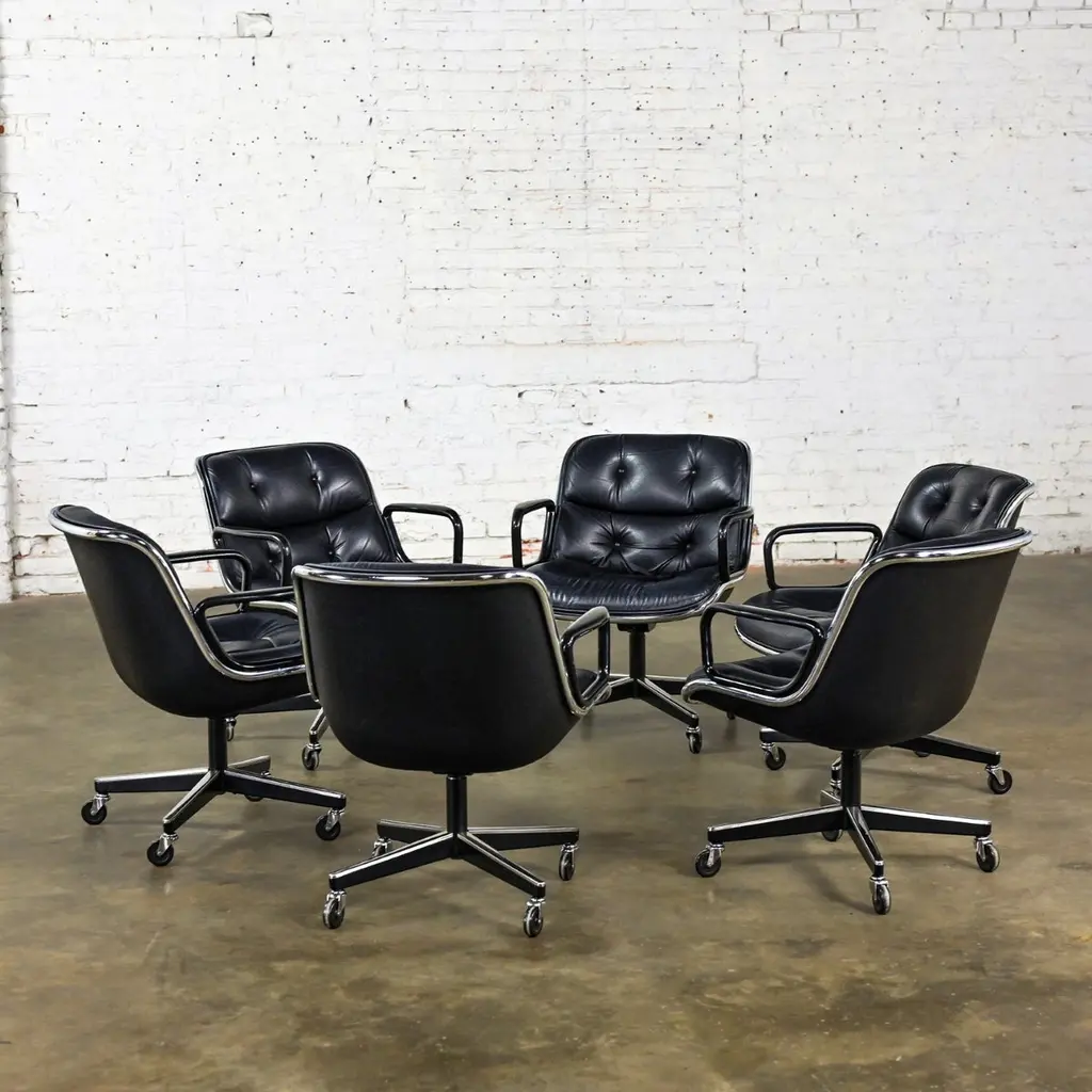 Marvelous MCM (Mid-Century Modern) to Modern Executive armchairs by Charles Pollock for Knoll set of 6. Each chair is comprised of a black leather seat and back with button detail, aluminum band, chrome shaft, black plastic arms, and a 4-prong stainless base with casters. Beautiful condition, keeping in mind that these are vintage and not new so will have signs of use and wear even if it has been refinished or restored. Specifically, no outstanding flaws that we have detected. Please see photos, zoom in for details, and see long description as they are part of the condition report. We attempt to portray any imperfections. Circa, Designed 1963, Production 1986. NOTE: We have 13 of these Executive Armchairs by Charles Pollock for Knoll available. We have several listings composed of other groupings here for sale, check them out!! We will also send you a photo of the exact chair you would be getting so you can examine and approve prior to shipping.So many cool things come in half-dozens… Donuts, Eggs, and this AWESOME set of Executive Armchairs!!! And…. Did someone say Charles Pollock for KNOLL??? YES, PLEASE!!!! Without a doubt, this is JUST the classic chair set you have been looking for! I mean, what’s not to love? First off, they’re designed by the iconic Charles Pollock…. for the ELITE Knoll Furniture, and they bear a quintessential Mid Century Modern to Modern CLASSIC style sure to withstand the hands of time. And as if that’s not enough to entice you, let’s talk about the epic 4-prong base with stainless arms and painted black sides, gorgeous casters, and cylindrical chrome shaft! The ergonomically pleasing bucket style seat is wrapped in sultry, rich black leather with a button detail on the seat and back, and it has precisely complacent black plastic arms. The entire bucket seat is surrounded by an aluminum band that was described by Charles Pollock as “rim technology.” Which he created to hold the entire design together both structurally and visually. This design was first introduced in 1963 and is an appealing and sought-after look still today. This exemplary office chair is both stylish and comfortable. They could be just what you need for your new home office, around a game table or breakfast nook, or as extra seating in your living or family room. Whether you have a mid-century modern home, an industrial loft, modern country, mountain ranch home, OR an executive position at the office… this design is simply timeless and will blend in beautifully with any décor. It’s Charles Pollock for Knoll folks… you can’t go wrong!!The Pollock Executive Chair was designed for Knoll in 1963 and is among the best-selling executive chairs in the history of office furniture design. Pollock’s connection with Knoll began after he designed a chair in 1963 specifically to introduce them. He remembered… “I had a crummy little apartment on West 25th Street starting in the 1940s,” Pollock once stated in a Bauhaus interview, “With hardly anything to build anything, I built this damn chair with my bare hands. One day, I carried it on an elevator–it’s heavy! –and I was getting off the elevator, and I knocked Florence Knoll down! I just left; I was so embarrassed. I told my psychiatrist, and he said, ‘This is perfect! Now you write her a letter and you say you were so embarrassed and how much you love Knoll and how you worked so hard on this chair.’ And she hired me.” And that’s the beginning of Knoll and the infamous chair designer, Charles Pollock. In addition to designing for Knoll and his Pollock Executive chair collection, he is also well-known for his designs for Bernhardt and the CP Lounge Collection. The Pollock Executive chair for Knoll features what Pollock described as “rim technology” which is the use of a single aluminum band around the chairs perimeter to hold the design together both structurally, and visually. Fifty years after its introduction, the Pollock Chair continues to exude timeless elegance in any home or office.Elite Designer? Check! Iconic Manufacturer? Check! Timeless…Classic Style? Check! These fabulous Executive Armchairs by Charles Pollock for Knoll have ALL the boxes checked!! Now, all you need to do is… make them YOURS!!!Chair Size Each:- Height: 32 Inches- Width: 26.5 Inches- Depth: 28 Inches- Seat Height: 18.5 Inches- Arm Height: 26 Inches- Inside Seat Width: 21.5 Inches- Inside Seat Depth: 18.5 Inches- Inside Back Height: 16.5 Inches- Clearance to floor: 3.25 Inches- Weight: 39.62 PoundsCrated Size:- Length: 88 Inches- Width: 36 Inches- Height: 60 Inches- Weight: 450 Pounds