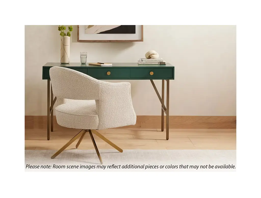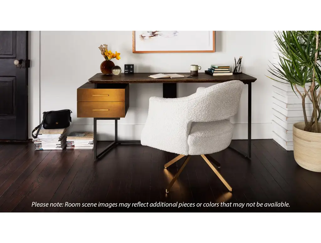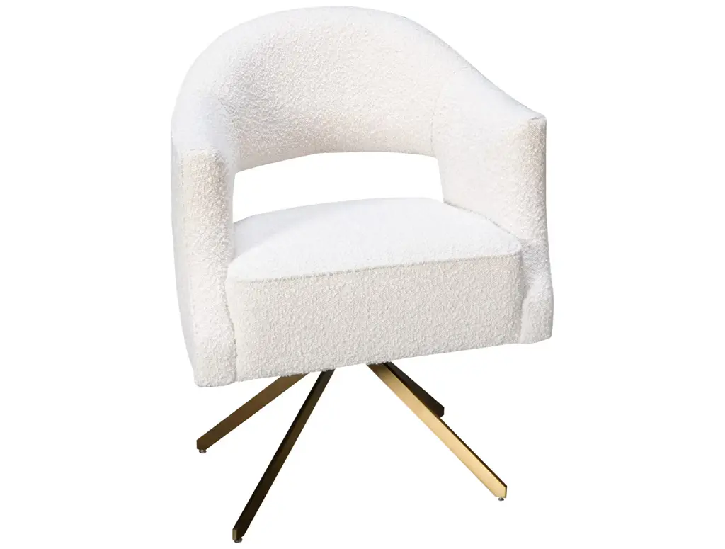 The curvaceous, Art Deco-inspired Adara Desk Chair from Four Hands Furniture hugs you in ultimate comfort with its mod silhouette, and arched back with cutout. The textural boucle-like upholstery makes it super cozy, and it's made even more chic with its splayed golden metal legs.