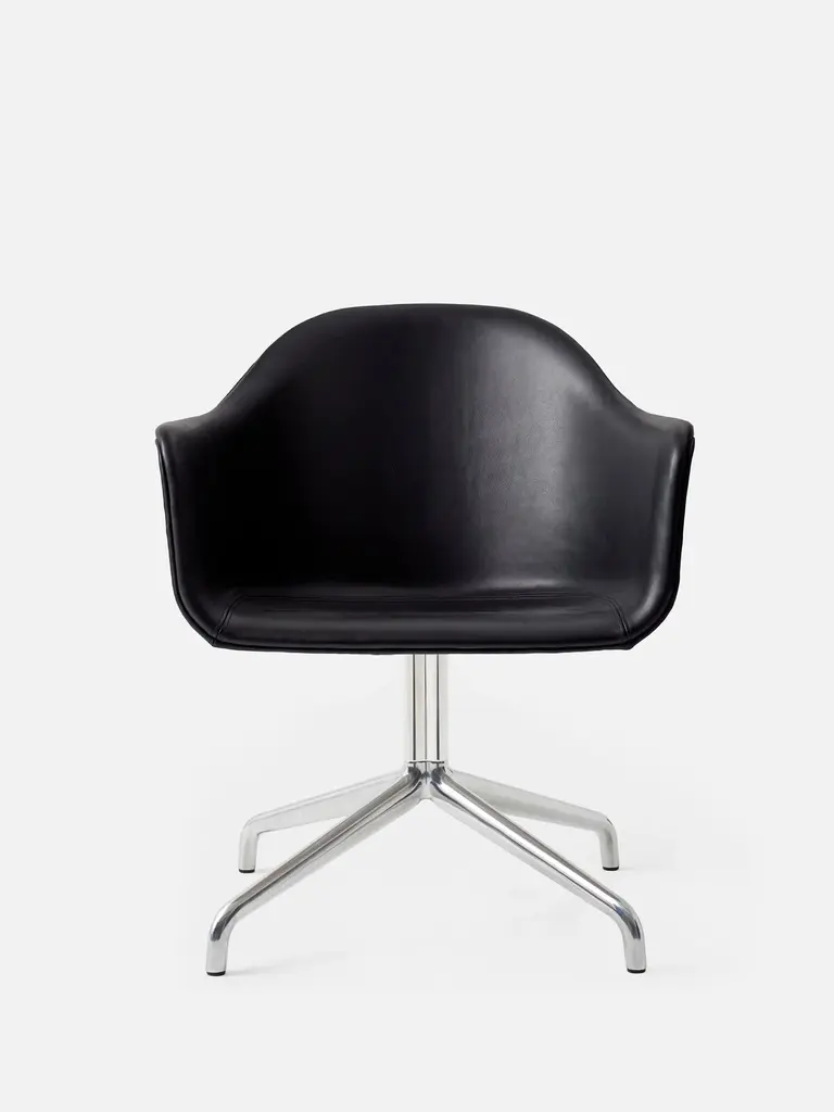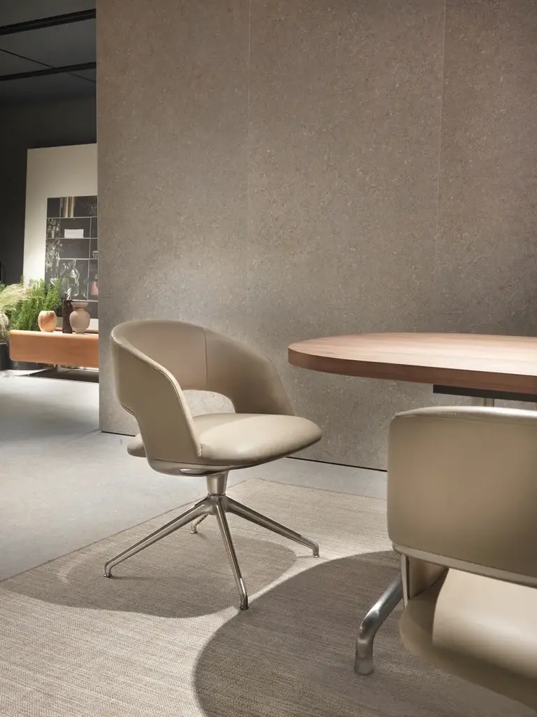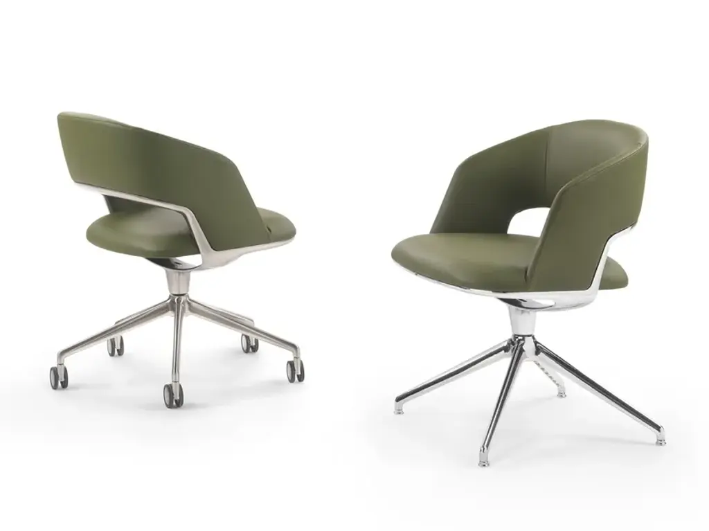 ALMA is a swivel 4 spokes-based leather small armchair.FeaturesStructure: armless, made of metal and molded polyurethane, covered in protective fabric upholsterySwivel base with 4 spokes: return swivel mechanism; made of die-cast aluminum in various finishes. Turned aluminum feet. Ground support on thermoplastic tipsUpholstery: non-removable, available in both fabric and leather versionsAlma is a collection of chairs/armchairs with a strong personality, balanced proportions, and enveloping lines, which immediately inspire a sense of comfort combined with great formal elegance.Agile and lightweight, thanks to its swivel aluminum base, it adapts to all dining tables from the brand but also meets the growing demand for creating 'home office' spaces within homes, or in work environments such as executive offices, meeting rooms, or prestigious conference halls. The technique of aluminum die-casting is used to create both the base and the sinuous seat and back shell, designed specifically for the piece, as well as the practical pivoting wheels that make it easy to move the armchair.This armchair is available in both fixed and swivel versions, with and without armrests.