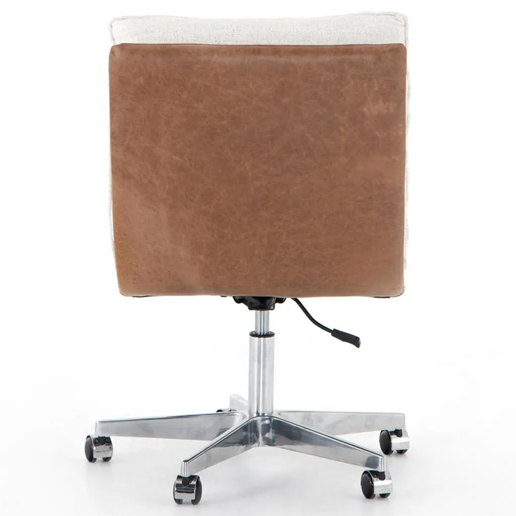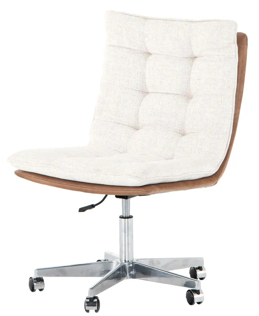 Take the design of your home office to the next level with our Amir Modern Tufted Cream Upholstered Aluminum Casters Rolling Office Side Chair. Expertly crafted from aluminum and top grain leather and upholstered in a cream linen-blend performance fabric, this designer office chair is equal parts practical, comfortable, and effortlessly stylish.