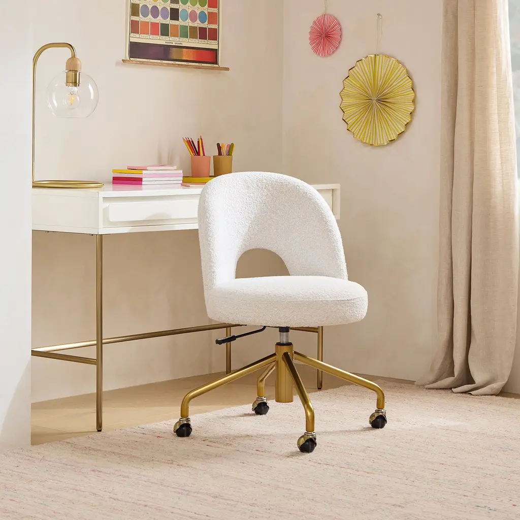 A cutout back and round silhouette for a modern look. Smoothly glides on four caster wheels. Durably built with a plush seat.