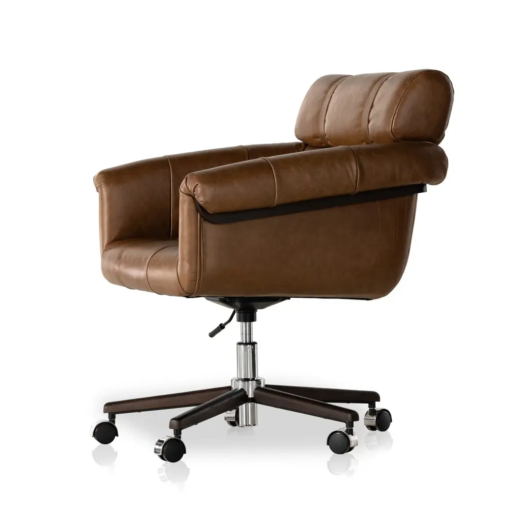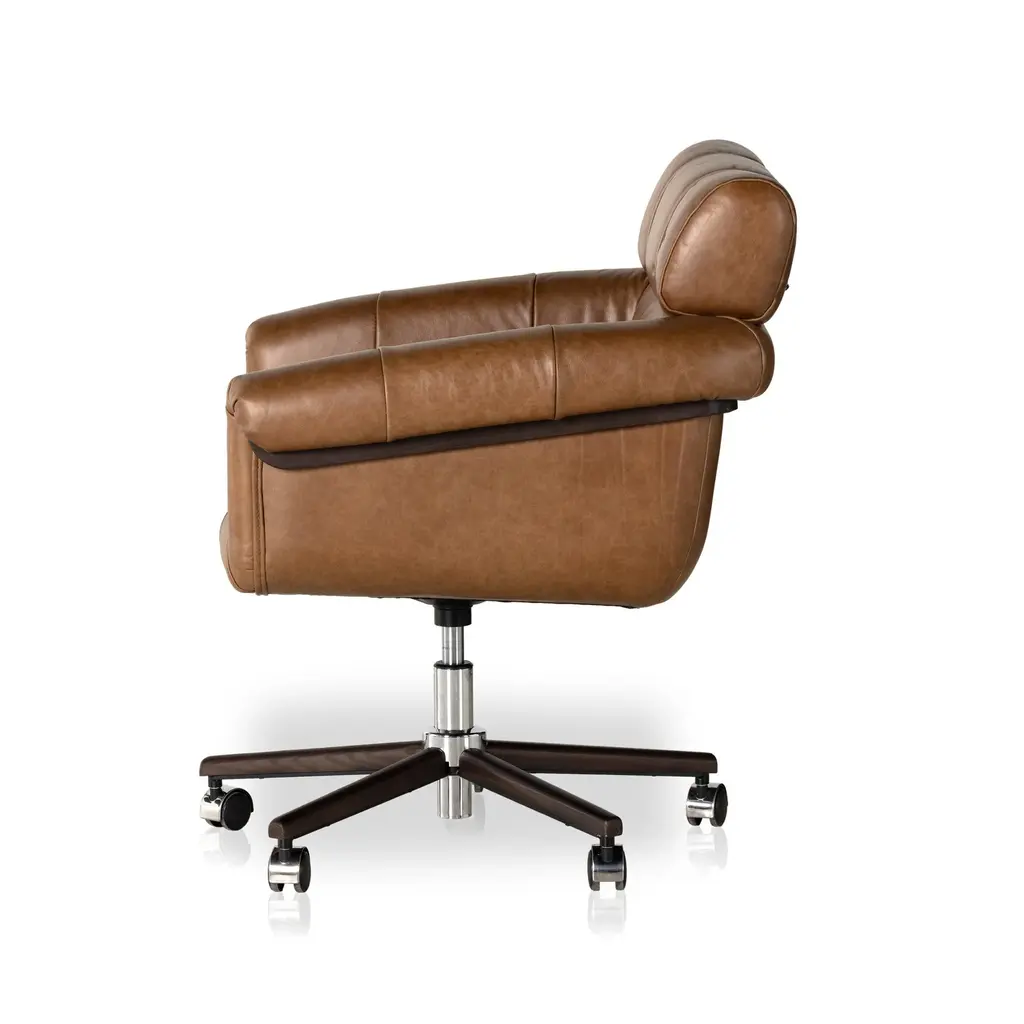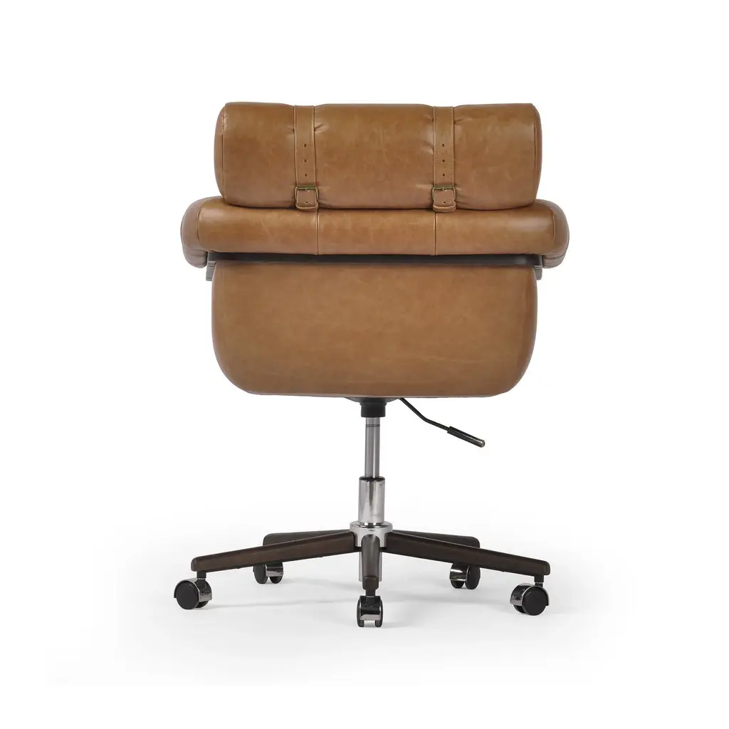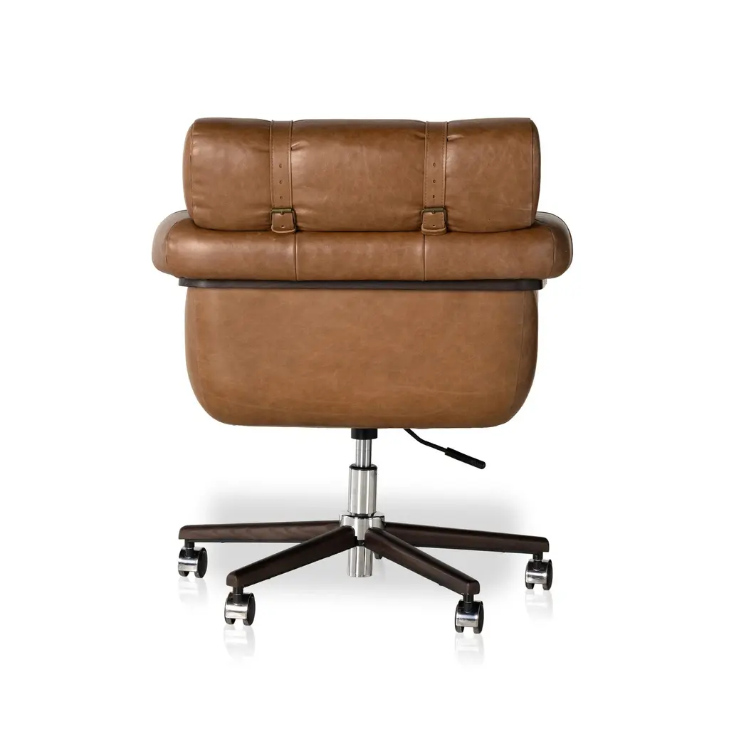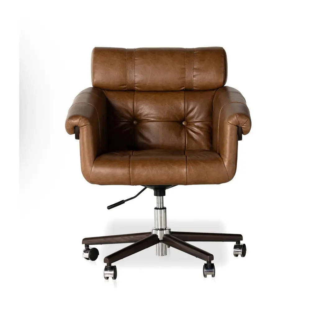 A detail-driven take on a new favorite desk chair. Made from top-grain leather in a warm butterscotch, a fully tufted seat means maximum comfort, while casters and seat height adjustability make for ease in the modern office. Ships In 10-14 Business Days Tufted seat Adjustable height 360 degree swivel base Top grain leather This image is for illustrative purposes only. The colors shown are accurate within the constraints of lighting, photography, and the color accuracy of your screen.