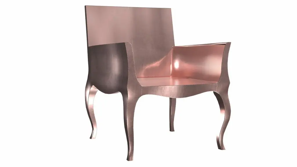 Introducing the Art Deco Chairs, a stunning Art Deco Chairs set designed by the renowned Paul Mathieu for Stephanie Odegard. This elegant Art Deco Chair duo boasts a unique curved profile that exudes a sophisticated and timeless charm, making it the perfect addition to any modern or classic interior.Crafted with utmost care and attention to detail, these Art Deco Chairs are made to order and are available in twelve metal clad finishes, ensuring that you can choose the perfect one to match your individual style and taste. The use of high-quality materials and expert craftsmanship ensure that each Art Deco Chair is not only beautiful but also a true piece of art.The curved legs and side arms of this Art Deco Chair are hand carved from solid pieces of teak. Pattern makers trace and cut complex forms that will cover the chair in a skin of copper, white bronze, brass or antiqued white bronze The metal finishes will tarnish over time. Regular non-abrasive household metal polishes can be used to restore the original luster.Overall, if you're looking for a piece of furniture that combines luxury, comfort, and style, then the Art Deco Chairs is an excellent choice. With its distinctive curved profile and multiple finish options, this Chair set is sure to elevate the look of any room it is placed in, and be a beloved addition to your home for years to come.The images shown in this listing are shot in different lighting conditions and/or are 3D illustrations. We encourage our customers to please request a sample or a full sample set of 12 finishes so that they can experience the finish first hand. Art Deco Desk Chair in Smooth Copper by Paul Mathieu for S. OdegardSize- 26"x 27"x 33"HMaterials - Copper, Metal sheet, Teak, Wood, MetalTechniques: Hand-Crafted, Hand-Carved, Metal Work, Wood Work, Metal Wrapping, PolishedPlease note that moisture in air, sudden change in temperature and natural movement of wood over time causes the metal to wrinkle or bubble up. We use well seasoned, reclaimed teak and high quality marine grade MDF (wherever technically possible) to avoid and delay the mentioned changes. However a perfect stability of metal cannot be guaranteed. Please note that our smooth finish metal clad pieces will have some unavoidable tool marks. This is proof that everything is done by hand. The smooth finish will not come out like a machine made perfect surface and the master artisan will do their best to make it look as good/clean/stable/perfect as he possibly can.The antique white bronze finish is hand done by using an acidic chemical over the white bronze finish to recreate a natural patination. Like with the natural patination of silver, copper, or brass, the final result and color uniformity of the patina cannot be guaranteed. The goal of this finish is to achieve rainbow-like shades with dull, shiny, cloudy, and streaky patches to give an illusion of antiquing. Please note:None of our metal clad pieces are treated with a protective “finish” thus enabling the items to age naturally over time. We will of course polish them well before we pack them. a) Copper oxidizes faster than the other metals. In six to twelve months it will most likely lose its shine and will gradually turn to different shades of brown and/or green/blue. This aging process and its effect is referred to as verdigris. After a year the piece should not change much more. Copper does not rust, but does require periodic cleaning in order to retain its original shine if that the preferred option. ('BRASSO' or any known copper polish can be used to polish copper).b) Brass retains its shine for far longer than others, but will tarnish if not cleaned on occasion. ('BRASSO' is made to polish brass).c) White bronze, has the least tendency to show age or tarnish. If kept in a controlled climate, this metal will hold its shine for years. It can be cleaned with a cleanser and polished with a cloth. d) The antiqued white bronze finish will react with the natural elements the fastest in the beginning but it too will stop reacting and will settle down in a stable state like copper after 6-12 months. Since it is already antiqued and looked like it is tarnished, as described in an earlier message, this fast reaction will not change the over all look. In that way this surface is most forgiving. The images shown in this listing are shot in different lighting conditions and/or are 3D illustrations. We encourage our customers to please request a sample or a full sample set of 12 finishes so that they can experience the finish first hand.