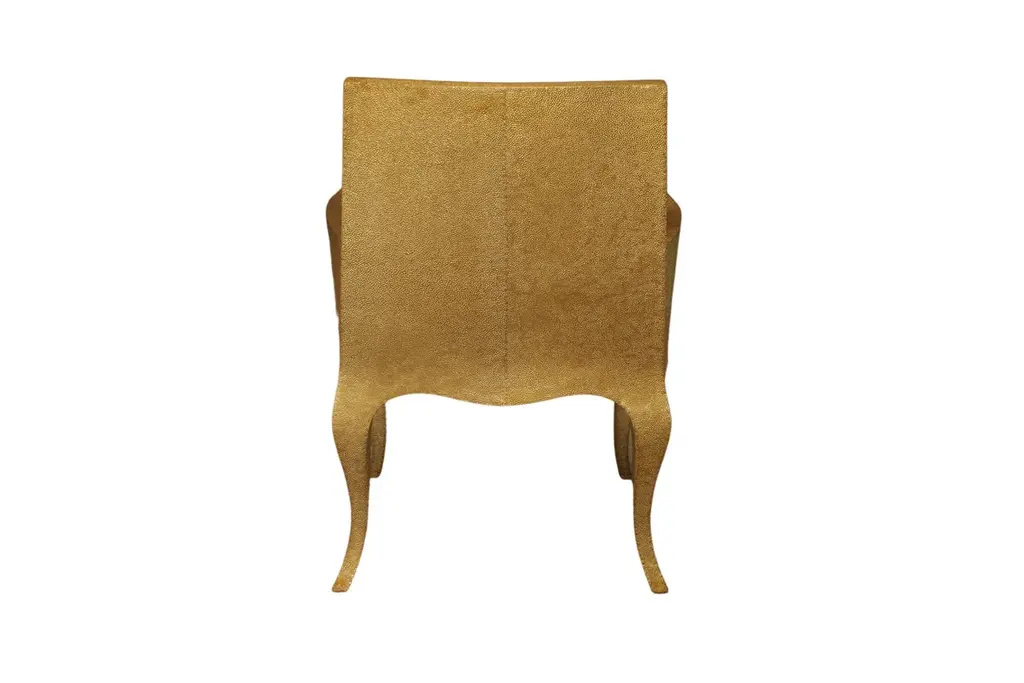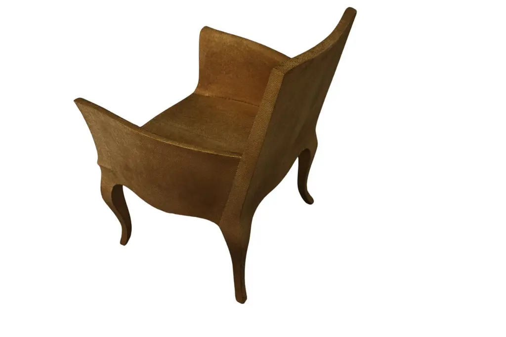 Introducing the Art Deco Chairs, a stunning Art Deco Chairs set designed by the renowned Paul Mathieu for Stephanie Odegard. This elegant Art Deco Chair duo boasts a unique curved profile that exudes a sophisticated and timeless charm, making it the perfect addition to any modern or classic interior.Crafted with utmost care and attention to detail, these Art Deco Chairs are made to order and are available in twelve metal clad finishes, ensuring that you can choose the perfect one to match your individual style and taste. The use of high-quality materials and expert craftsmanship ensure that each Art Deco Chair is not only beautiful but also a true piece of art.The curved legs and side arms of this Art Deco Chair are hand carved from solid pieces of teak. Pattern makers trace and cut complex forms that will cover the chair in a skin of copper, white bronze, brass or antiqued white bronze The metal finishes will tarnish over time. Regular non-abrasive household metal polishes can be used to restore the original luster.Overall, if you're looking for a piece of furniture that combines luxury, comfort, and style, then the Art Deco Chairs is an excellent choice. With its distinctive curved profile and multiple finish options, this Chair set is sure to elevate the look of any room it is placed in, and be a beloved addition to your home for years to come.The images shown in this listing are shot in different lighting conditions and/or are 3D illustrations. We encourage our customers to please request a sample or a full sample set of 12 finishes so that they can experience the finish first hand. Art Deco Desk Chair Mid Hammered in Brass by Paul MathieuSize- 26"x 27"x 33"HMaterials - Brass, Metal sheet, Teak, Wood, MetalTechniques: Hand-Crafted, Hand-Carved, Metal Work, Wood Work, Metal Wrapping, PolishedPlease note that moisture in air, sudden change in temperature and natural movement of wood over time causes the metal to wrinkle or bubble up. We use well seasoned, reclaimed teak and high quality marine grade MDF (wherever technically possible) to avoid and delay the mentioned changes. However a perfect stability of metal cannot be guaranteed. Please note that our smooth finish metal clad pieces will have some unavoidable tool marks. This is proof that everything is done by hand. The smooth finish will not come out like a machine made perfect surface and the master artisan will do their best to make it look as good/clean/stable/perfect as he possibly can.The antique white bronze finish is hand done by using an acidic chemical over the white bronze finish to recreate a natural patination. Like with the natural patination of silver, copper, or brass, the final result and color uniformity of the patina cannot be guaranteed. The goal of this finish is to achieve rainbow-like shades with dull, shiny, cloudy, and streaky patches to give an illusion of antiquing. Please note:None of our metal clad pieces are treated with a protective “finish” thus enabling the items to age naturally over time. We will of course polish them well before we pack them. a) Copper oxidizes faster than the other metals. In six to twelve months it will most likely lose its shine and will gradually turn to different shades of brown and/or green/blue. This aging process and its effect is referred to as verdigris. After a year the piece should not change much more. Copper does not rust, but does require periodic cleaning in order to retain its original shine if that the preferred option. ('BRASSO' or any known copper polish can be used to polish copper).b) Brass retains its shine for far longer than others, but will tarnish if not cleaned on occasion. ('BRASSO' is made to polish brass).c) White bronze, has the least tendency to show age or tarnish. If kept in a controlled climate, this metal will hold its shine for years. It can be cleaned with a cleanser and polished with a cloth. d) The antiqued white bronze finish will react with the natural elements the fastest in the beginning but it too will stop reacting and will settle down in a stable state like copper after 6-12 months. Since it is already antiqued and looked like it is tarnished, as described in an earlier message, this fast reaction will not change the over all look. In that way this surface is most forgiving. The images shown in this listing are shot in different lighting conditions and/or are 3D illustrations. We encourage our customers to please request a sample or a full sample set of 12 finishes so that they can experience the finish first hand.