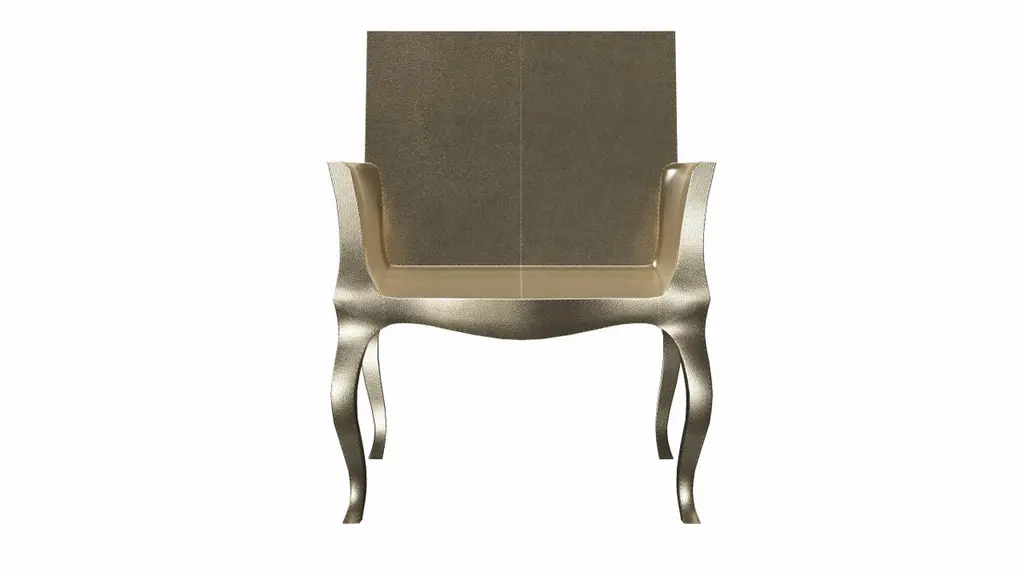 Introducing the Art Deco Chairs, a stunning Art Deco Chairs set designed by the renowned Paul Mathieu for Stephanie Odegard. This elegant Art Deco Chair duo boasts a unique curved profile that exudes a sophisticated and timeless charm, making it the perfect addition to any modern or classic interior.Crafted with utmost care and attention to detail, these Art Deco Chairs are made to order and are available in twelve metal clad finishes, ensuring that you can choose the perfect one to match your individual style and taste. The use of high-quality materials and expert craftsmanship ensure that each Art Deco Chair is not only beautiful but also a true piece of art.The curved legs and side arms of this Art Deco Chair are hand carved from solid pieces of teak. Pattern makers trace and cut complex forms that will cover the chair in a skin of copper, white bronze, brass or antiqued white bronze The metal finishes will tarnish over time. Regular non-abrasive household metal polishes can be used to restore the original luster.Overall, if you're looking for a piece of furniture that combines luxury, comfort, and style, then the Art Deco Chairs is an excellent choice. With its distinctive curved profile and multiple finish options, this Chair set is sure to elevate the look of any room it is placed in, and be a beloved addition to your home for years to come.The images shown in this listing are shot in different lighting conditions and/or are 3D illustrations. We encourage our customers to please request a sample or a full sample set of 12 finishes so that they can experience the finish first hand. Art Deco Office Chair Fine Hammered in Brass by Paul MathieuSize- 26"x 27"x 33"HMaterials - Brass, Metal sheet, Teak, Wood, MetalTechniques: Hand-Crafted, Hand-Carved, Metal Work, Wood Work, Metal Wrapping, PolishedPlease note that moisture in air, sudden change in temperature and natural movement of wood over time causes the metal to wrinkle or bubble up. We use well seasoned, reclaimed teak and high quality marine grade MDF (wherever technically possible) to avoid and delay the mentioned changes. However a perfect stability of metal cannot be guaranteed. Please note that our smooth finish metal clad pieces will have some unavoidable tool marks. This is proof that everything is done by hand. The smooth finish will not come out like a machine made perfect surface and the master artisan will do their best to make it look as good/clean/stable/perfect as he possibly can.The antique white bronze finish is hand done by using an acidic chemical over the white bronze finish to recreate a natural patination. Like with the natural patination of silver, copper, or brass, the final result and color uniformity of the patina cannot be guaranteed. The goal of this finish is to achieve rainbow-like shades with dull, shiny, cloudy, and streaky patches to give an illusion of antiquing. Please note:None of our metal clad pieces are treated with a protective “finish” thus enabling the items to age naturally over time. We will of course polish them well before we pack them. a) Copper oxidizes faster than the other metals. In six to twelve months it will most likely lose its shine and will gradually turn to different shades of brown and/or green/blue. This aging process and its effect is referred to as verdigris. After a year the piece should not change much more. Copper does not rust, but does require periodic cleaning in order to retain its original shine if that the preferred option. ('BRASSO' or any known copper polish can be used to polish copper).b) Brass retains its shine for far longer than others, but will tarnish if not cleaned on occasion. ('BRASSO' is made to polish brass).c) White bronze, has the least tendency to show age or tarnish. If kept in a controlled climate, this metal will hold its shine for years. It can be cleaned with a cleanser and polished with a cloth. d) The antiqued white bronze finish will react with the natural elements the fastest in the beginning but it too will stop reacting and will settle down in a stable state like copper after 6-12 months. Since it is already antiqued and looked like it is tarnished, as described in an earlier message, this fast reaction will not change the over all look. In that way this surface is most forgiving. The images shown in this listing are shot in different lighting conditions and/or are 3D illustrations. We encourage our customers to please request a sample or a full sample set of 12 finishes so that they can experience the finish first hand.