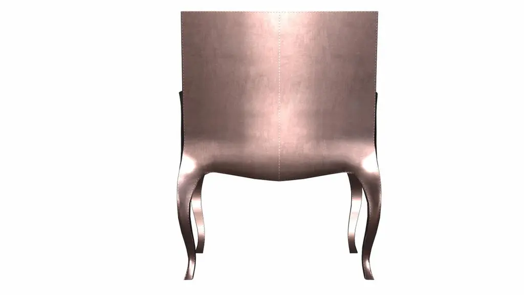 Introducing the Art Deco Chairs, a stunning Art Deco Chairs set designed by the renowned Paul Mathieu for Stephanie Odegard. This elegant Art Deco Chair duo boasts a unique curved profile that exudes a sophisticated and timeless charm, making it the perfect addition to any modern or classic interior.Crafted with utmost care and attention to detail, these Art Deco Chairs are made to order and are available in twelve metal clad finishes, ensuring that you can choose the perfect one to match your individual style and taste. The use of high-quality materials and expert craftsmanship ensure that each Art Deco Chair is not only beautiful but also a true piece of art.The curved legs and side arms of this Art Deco Chair are hand carved from solid pieces of teak. Pattern makers trace and cut complex forms that will cover the chair in a skin of copper, white bronze, brass or antiqued white bronze The metal finishes will tarnish over time. Regular non-abrasive household metal polishes can be used to restore the original luster.Overall, if you're looking for a piece of furniture that combines luxury, comfort, and style, then the Art Deco Chairs is an excellent choice. With its distinctive curved profile and multiple finish options, this Chair set is sure to elevate the look of any room it is placed in, and be a beloved addition to your home for years to come.The images shown in this listing are shot in different lighting conditions and/or are 3D illustrations. We encourage our customers to please request a sample or a full sample set of 12 finishes so that they can experience the finish first hand. Art Deco Office Chair in Smooth Copper by Paul Mathieu for S. OdegardSize- 26"x 27"x 33"HMaterials - Copper, Metal sheet, Teak, Wood, MetalTechniques: Hand-Crafted, Hand-Carved, Metal Work, Wood Work, Metal Wrapping, PolishedPlease note that moisture in air, sudden change in temperature and natural movement of wood over time causes the metal to wrinkle or bubble up. We use well seasoned, reclaimed teak and high quality marine grade MDF (wherever technically possible) to avoid and delay the mentioned changes. However a perfect stability of metal cannot be guaranteed. Please note that our smooth finish metal clad pieces will have some unavoidable tool marks. This is proof that everything is done by hand. The smooth finish will not come out like a machine made perfect surface and the master artisan will do their best to make it look as good/clean/stable/perfect as he possibly can.The antique white bronze finish is hand done by using an acidic chemical over the white bronze finish to recreate a natural patination. Like with the natural patination of silver, copper, or brass, the final result and color uniformity of the patina cannot be guaranteed. The goal of this finish is to achieve rainbow-like shades with dull, shiny, cloudy, and streaky patches to give an illusion of antiquing. Please note:None of our metal clad pieces are treated with a protective “finish” thus enabling the items to age naturally over time. We will of course polish them well before we pack them. a) Copper oxidizes faster than the other metals. In six to twelve months it will most likely lose its shine and will gradually turn to different shades of brown and/or green/blue. This aging process and its effect is referred to as verdigris. After a year the piece should not change much more. Copper does not rust, but does require periodic cleaning in order to retain its original shine if that the preferred option. ('BRASSO' or any known copper polish can be used to polish copper).b) Brass retains its shine for far longer than others, but will tarnish if not cleaned on occasion. ('BRASSO' is made to polish brass).c) White bronze, has the least tendency to show age or tarnish. If kept in a controlled climate, this metal will hold its shine for years. It can be cleaned with a cleanser and polished with a cloth. d) The antiqued white bronze finish will react with the natural elements the fastest in the beginning but it too will stop reacting and will settle down in a stable state like copper after 6-12 months. Since it is already antiqued and looked like it is tarnished, as described in an earlier message, this fast reaction will not change the over all look. In that way this surface is most forgiving. The images shown in this listing are shot in different lighting conditions and/or are 3D illustrations. We encourage our customers to please request a sample or a full sample set of 12 finishes so that they can experience the finish first hand.